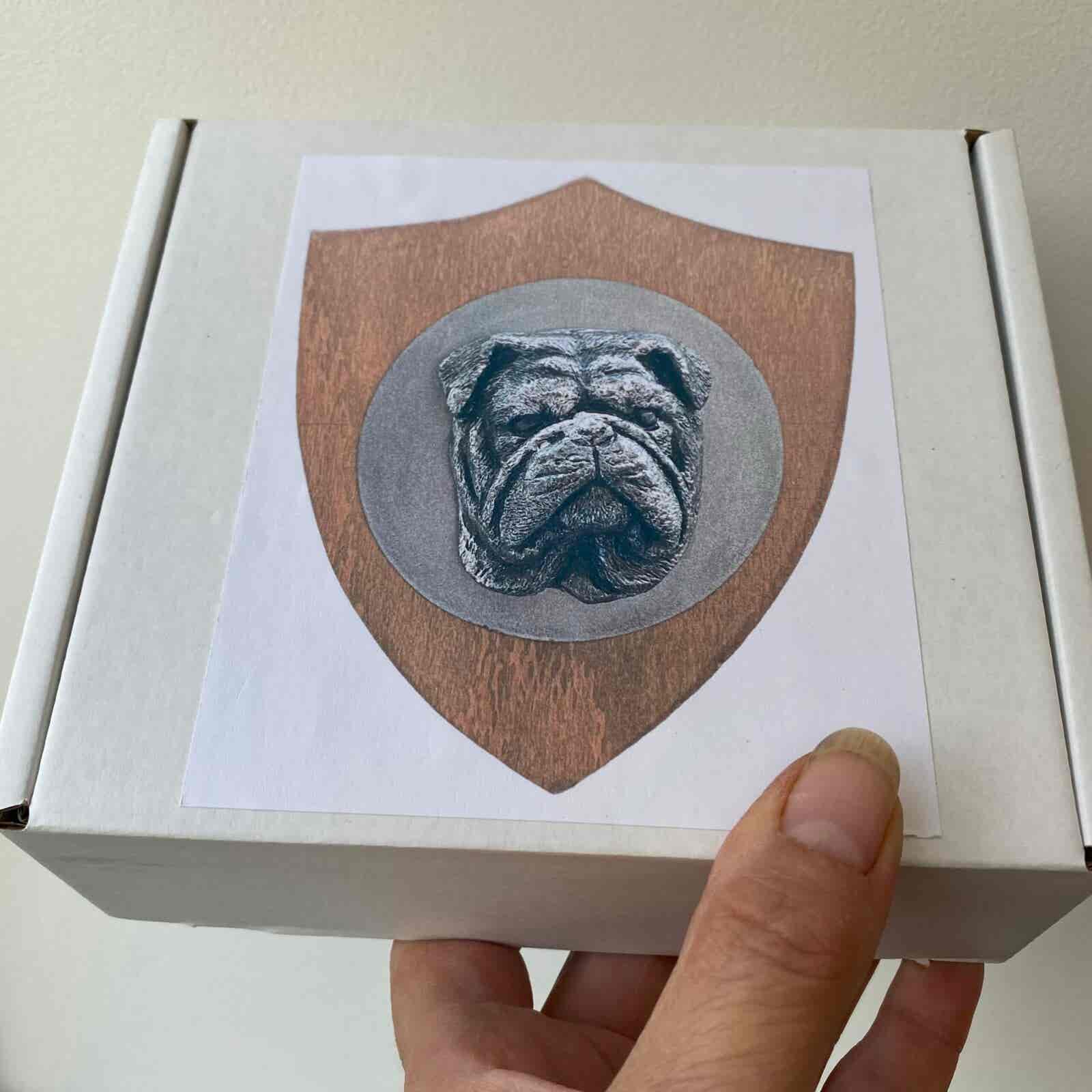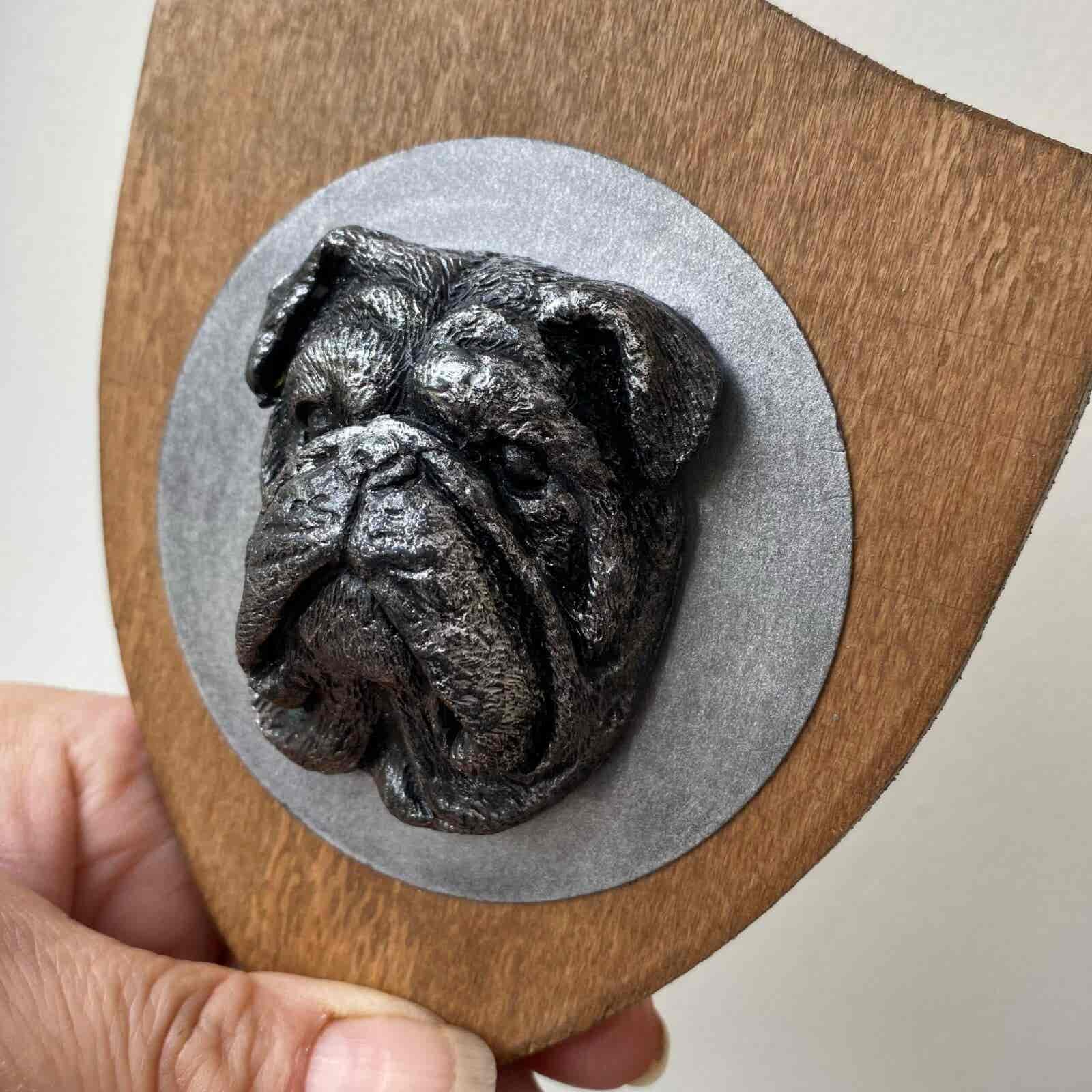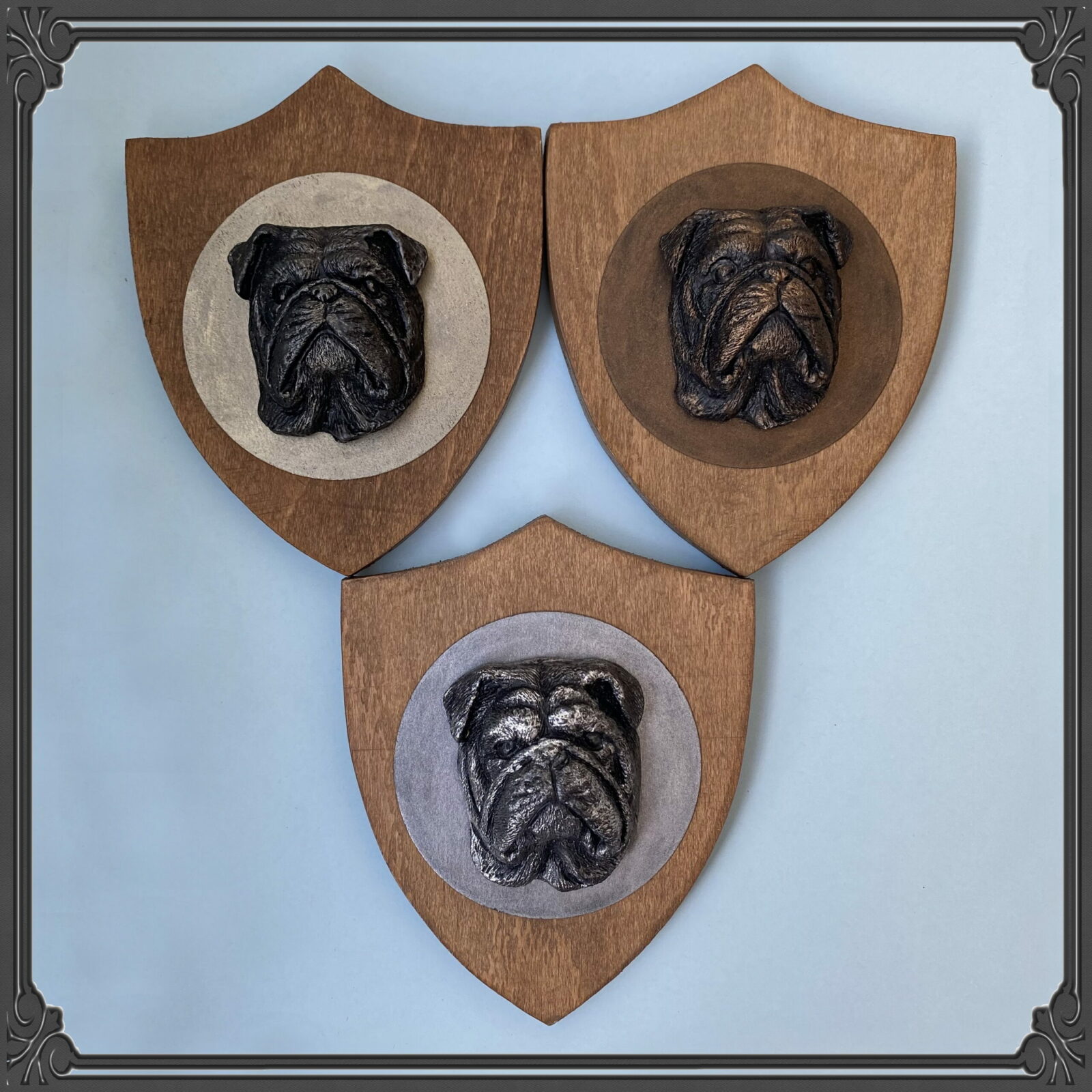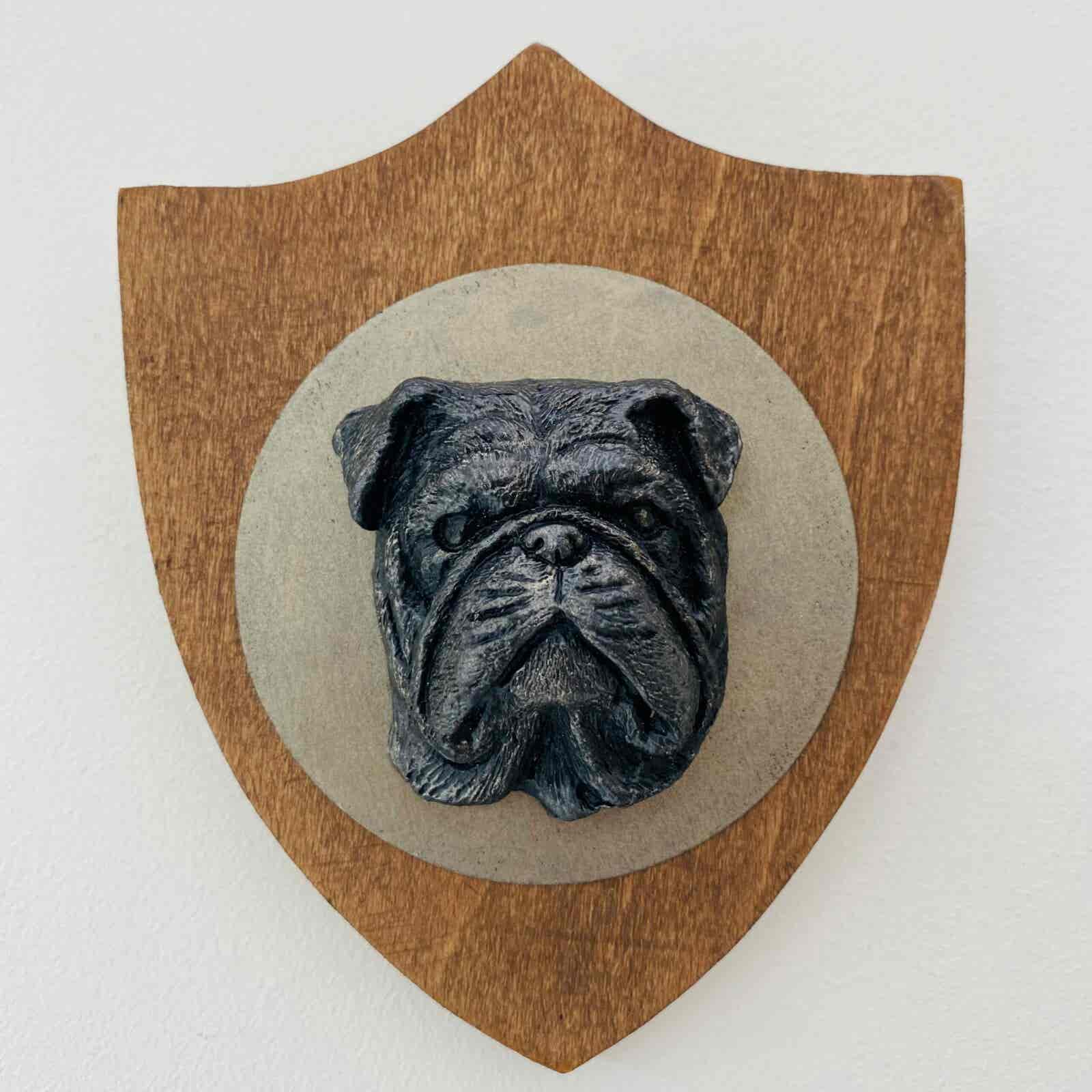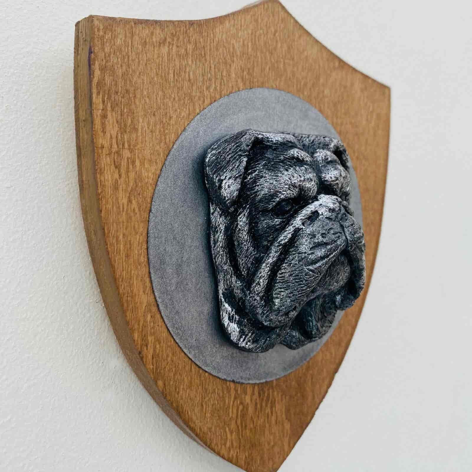 The clay Bulldog head has been hand casted in a shaped mold, painted with black acrylic paint, then gilded with either a bronze, gold or silver gilding cream. The head sits on a gilded circle in the centre of the shield. A sawtooth hanger has been put on the back. Each head comes in a presentation box.
