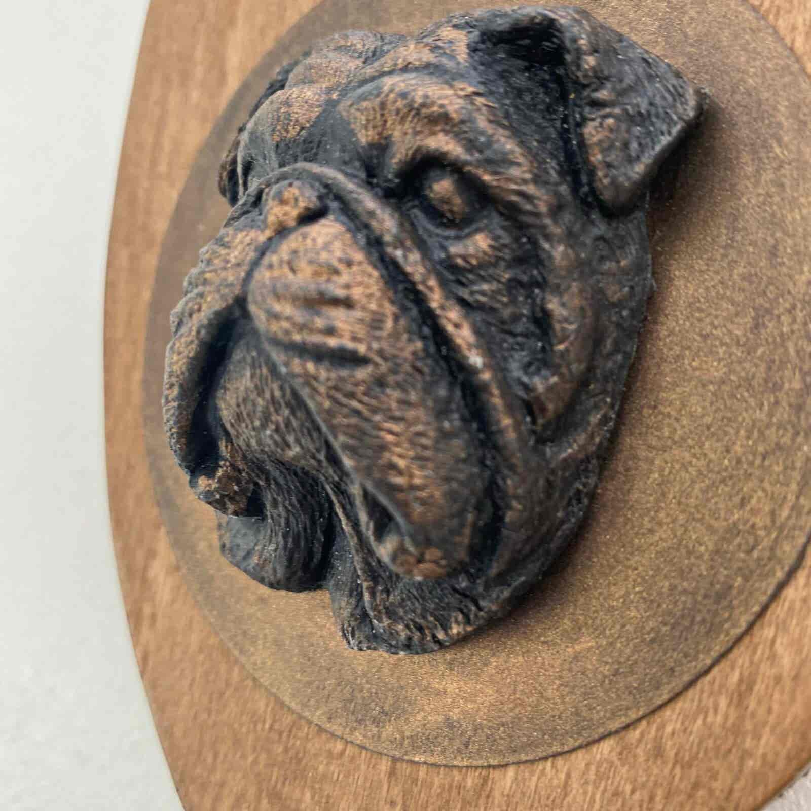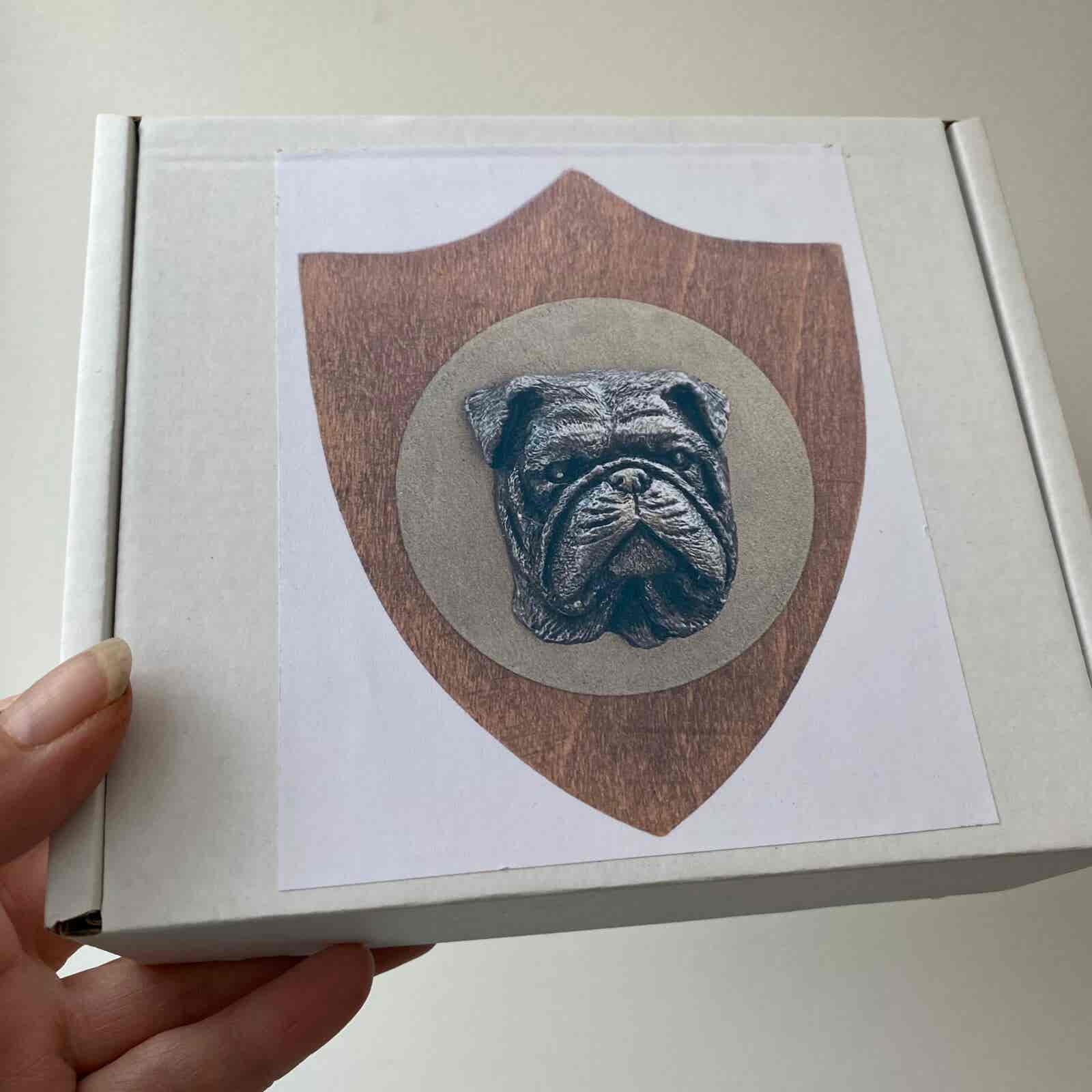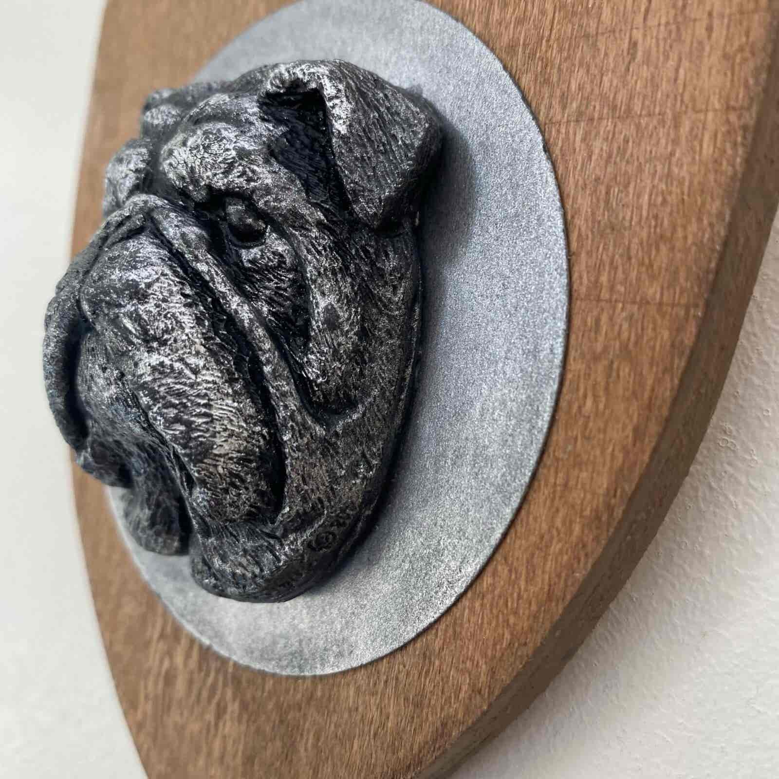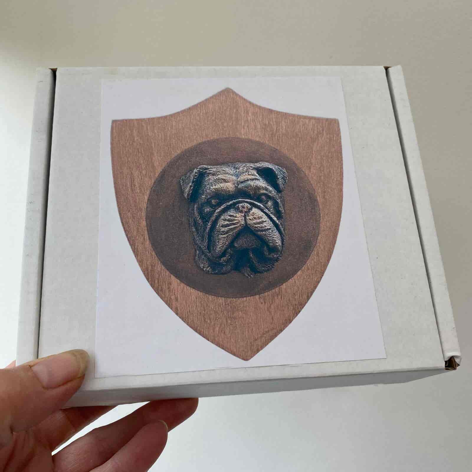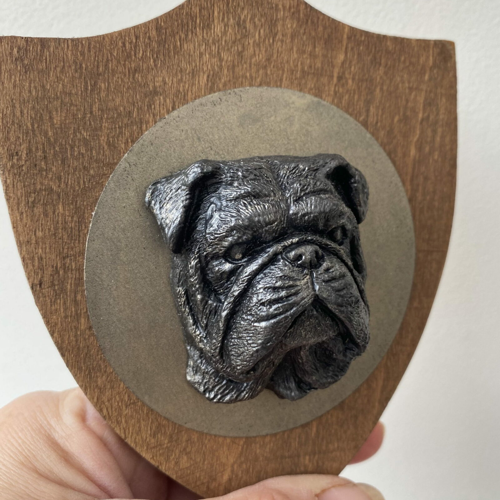 The clay Bulldog head has been hand casted in a shaped mold, painted with black acrylic paint, then gilded with either a bronze, gold or silver gilding cream. The head sits on a gilded circle in the centre of the shield. A sawtooth hanger has been put on the back. Each head comes in a presentation box.