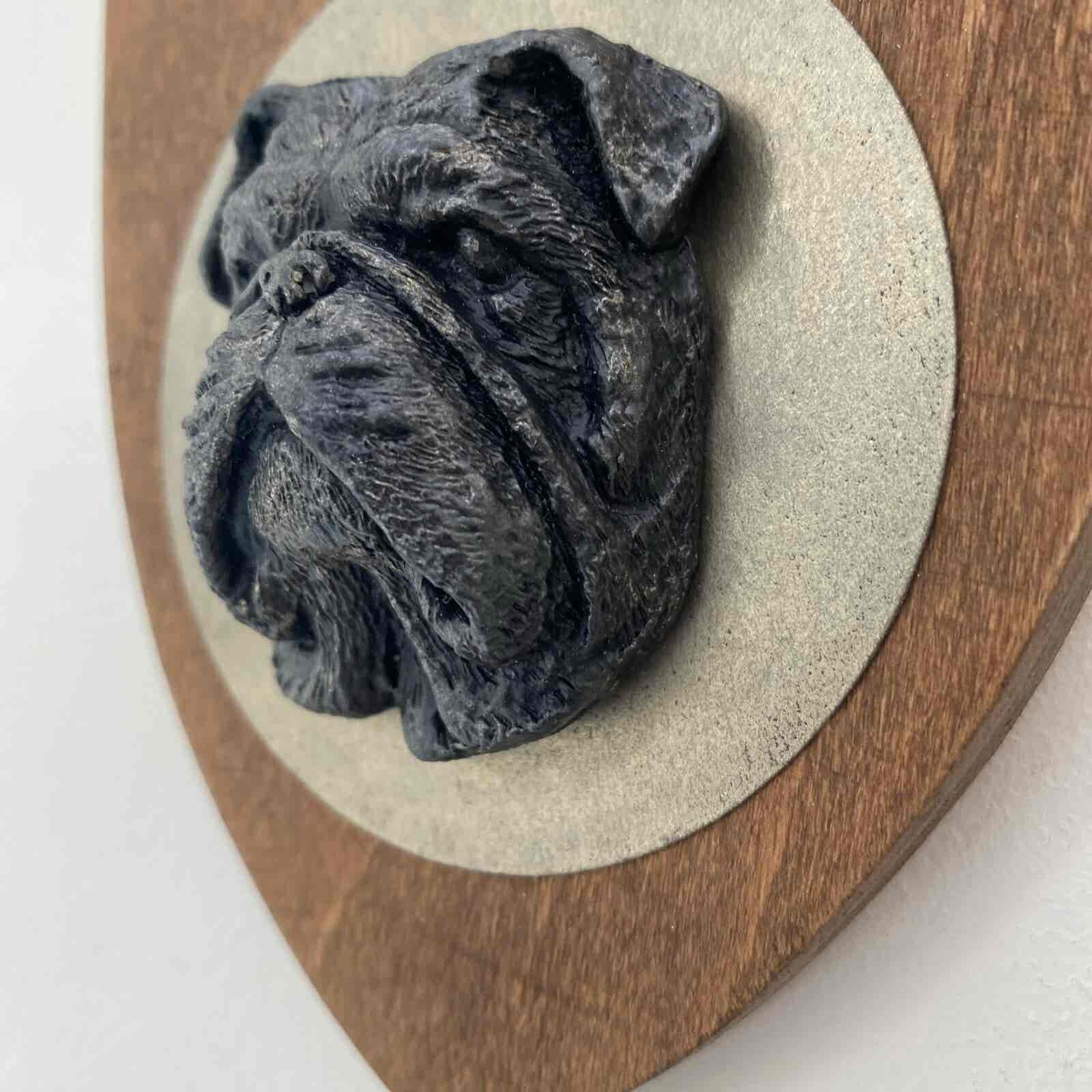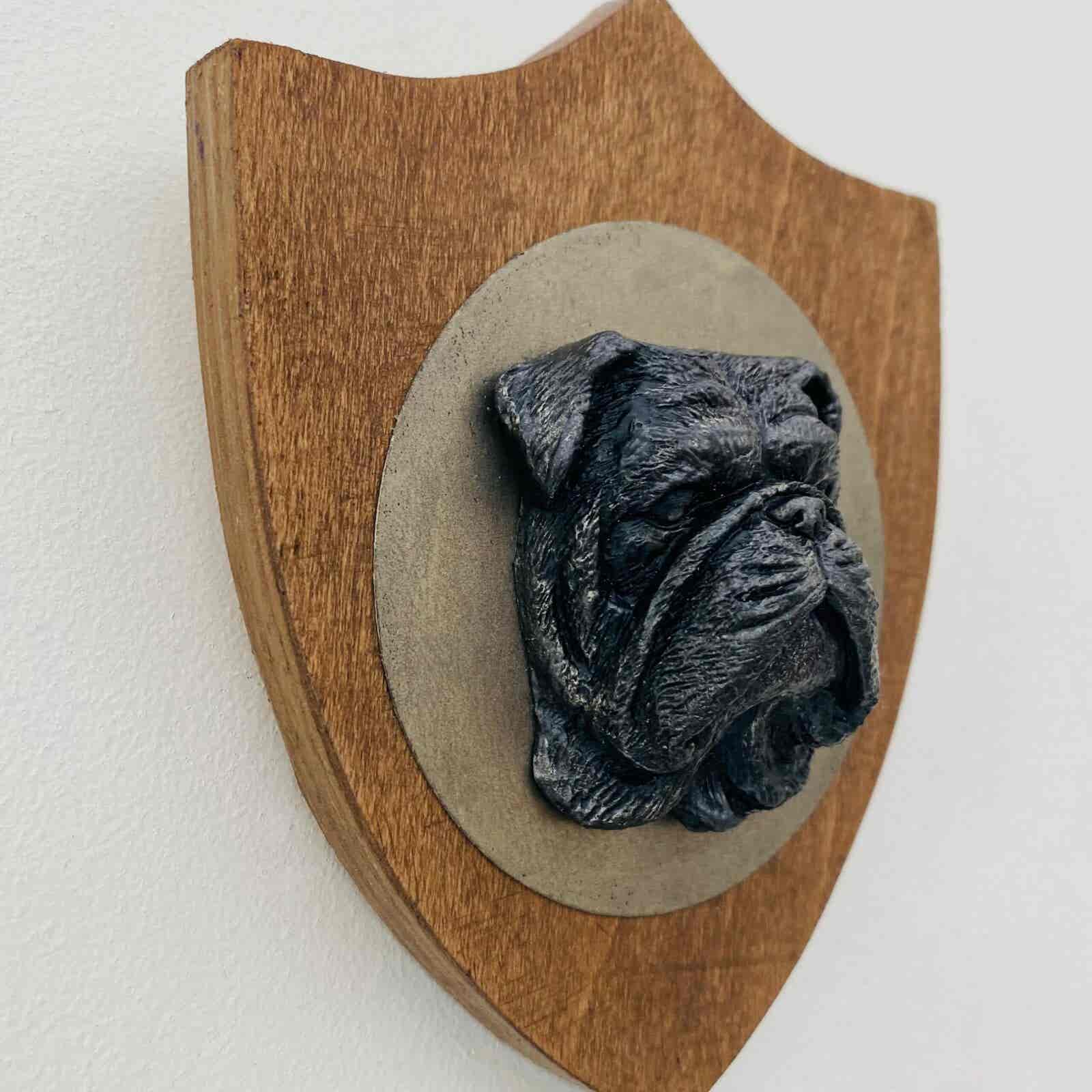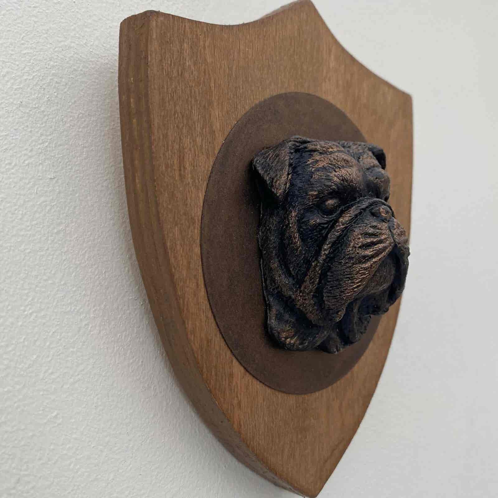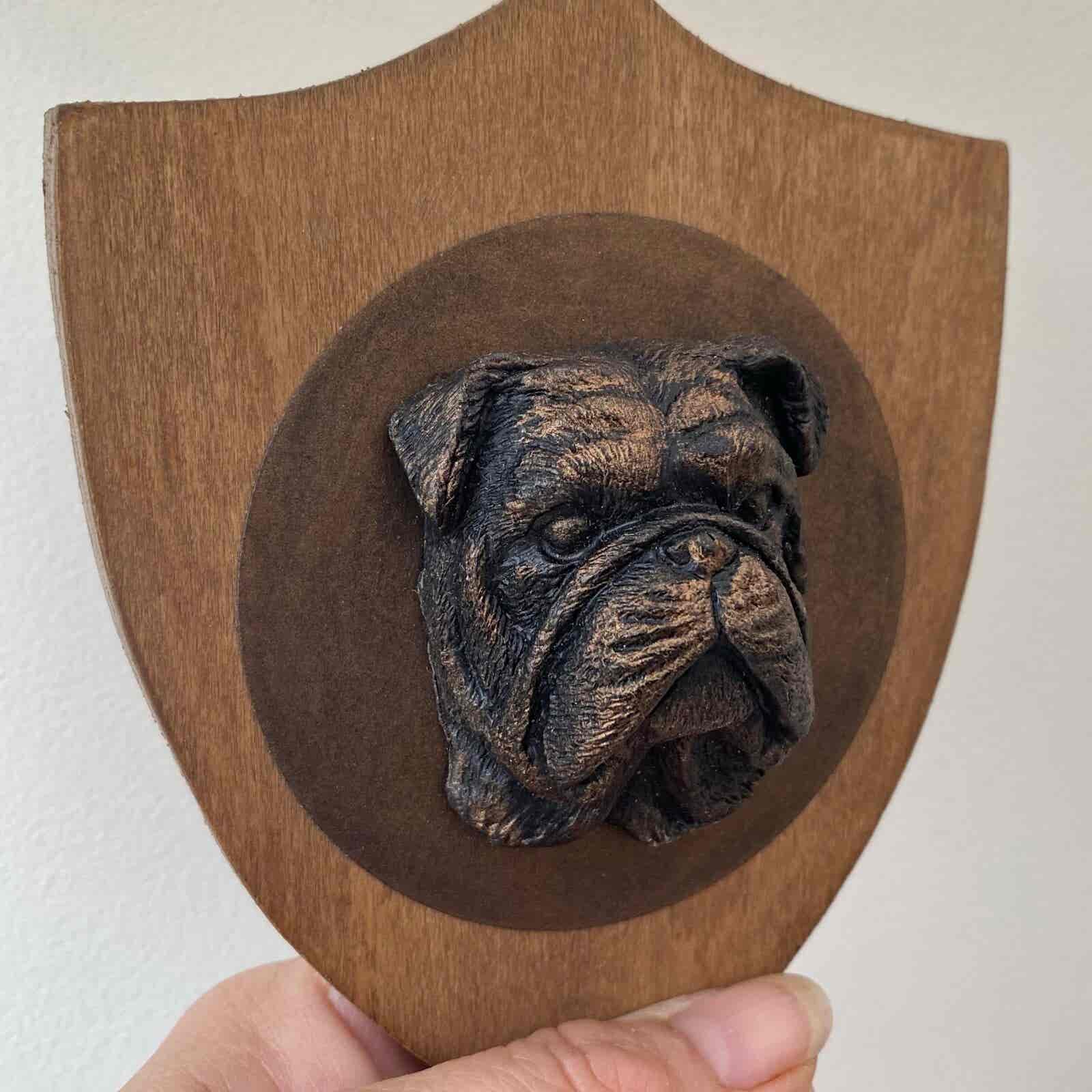 This is a beautiful original design handmade wooden hanging shield with a 3D Bulldog head.