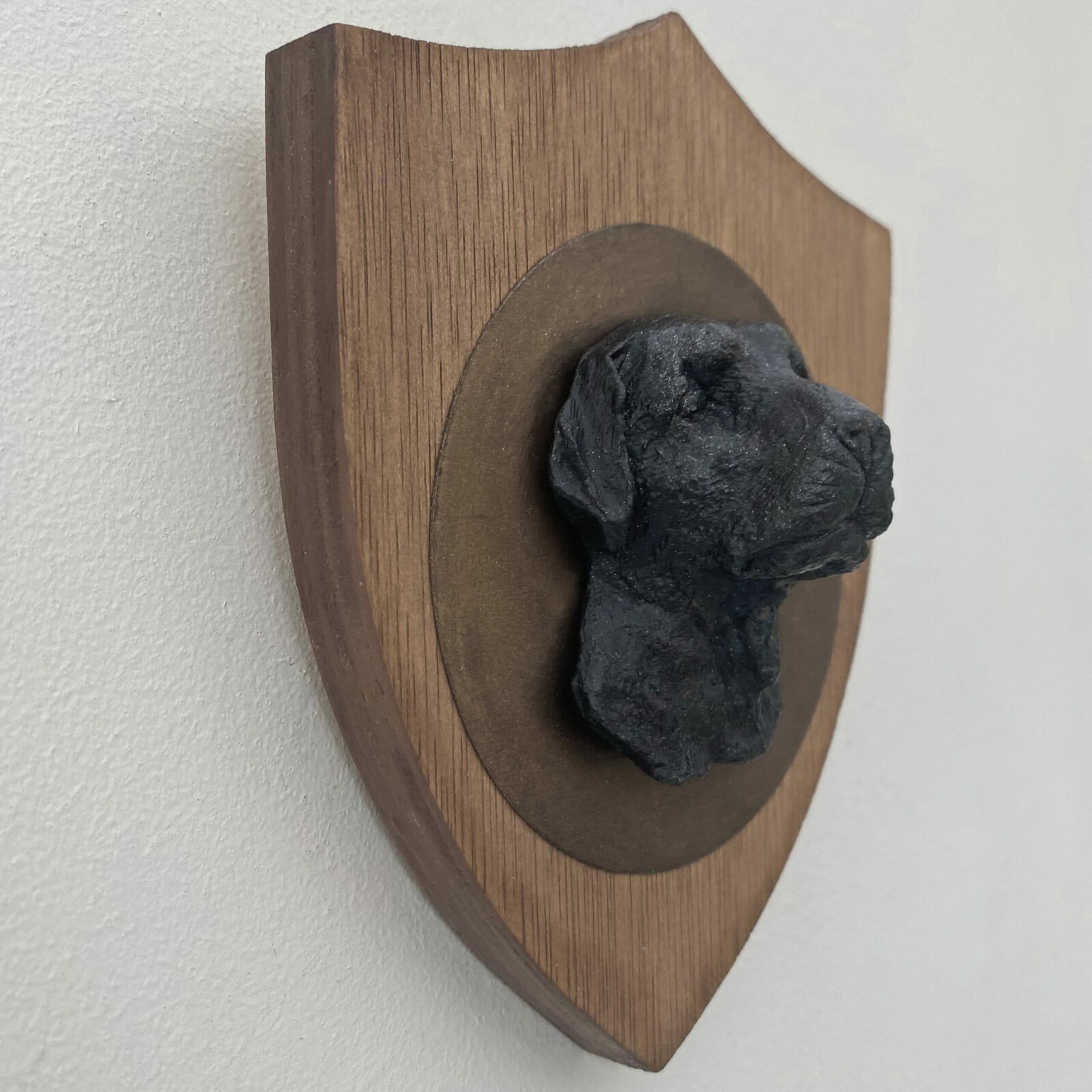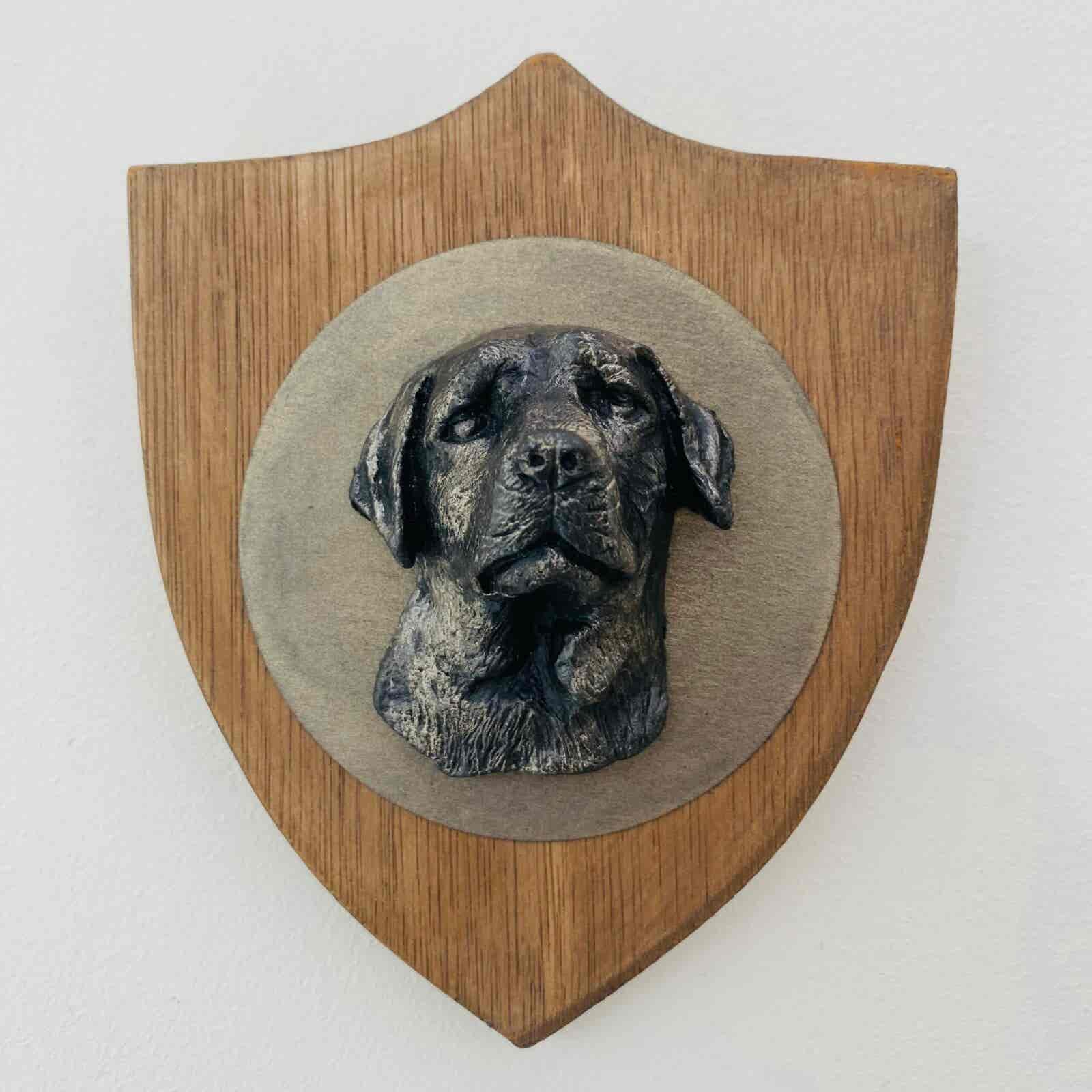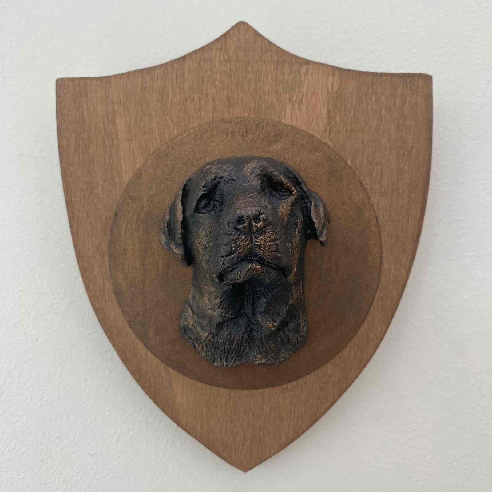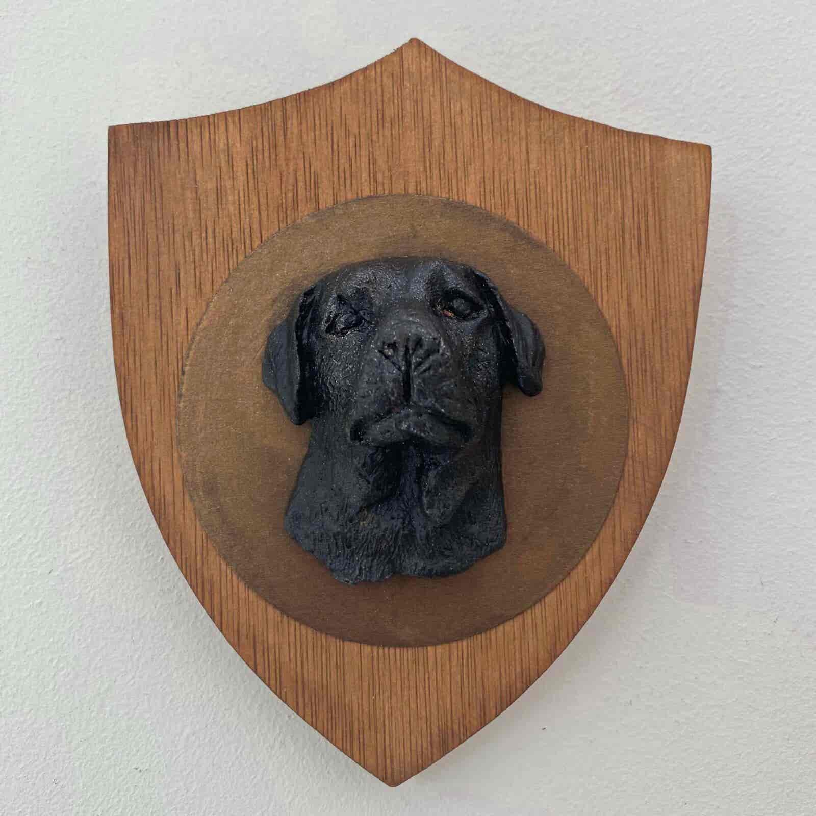 The clay Labrador head has been hand casted in a shaped mold, painted with black acrylic paint, then gilded with either a bronze, gold or silver gilding cream. The head sits on a gilded circle in the centre of the shield. A sawtooth hanger has been put on the back. Each head comes in a presentation box.
