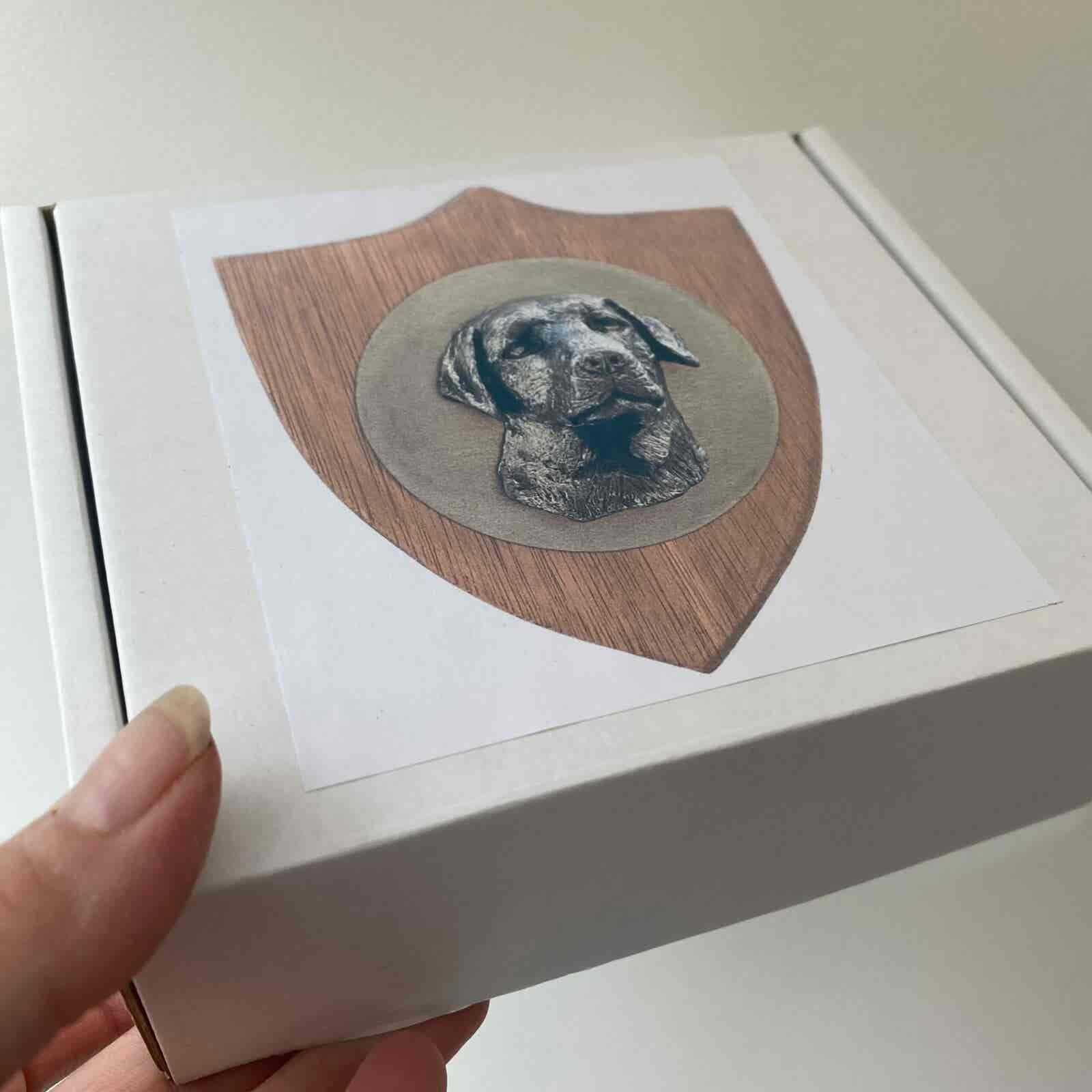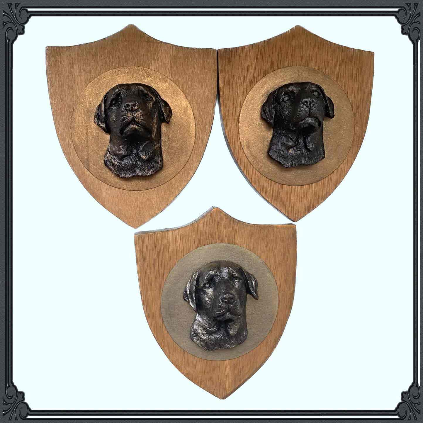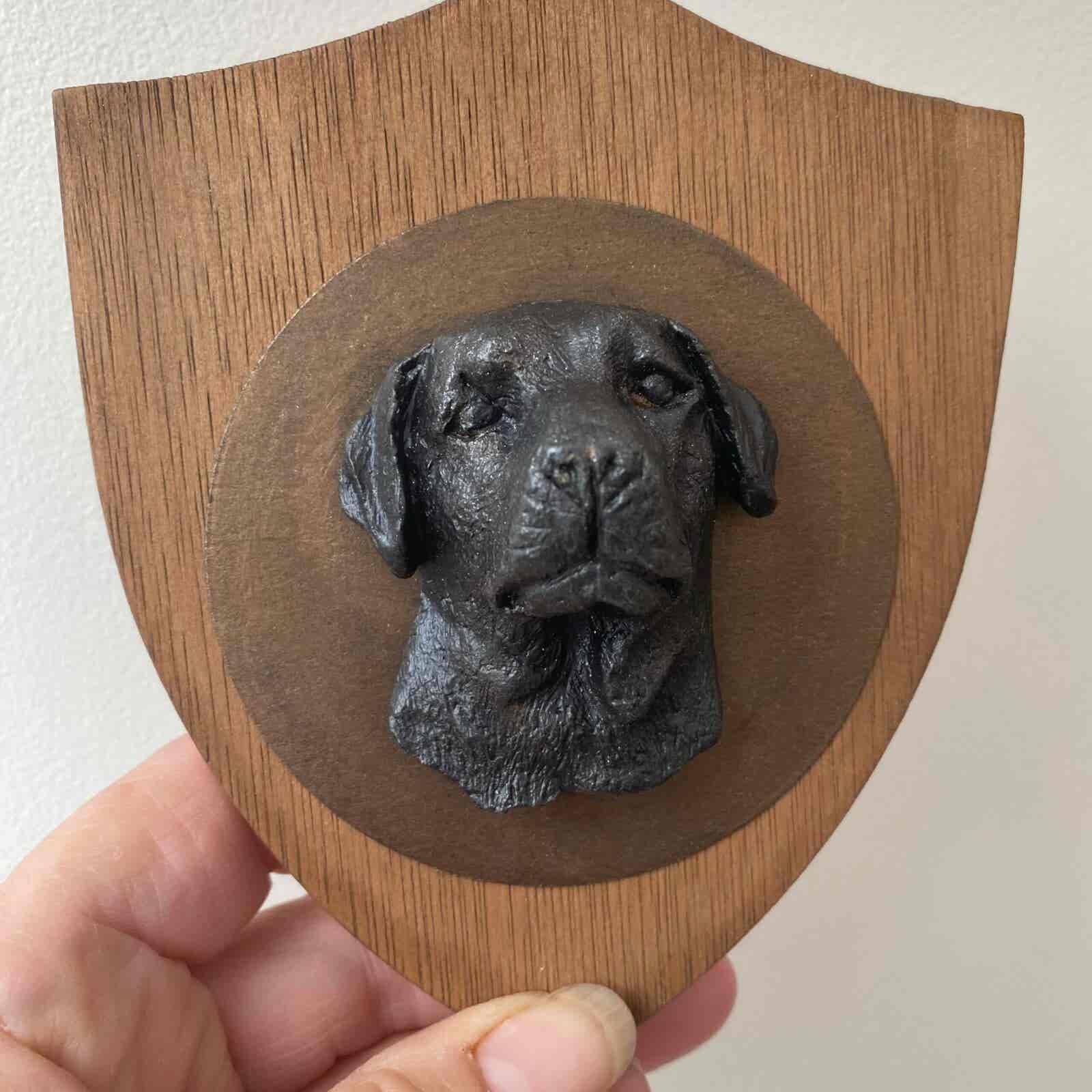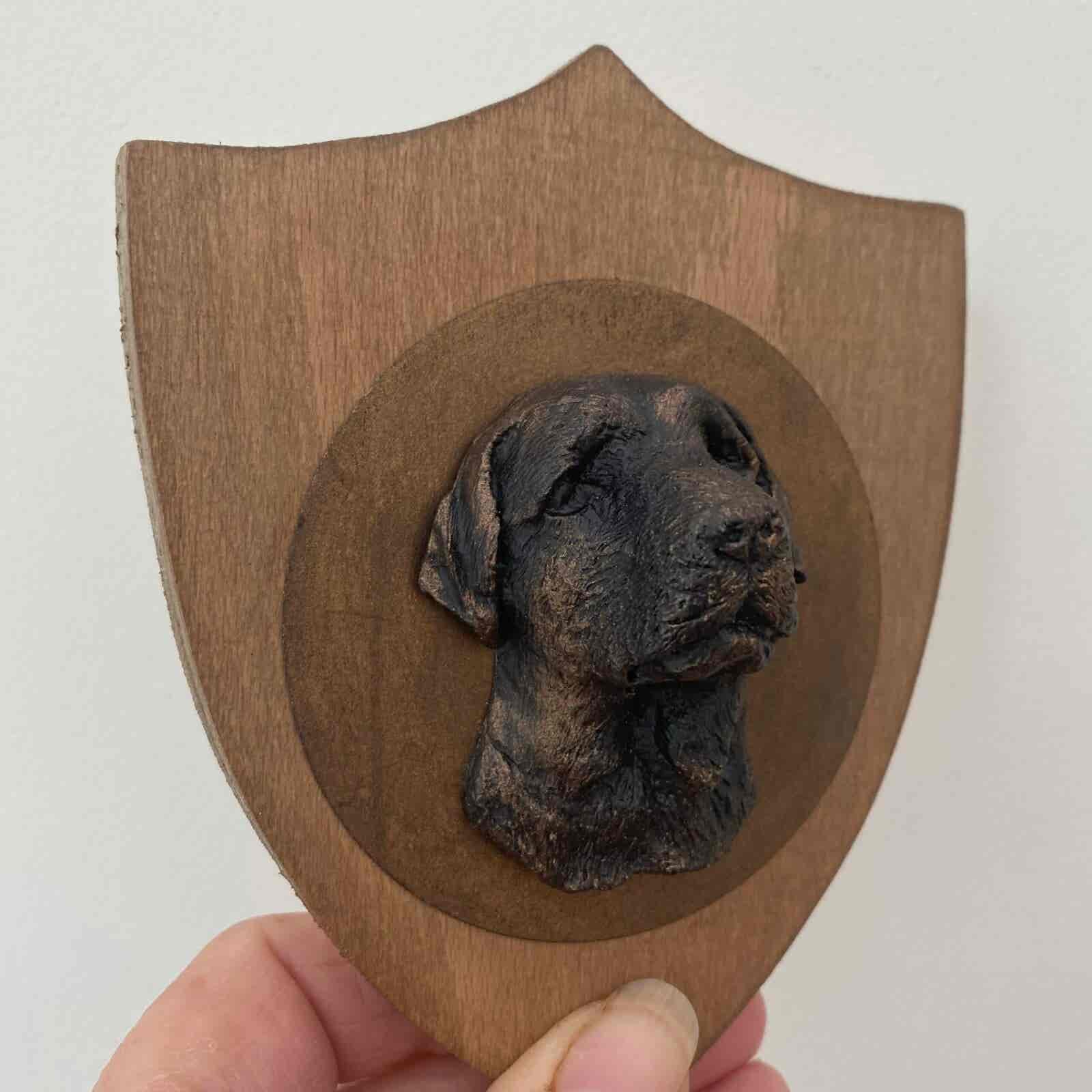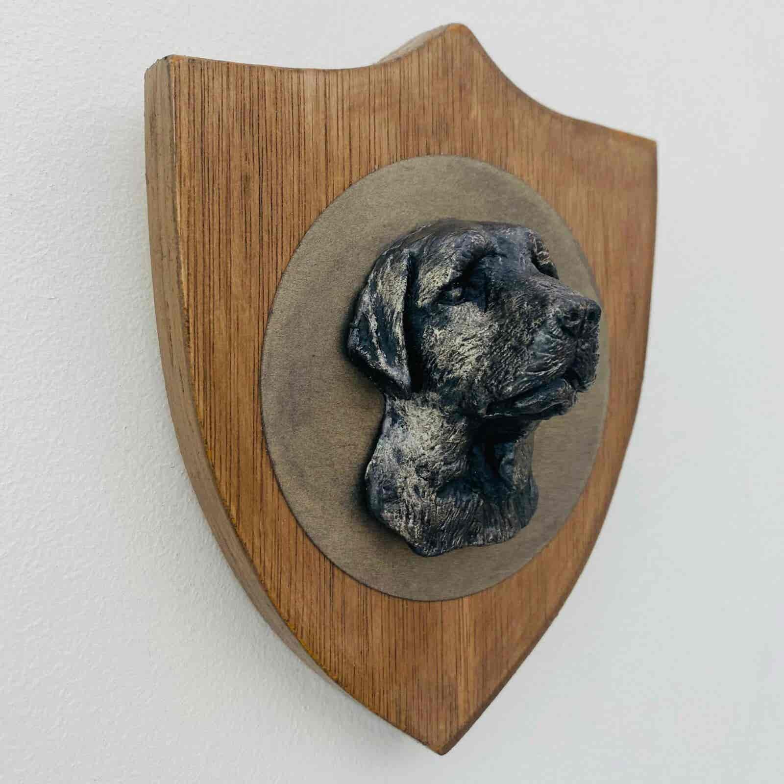 The clay Labrador head has been hand casted in a shaped mold, painted with black acrylic paint, then gilded with either a bronze, gold or silver gilding cream. The head sits on a gilded circle in the centre of the shield. A sawtooth hanger has been put on the back. Each head comes in a presentation box.