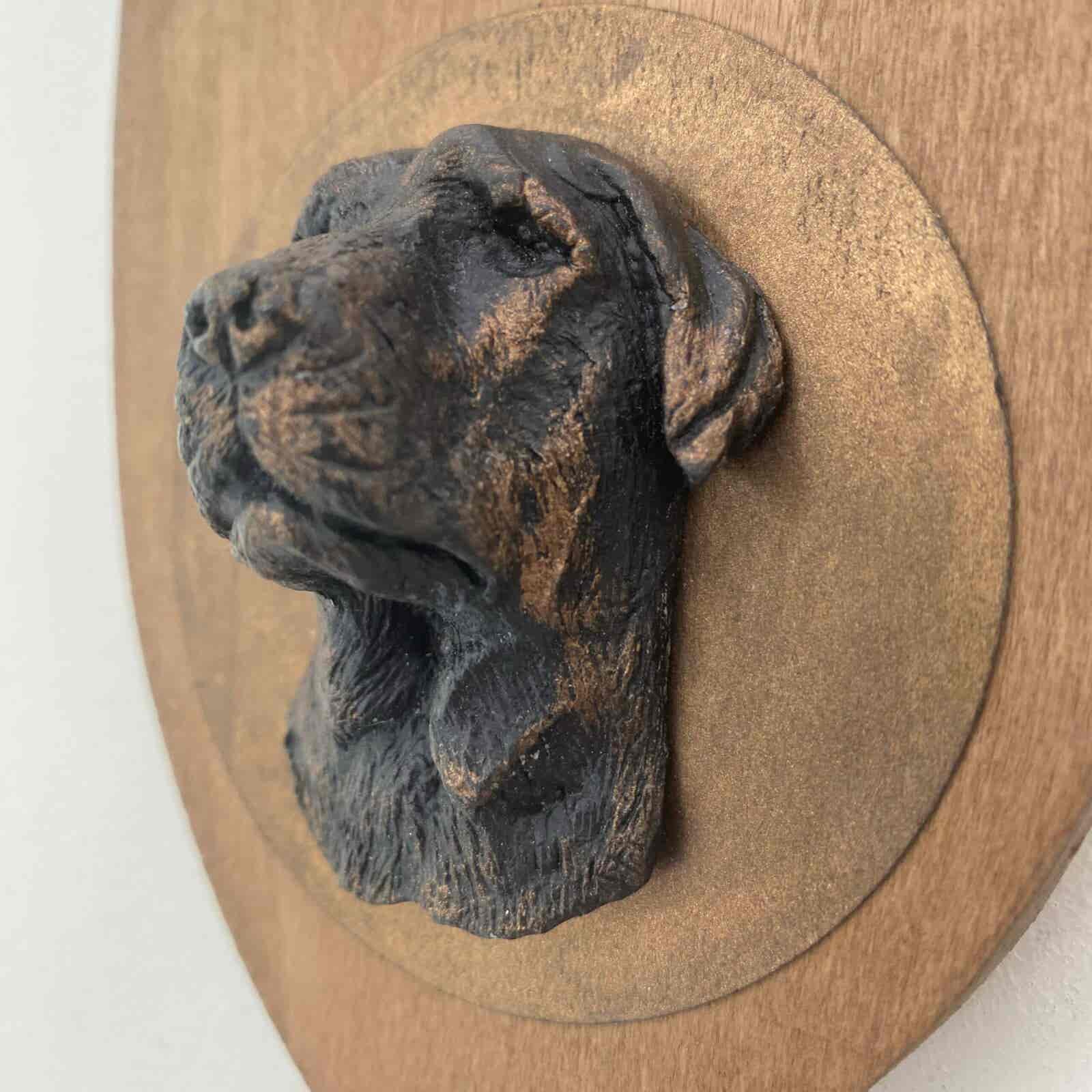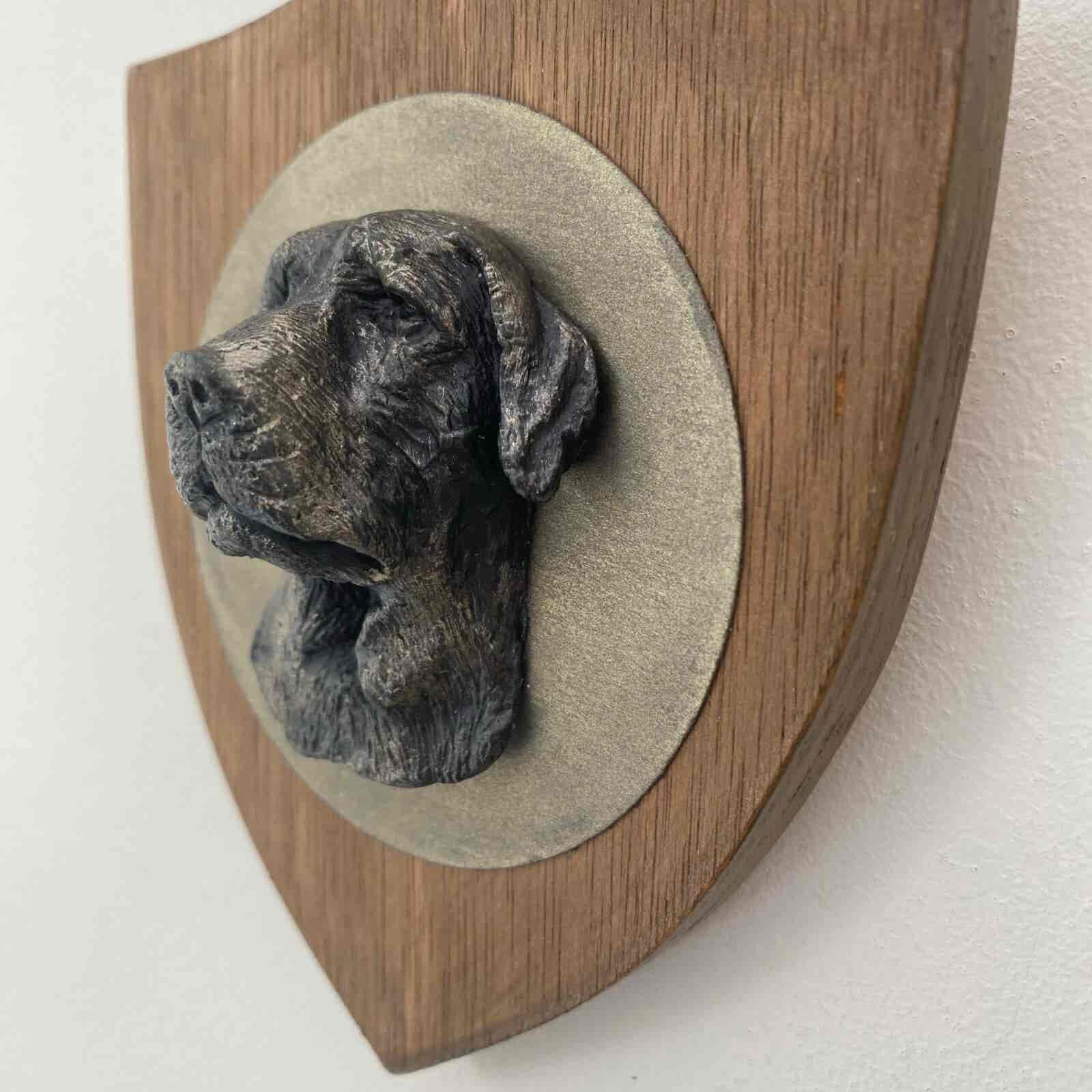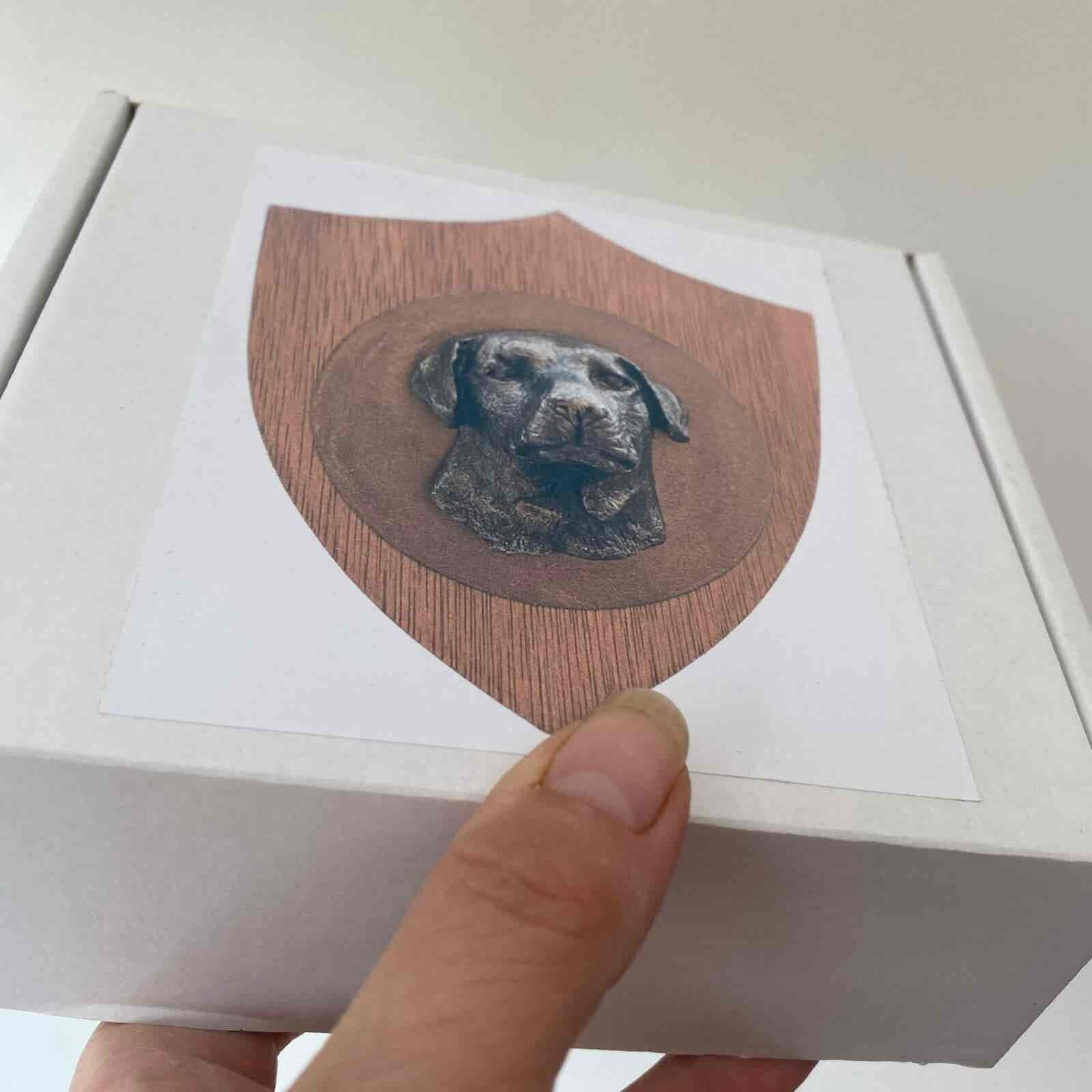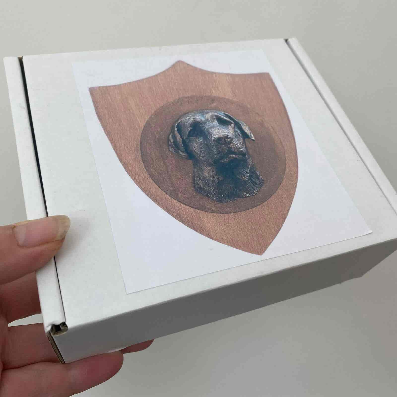 The clay Labrador head has been hand casted in a shaped mold, painted with black acrylic paint, then gilded with either a bronze, gold or silver gilding cream. The head sits on a gilded circle in the centre of the shield. A sawtooth hanger has been put on the back. Each head comes in a presentation box.