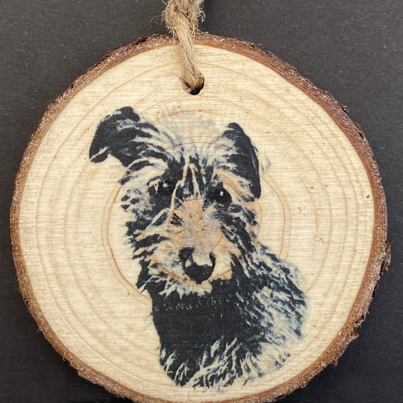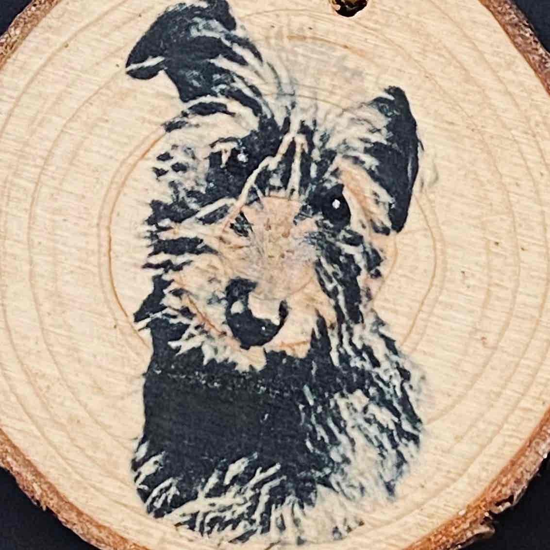 Wood slice featuring a face of a Beddy-Whippet Lurcher.