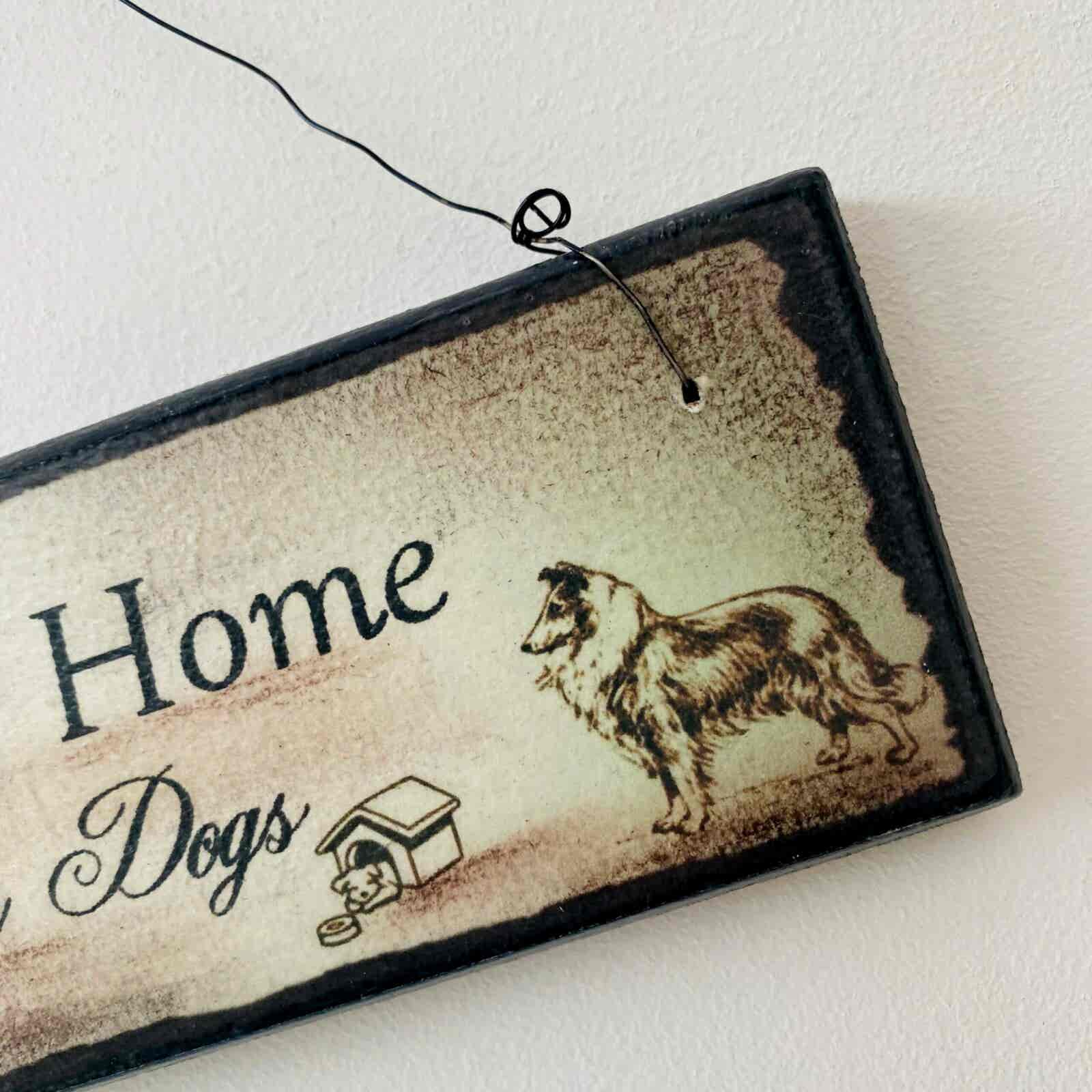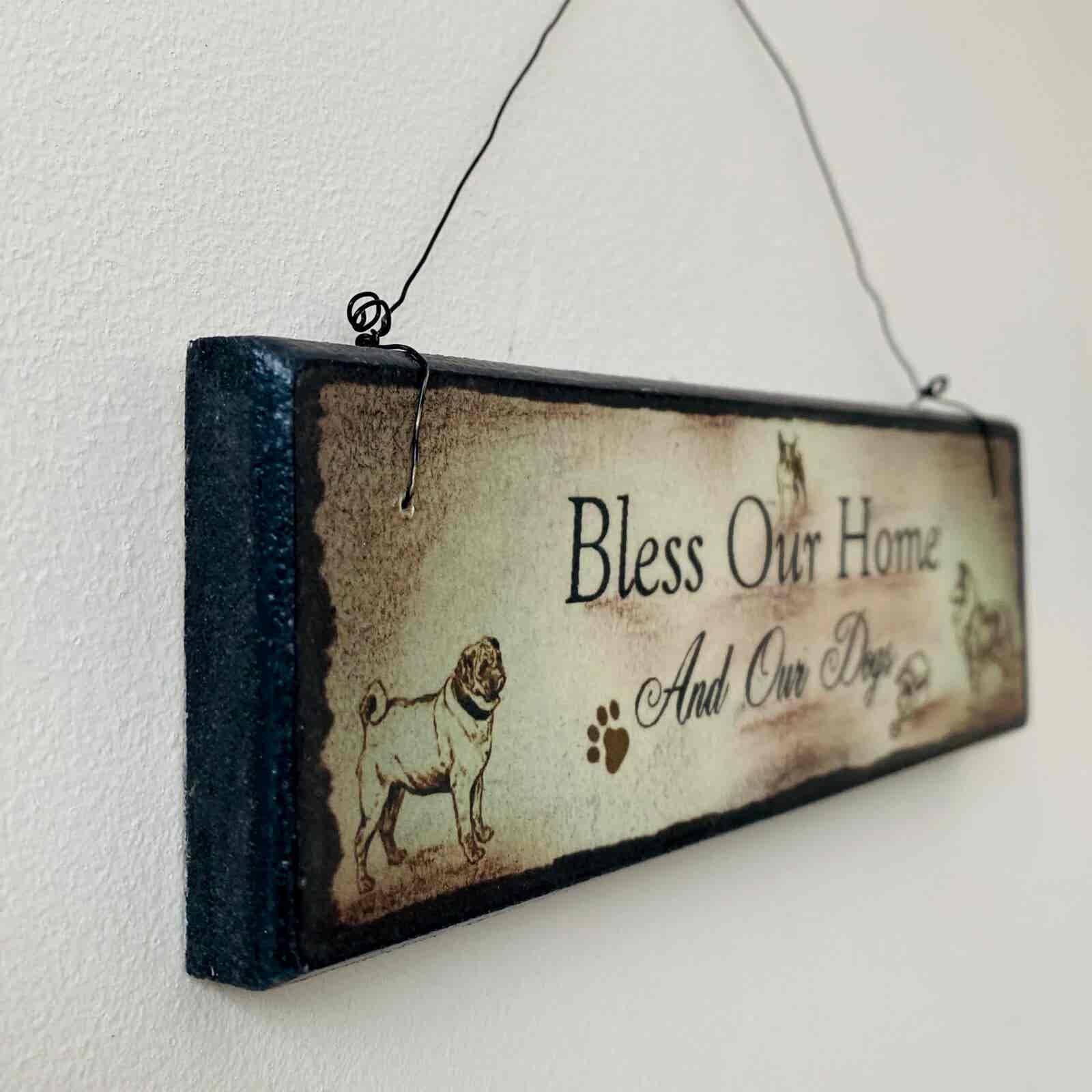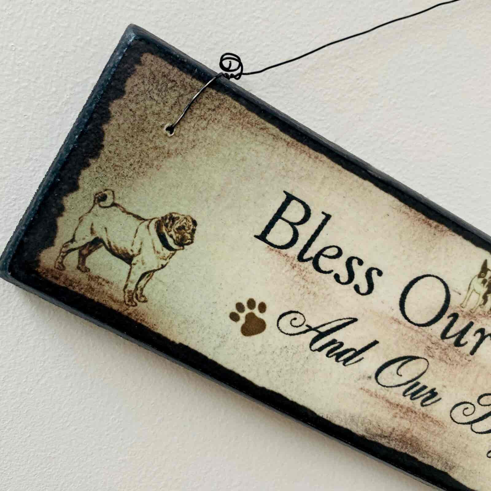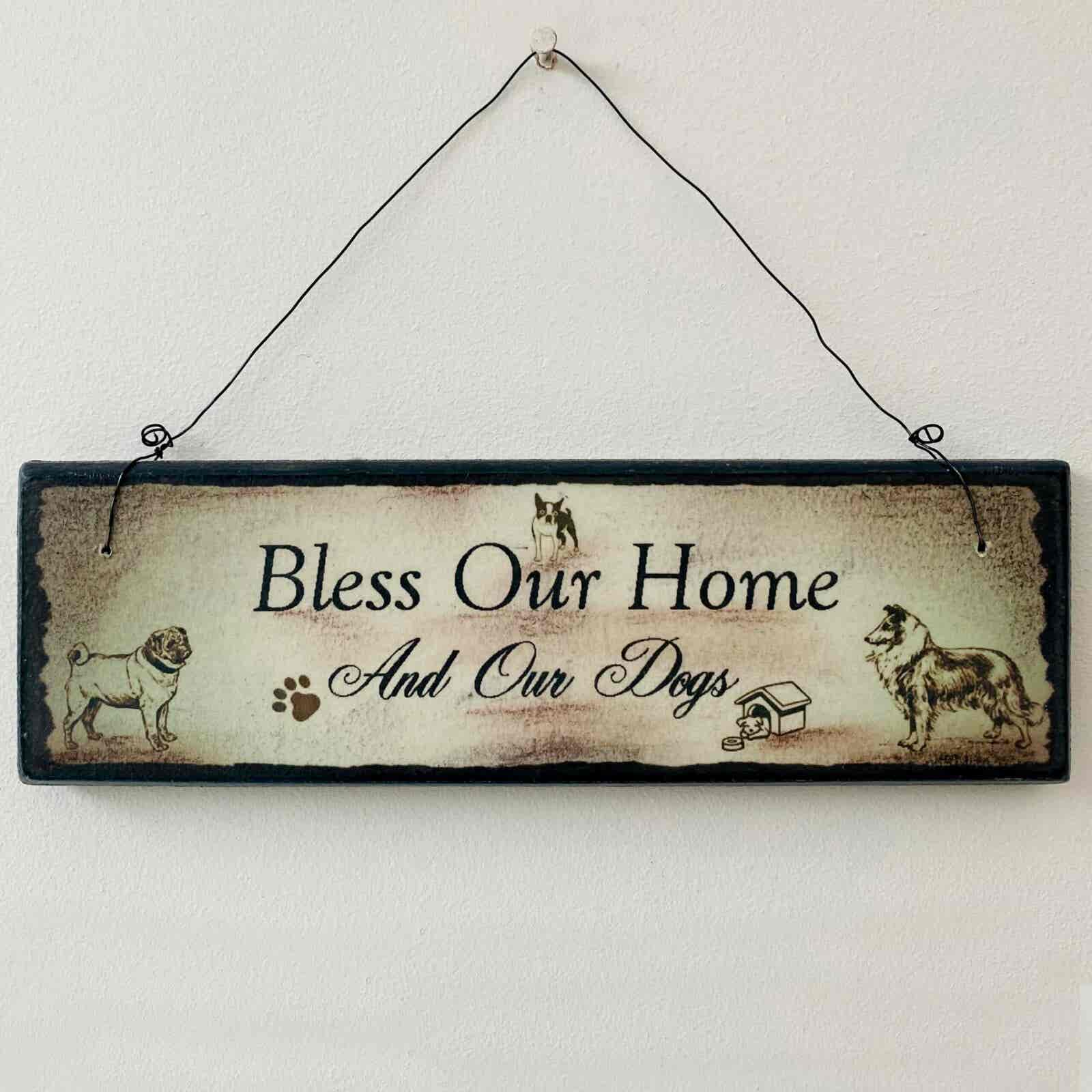 This is a lovely wooden plaque with the wording “Bless Our Home And Our Dogs”. The design is a printed vintage effect, with various dog details. The wording compliments the design beautifully, and will look lovely hanging in any dog lovers home.