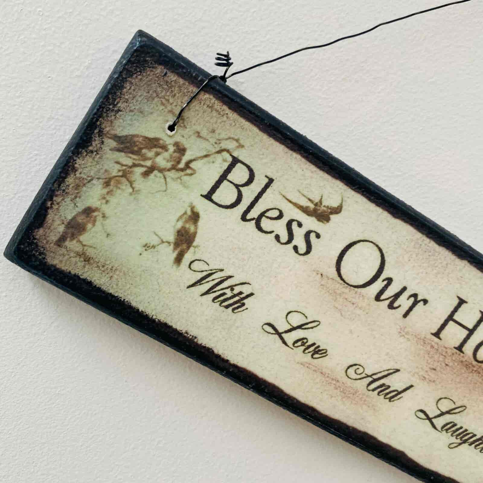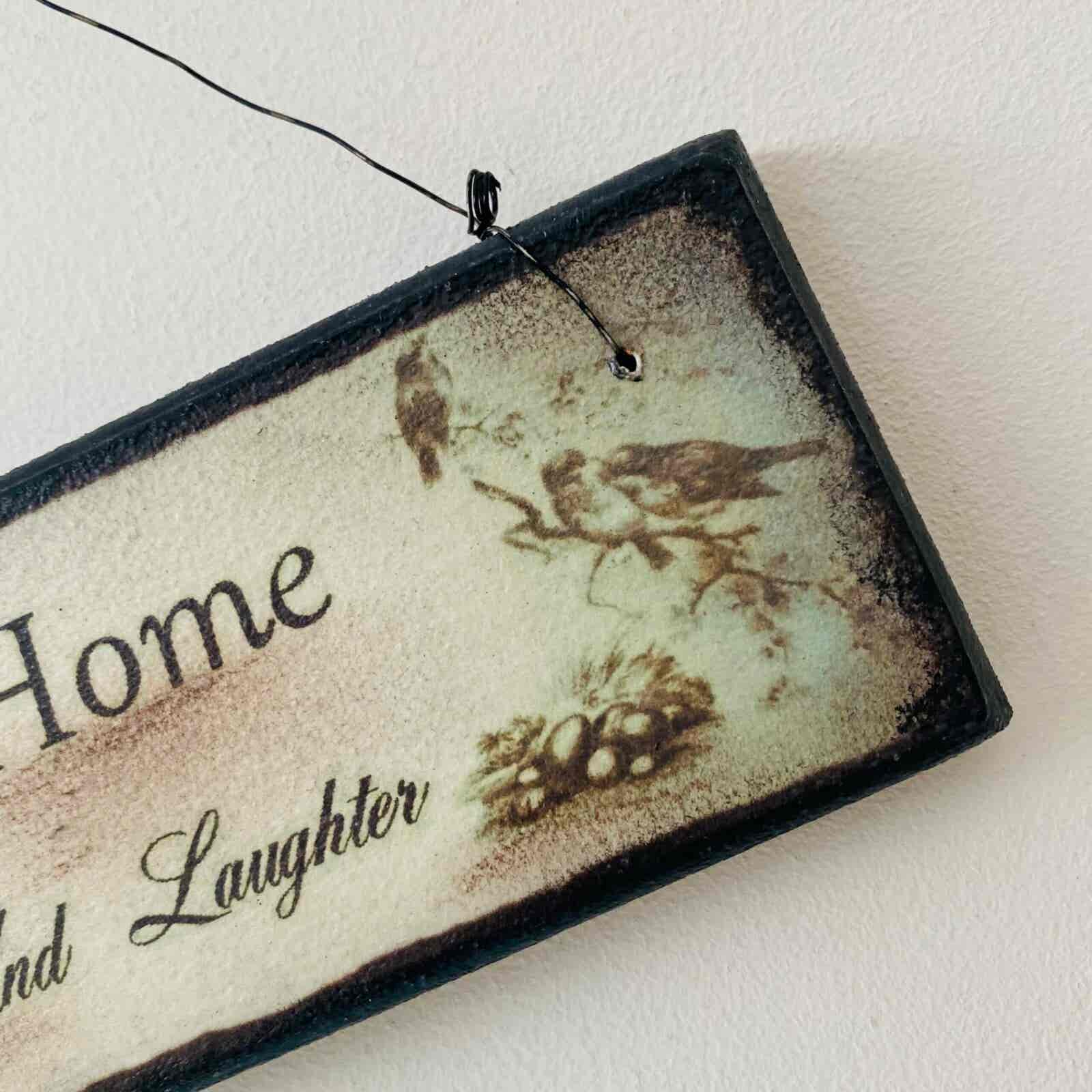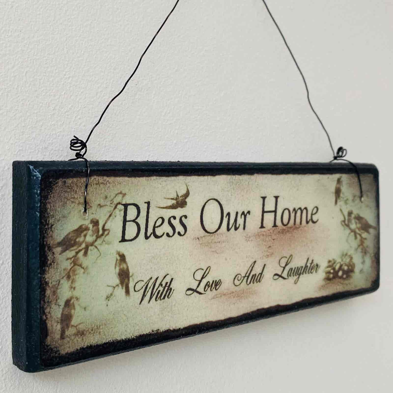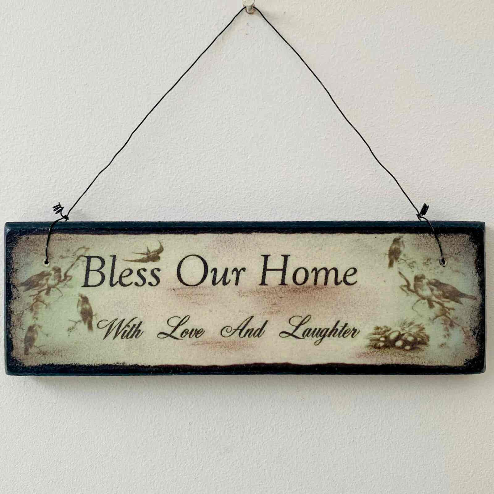 This is a lovely wooden plaque with the wording “Bless Our Home With Love And Laughter”. The design is a printed vintage effect, with a bird theme. The wording compliments the design beautifully, and will look lovely hanging in any home.