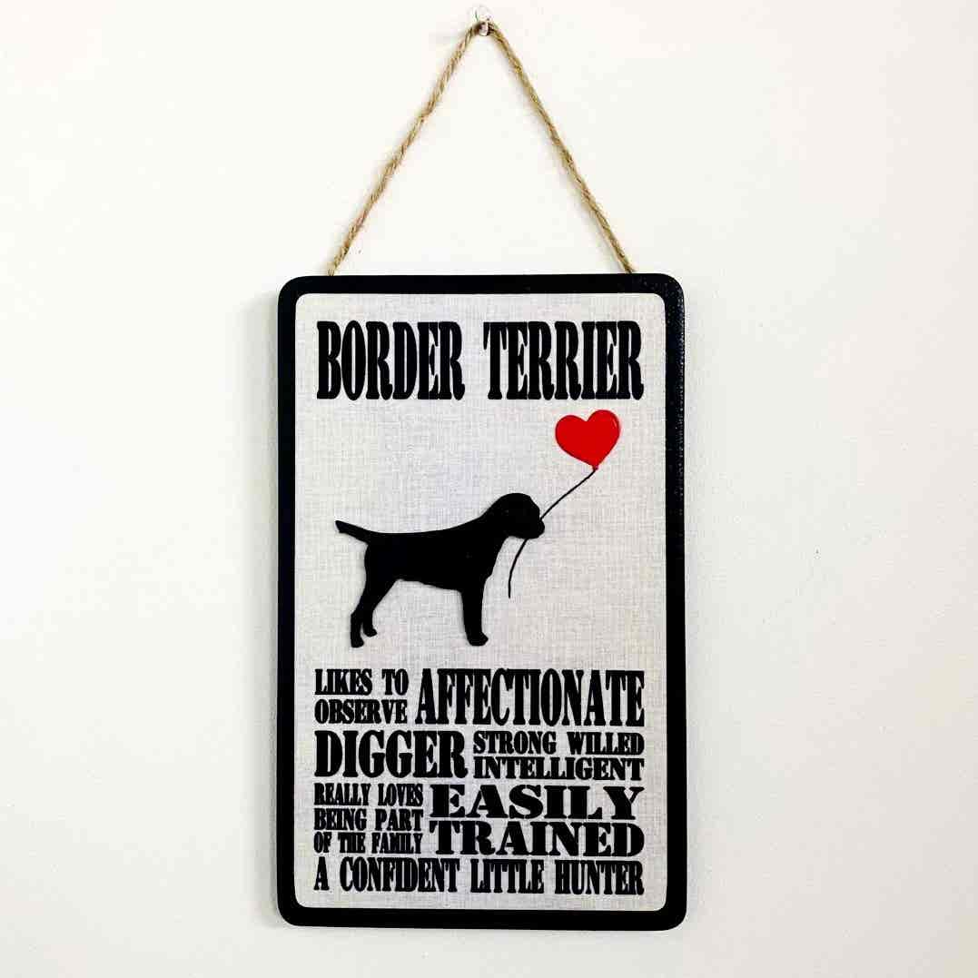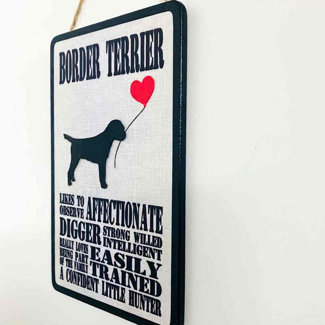 An original design, handmade typography plaque, detailing the characteristics of a Border Terrier.