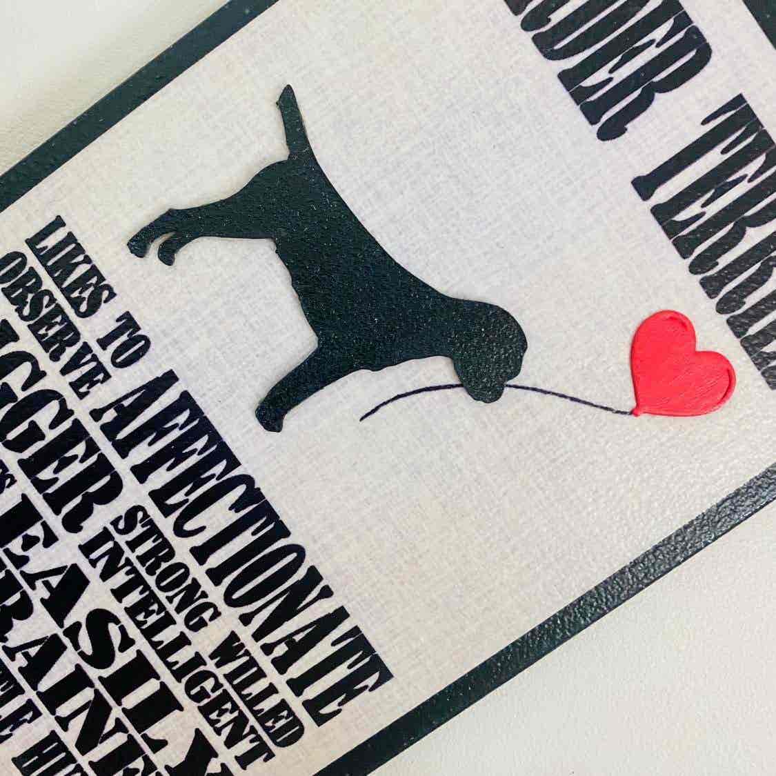 Beautifully finished, with a machine cut embossed Border Terrier silhouette and heart to compliment the design.