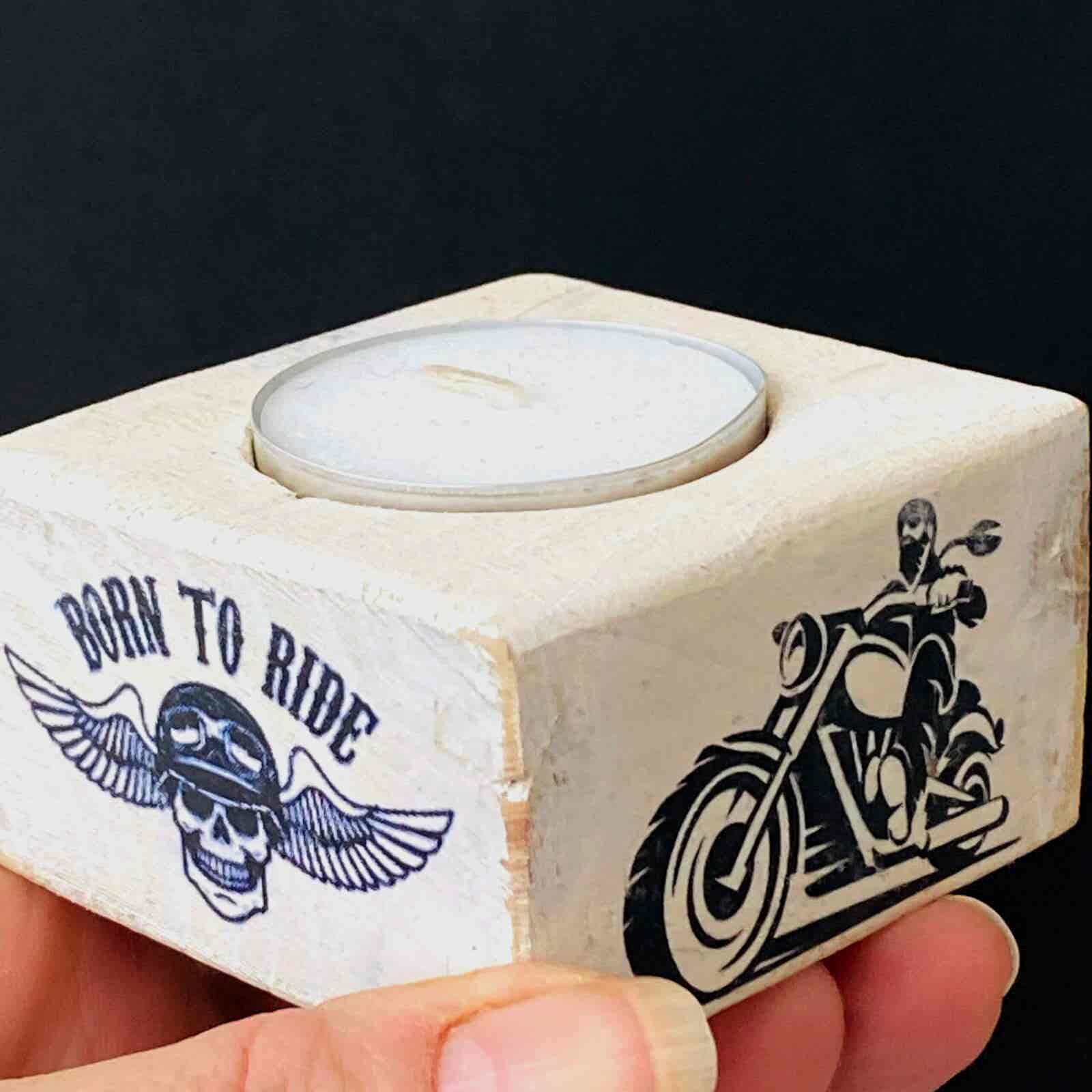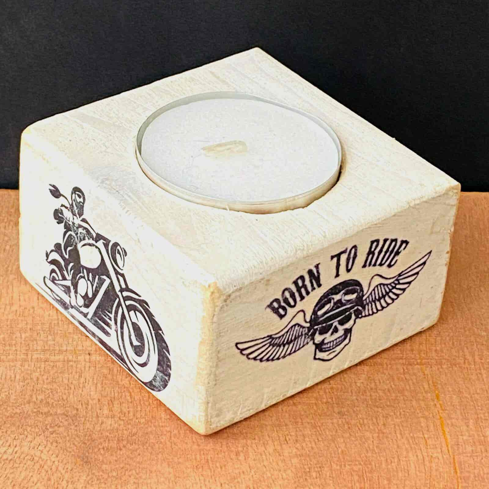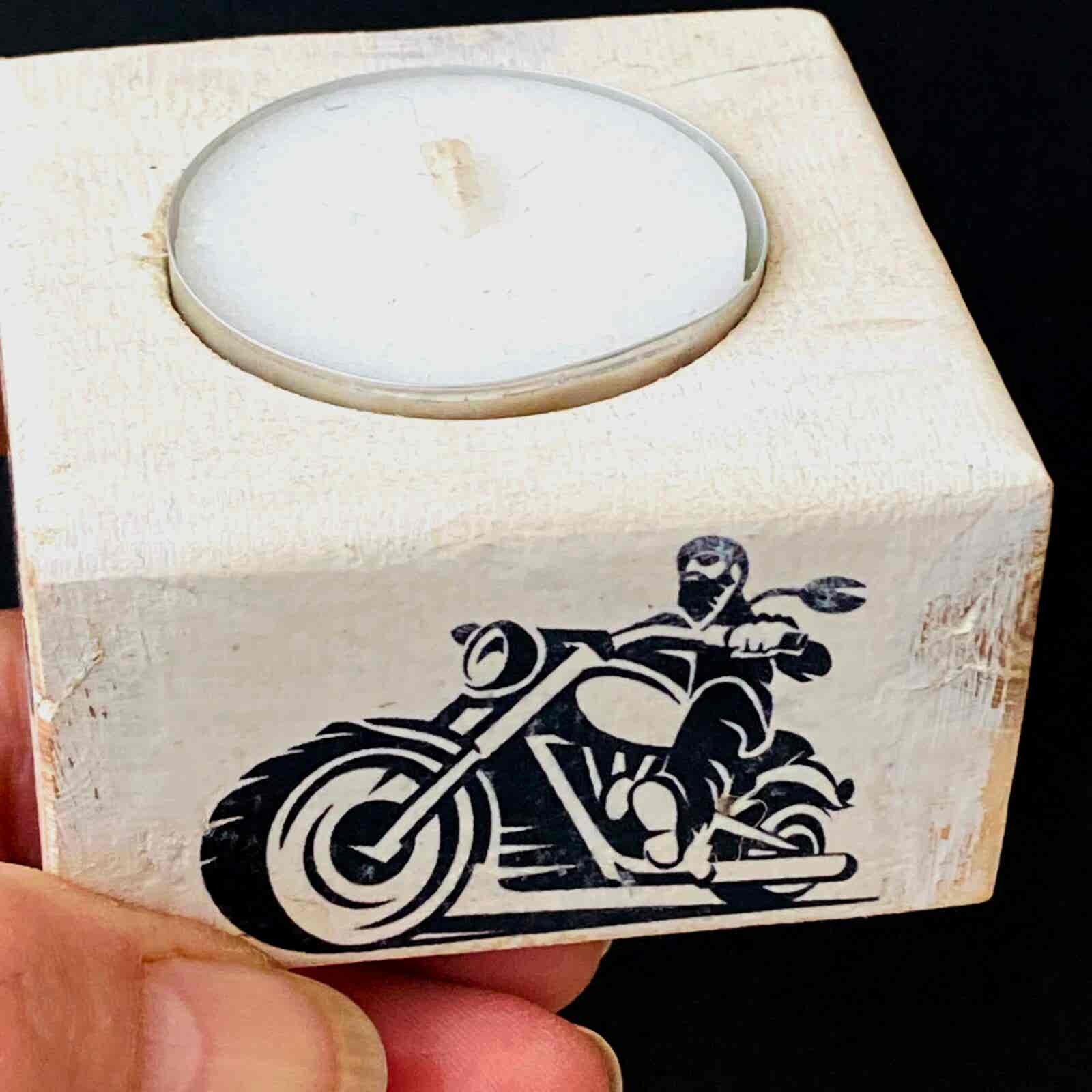 This is a hand cut ‘block’ tealight holder, and each side has been decorated with a biker design, then sealed. The hole has been cut to fit a regular or battery operated tealight candle.
