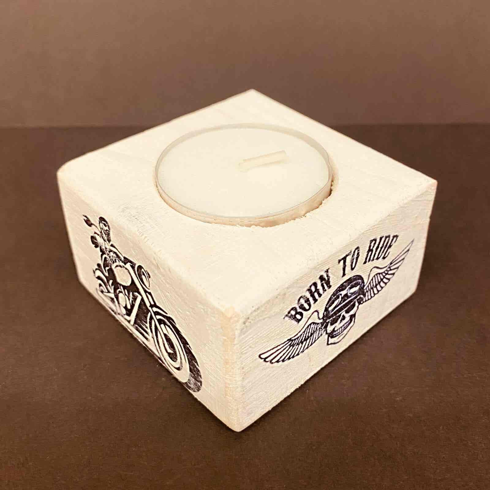 Pine block tealight holder, painted white and distressed. With biker designs.
