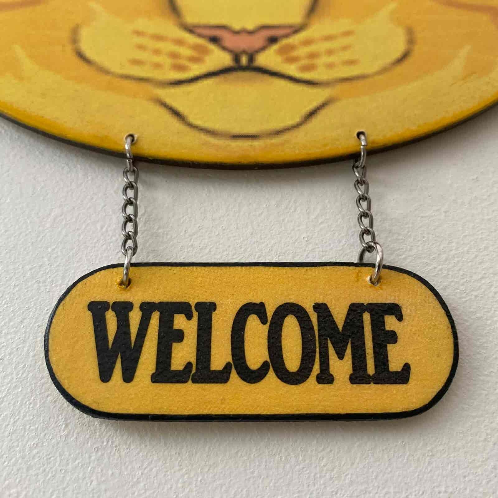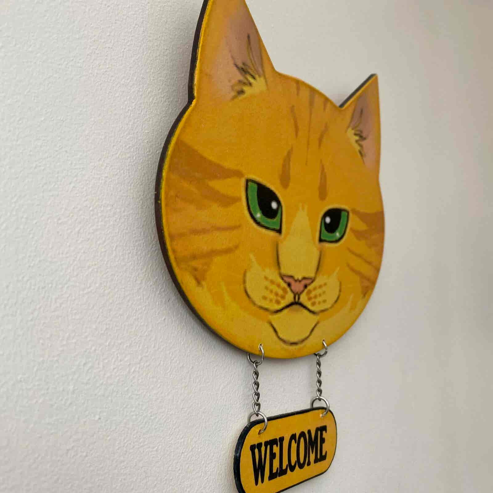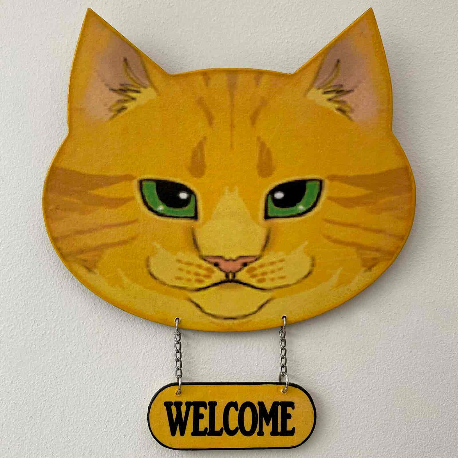 This is cat’s head shaped plaque, featuring a ginger cat face, and a hanging welcome sign. The “Welcome” sign is hanging from a chain, and colour co-ordinates with the cat face. It has a saw tooth hanger on the back to hang on the wall.