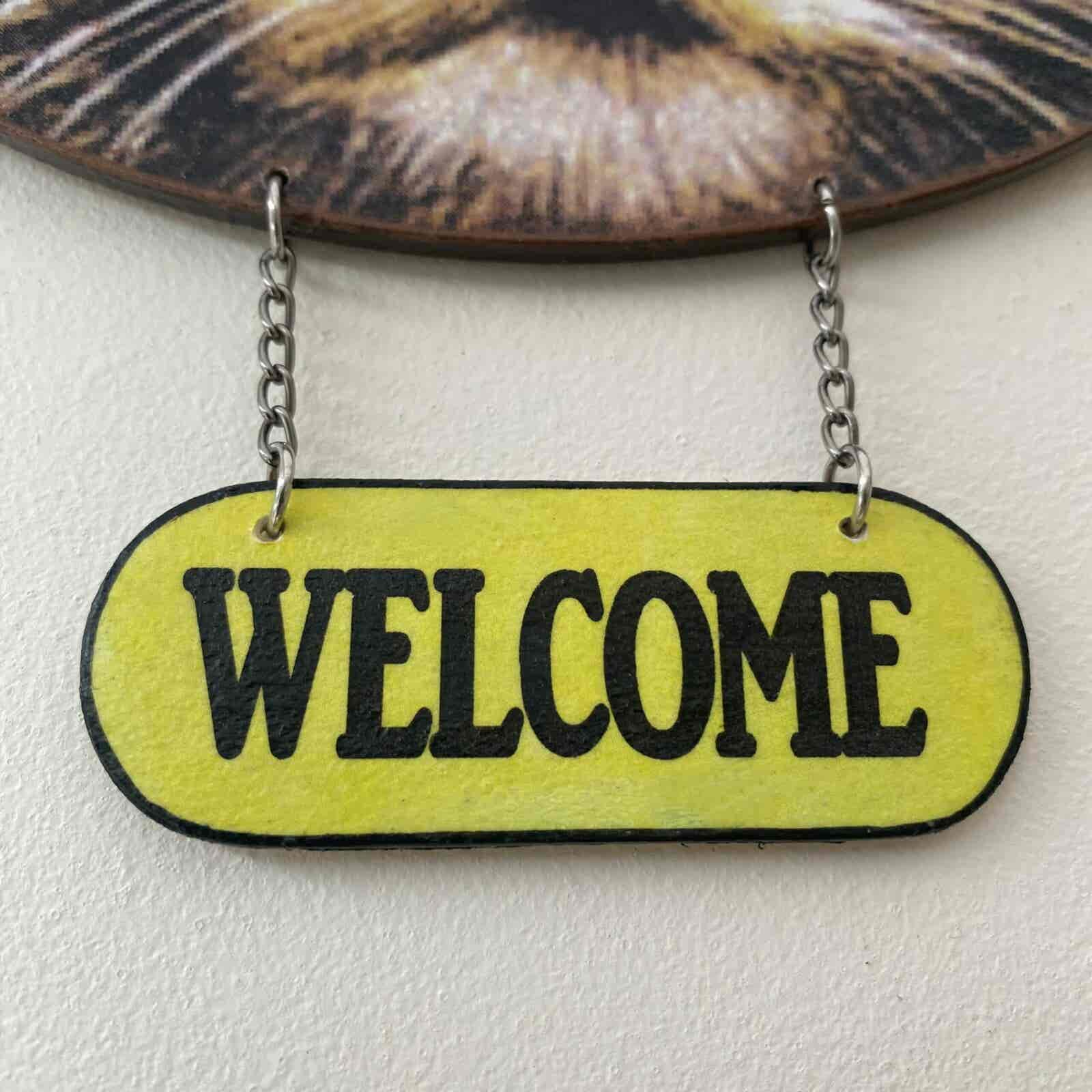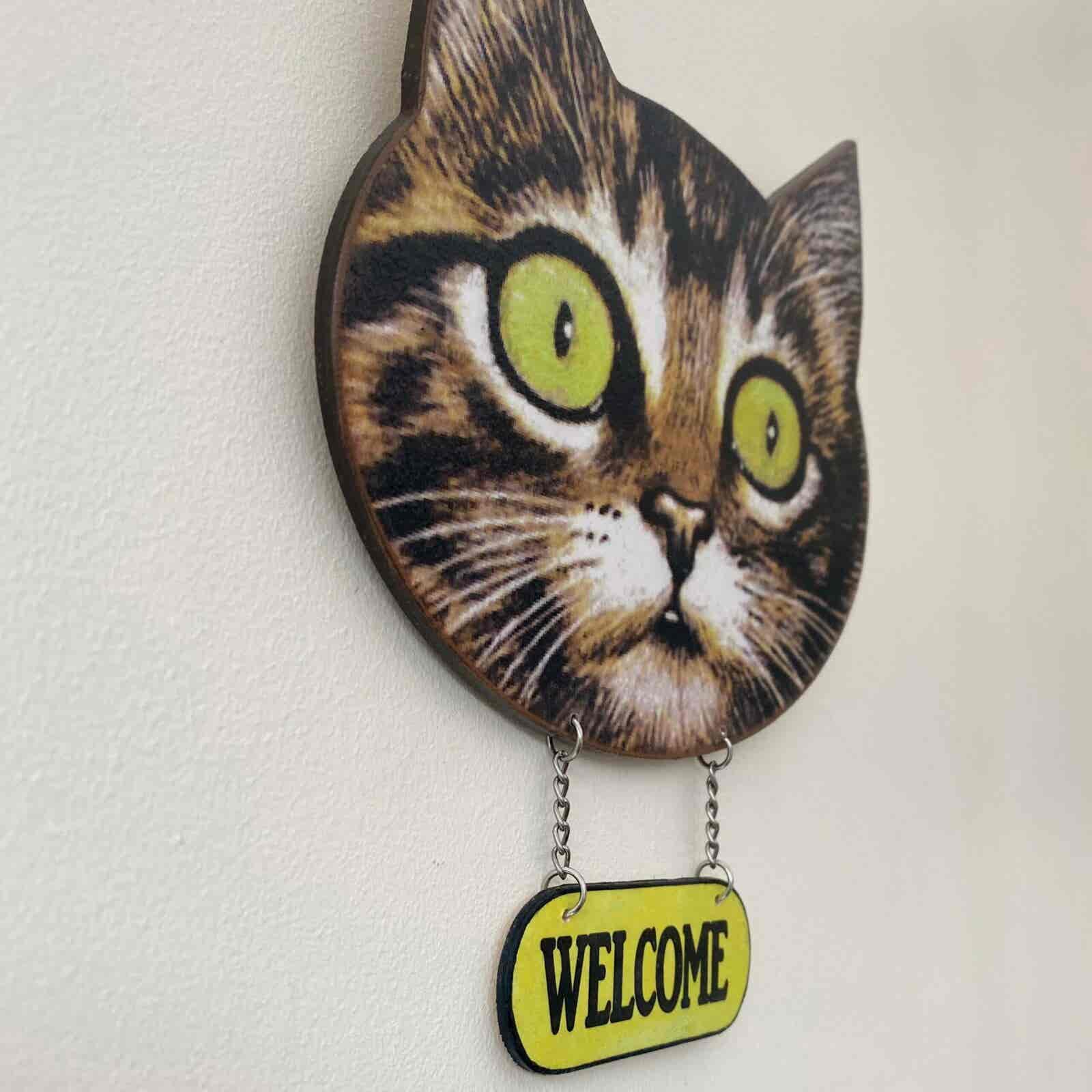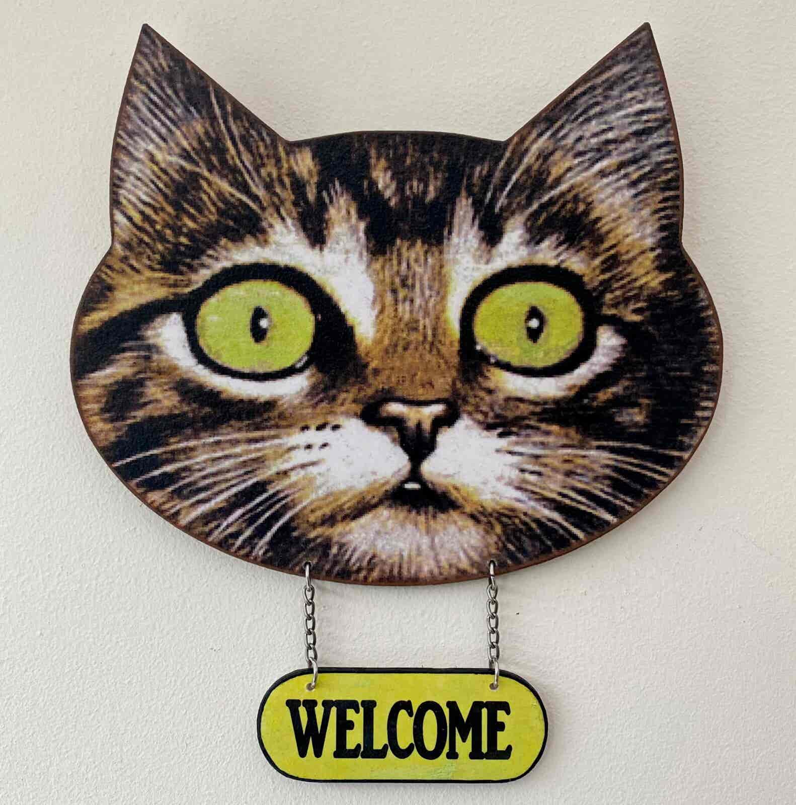 This is cat’s head shaped plaque, featuring a tabby cat face, and a hanging welcome sign. The “Welcome” sign is hanging from a chain, and colour co-ordinates with the cat face. It has a saw tooth hanger on the back to hang on the wall.