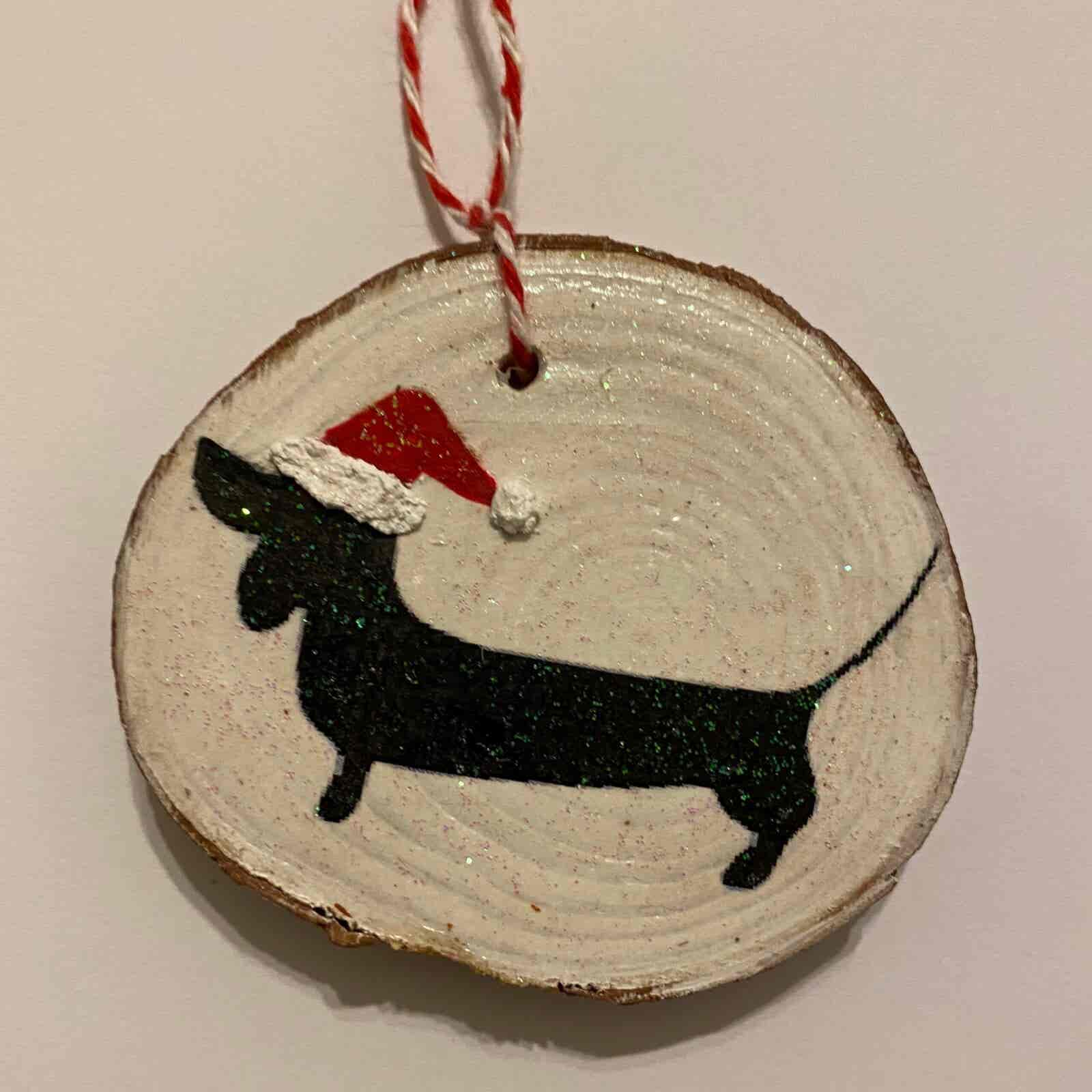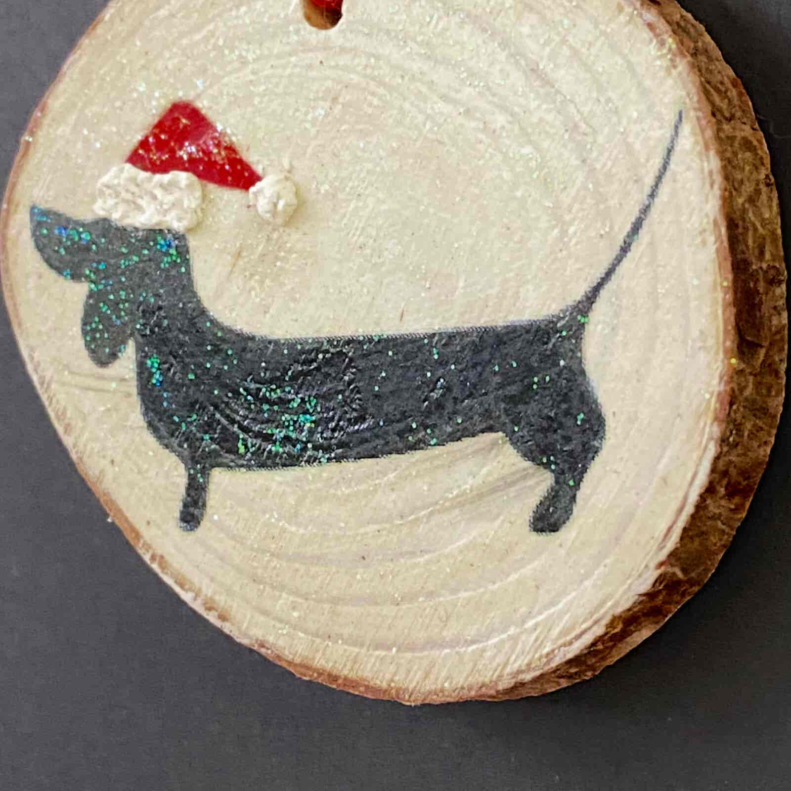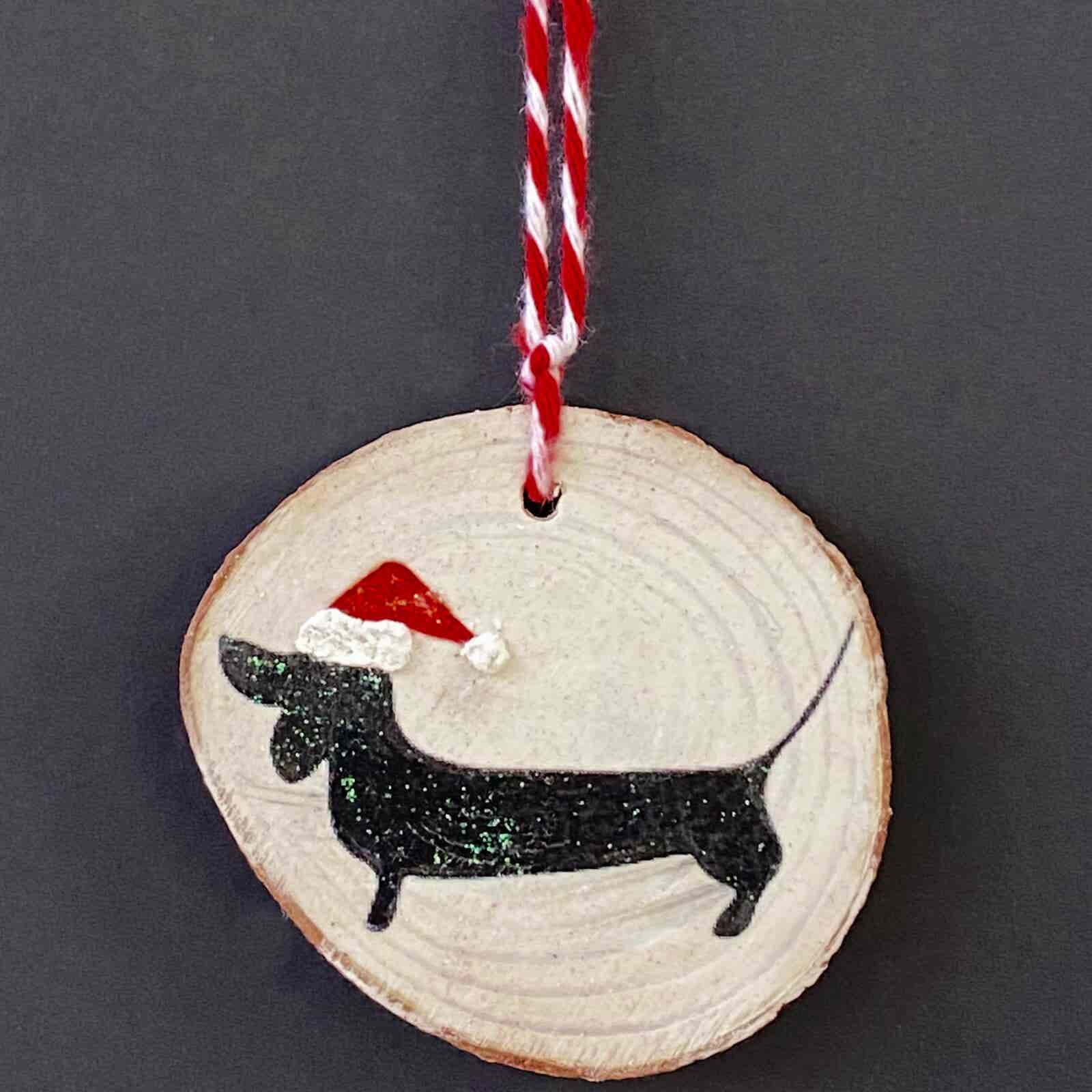 An original festive design, handcrafted wood slice, featuring a Dachshund.