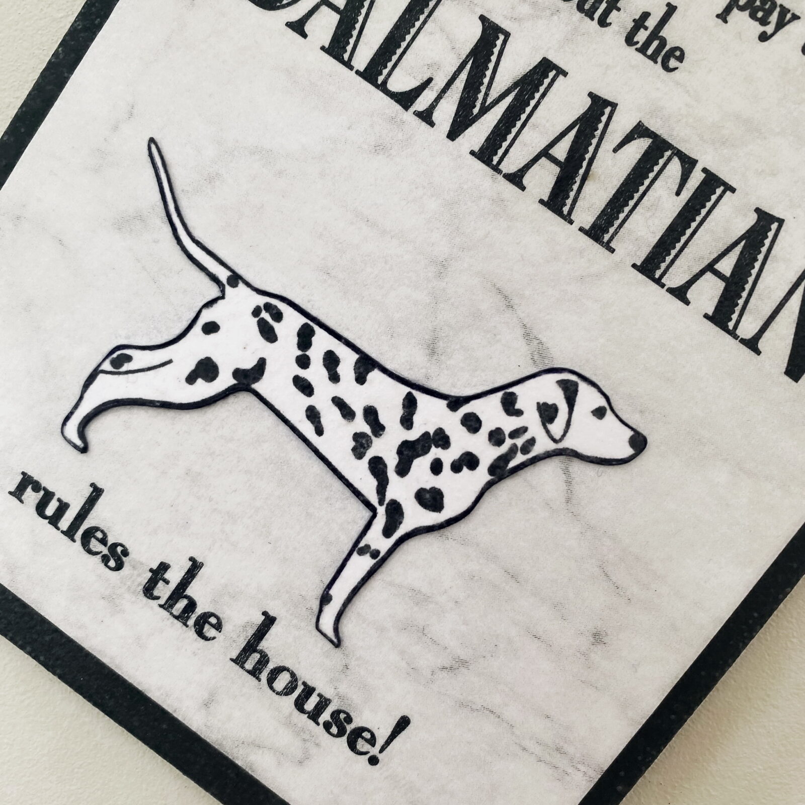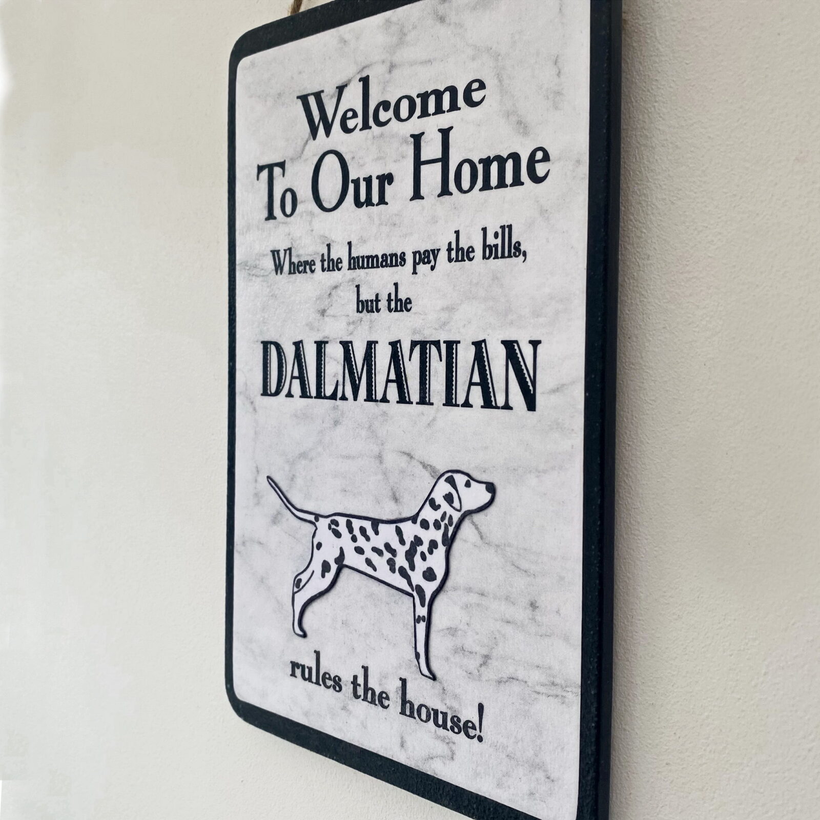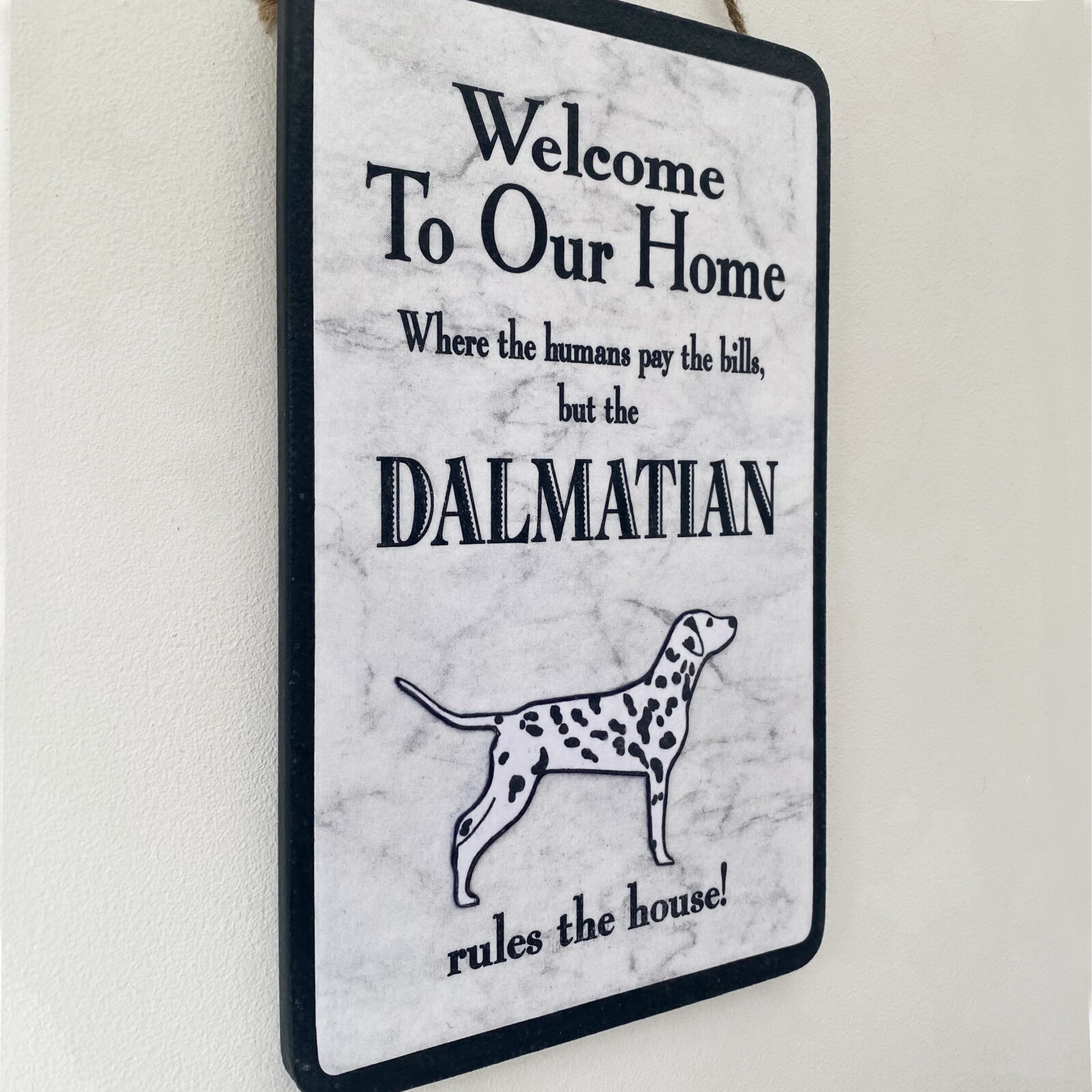 An original design, handmade “Welcome to Our Home” plaque, featuring a Dalmatian.