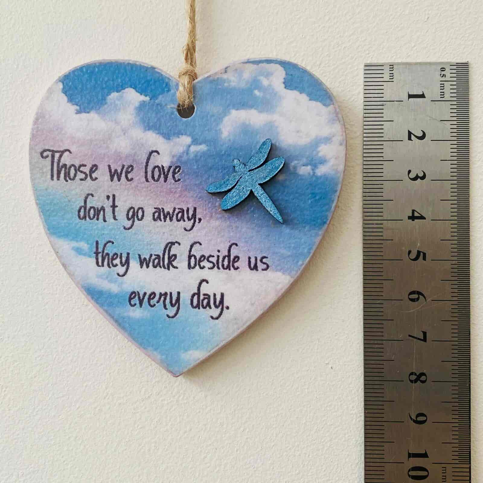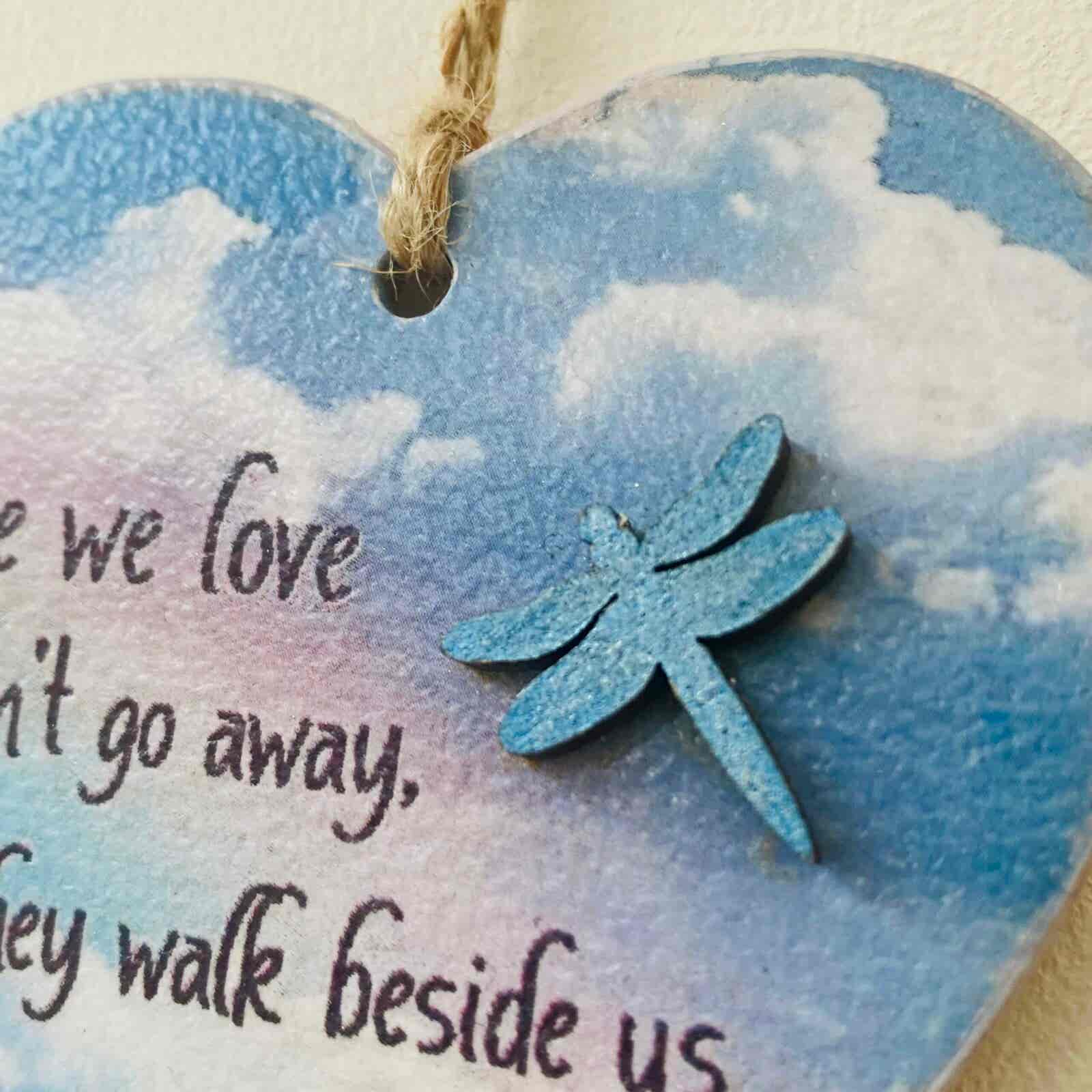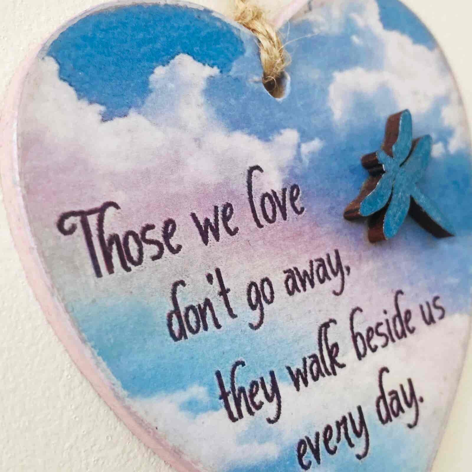 This is a beautiful memorial heart, which is complimented with a decorated wooden dragonfly. It has the saying “Those we love don’t go away, they walk beside us every day”, and edged in pale pink to match the theme.