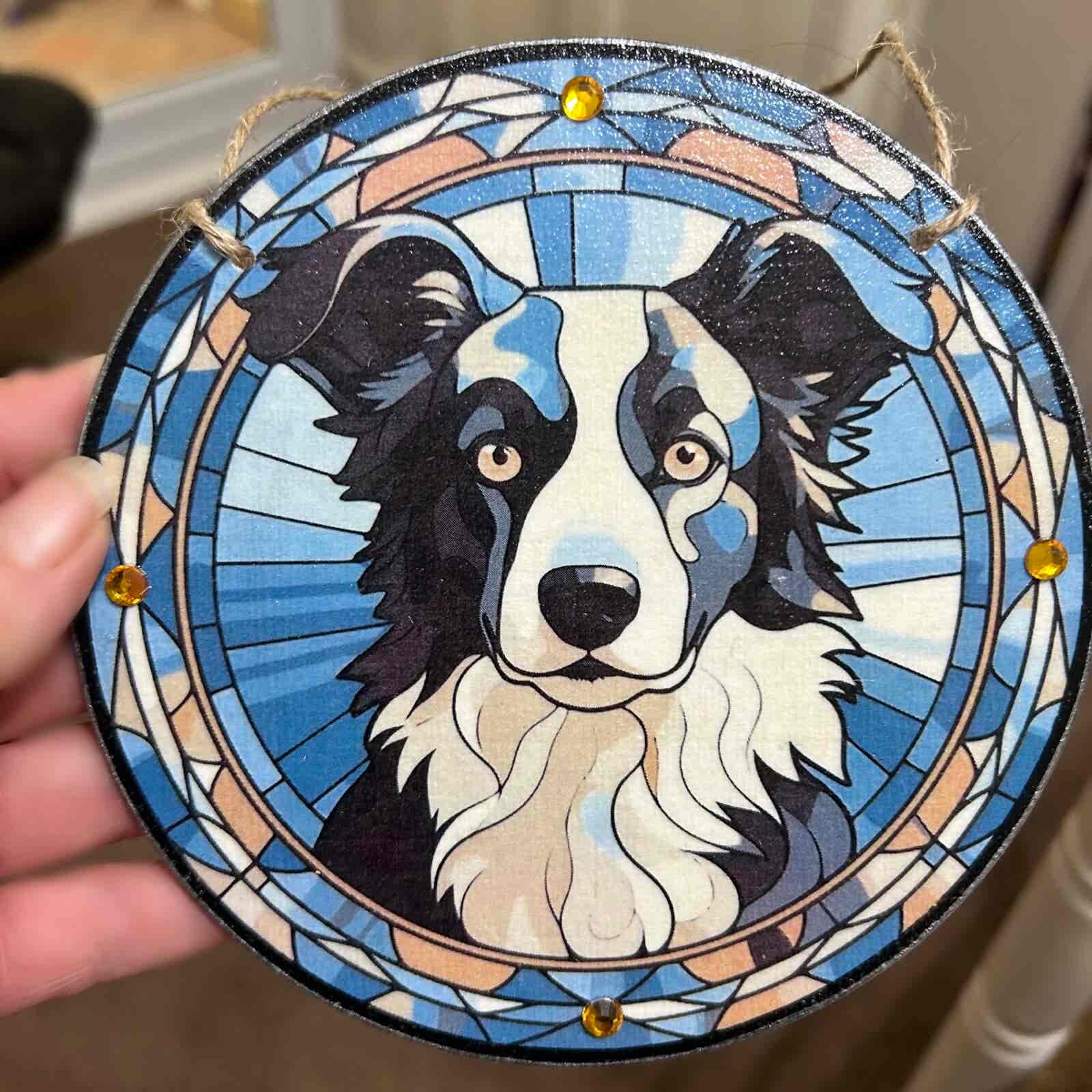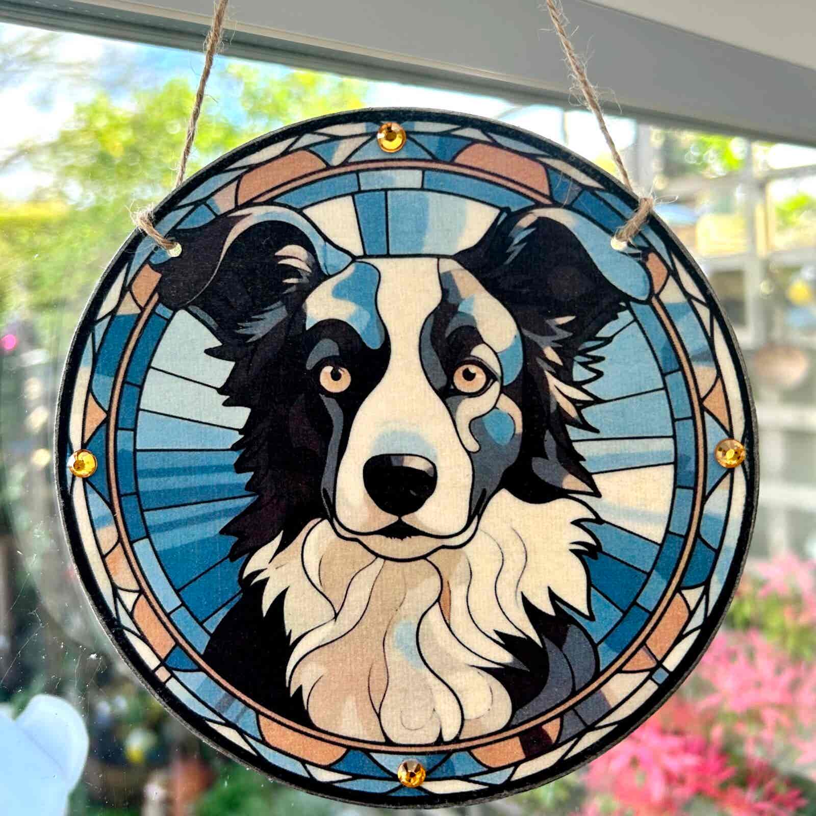 This original design is a wooden circular shaped plaque, featuring a Border Collie on a stained glass effect background. The design is finished with four contrasting coloured gems, and a natural jute hanging.