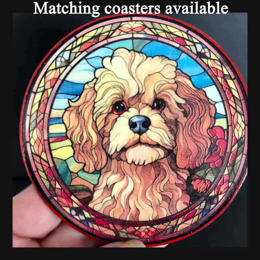 An original design – this is a wooden circular shaped plaque, featuring a Cockapoo/Cavapoo on a stained glass effect background.