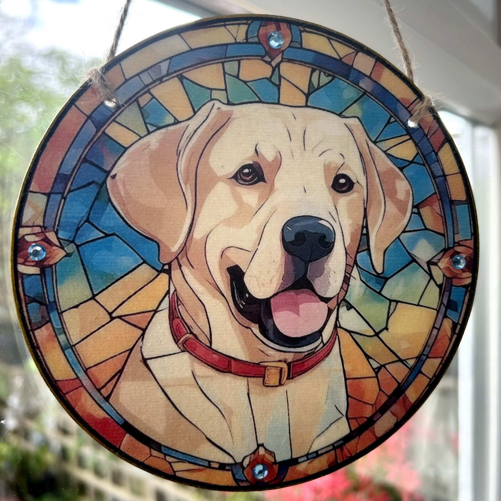 This original design is a wooden circular shaped plaque, featuring a Golden Labrador on a stained glass effect background. The design is finished with four contrasting coloured gems, and a natural jute hanging.