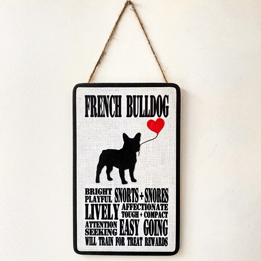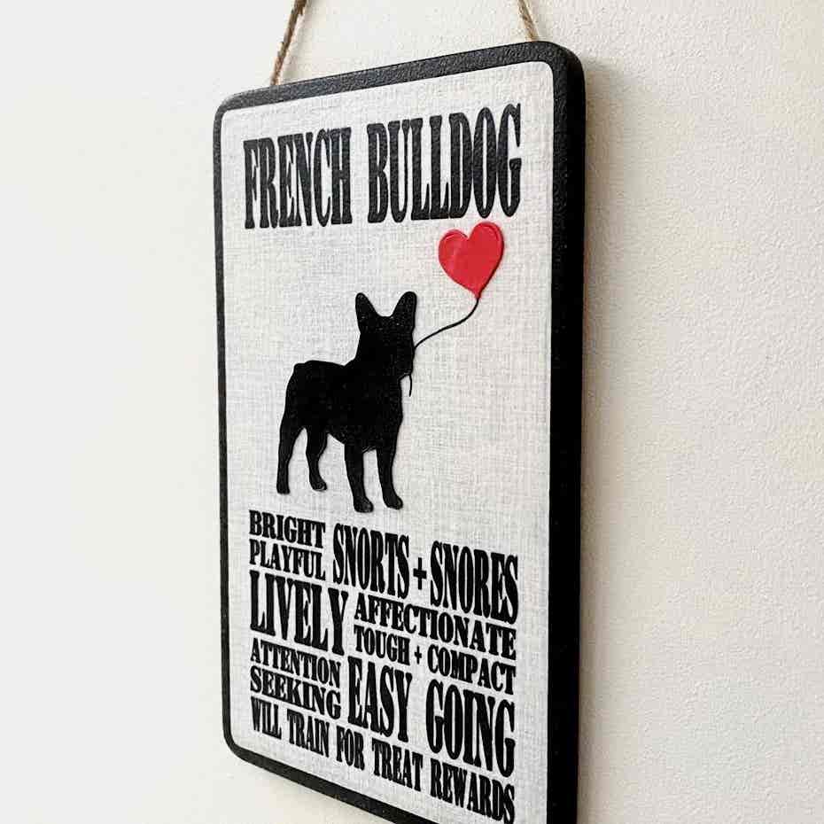 An original design, handmade typography plaque, detailing the characteristics of a French Bulldog.