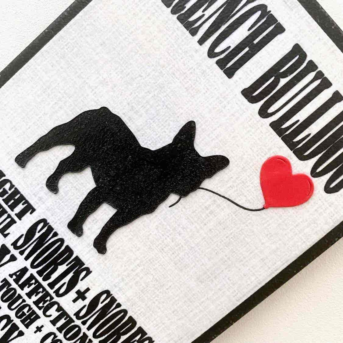 Beautifully finished, with a machine cut embossed French Bulldog silhouette and heart to compliment the design.