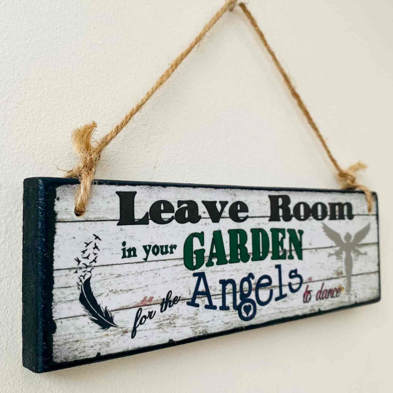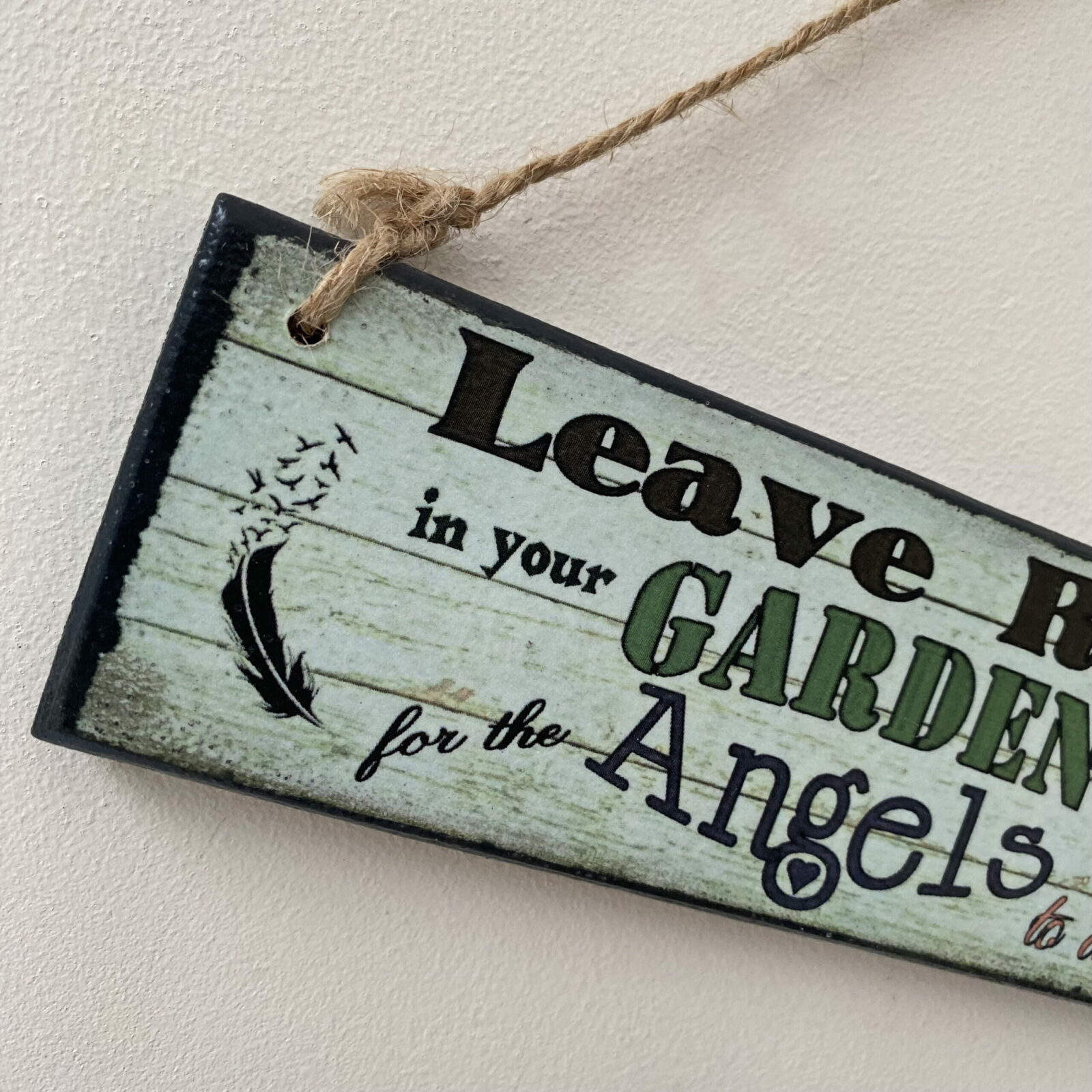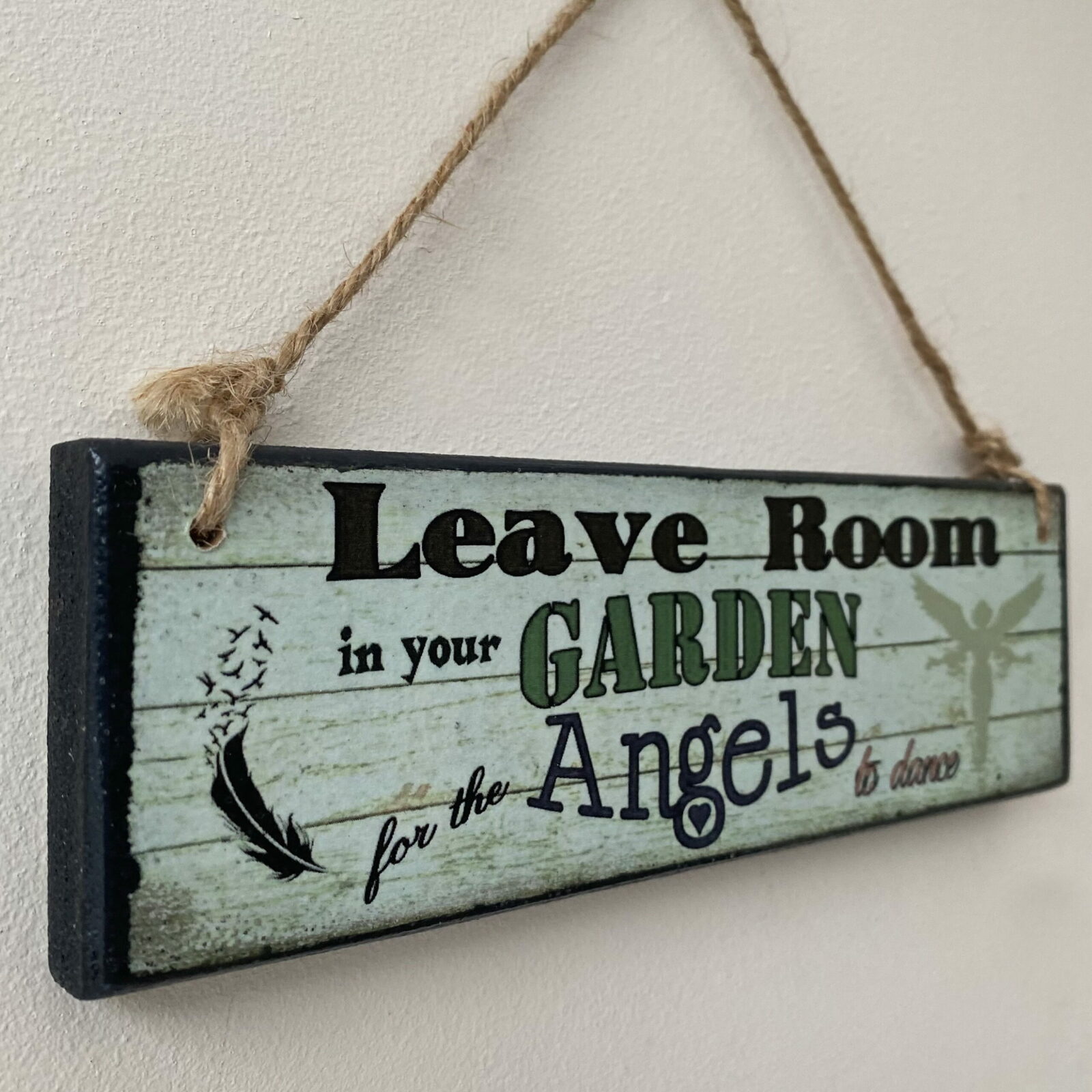 This is a lovely wooden plaque with the wording “Leave room in your garden for the Angels to dance”. The design is a printed woodgrain effect, with an angel detail one end, and a feather and birds detail the other end. The wording compliments the design beautifully, and will look lovely hanging by the back door, overlooking the garden.