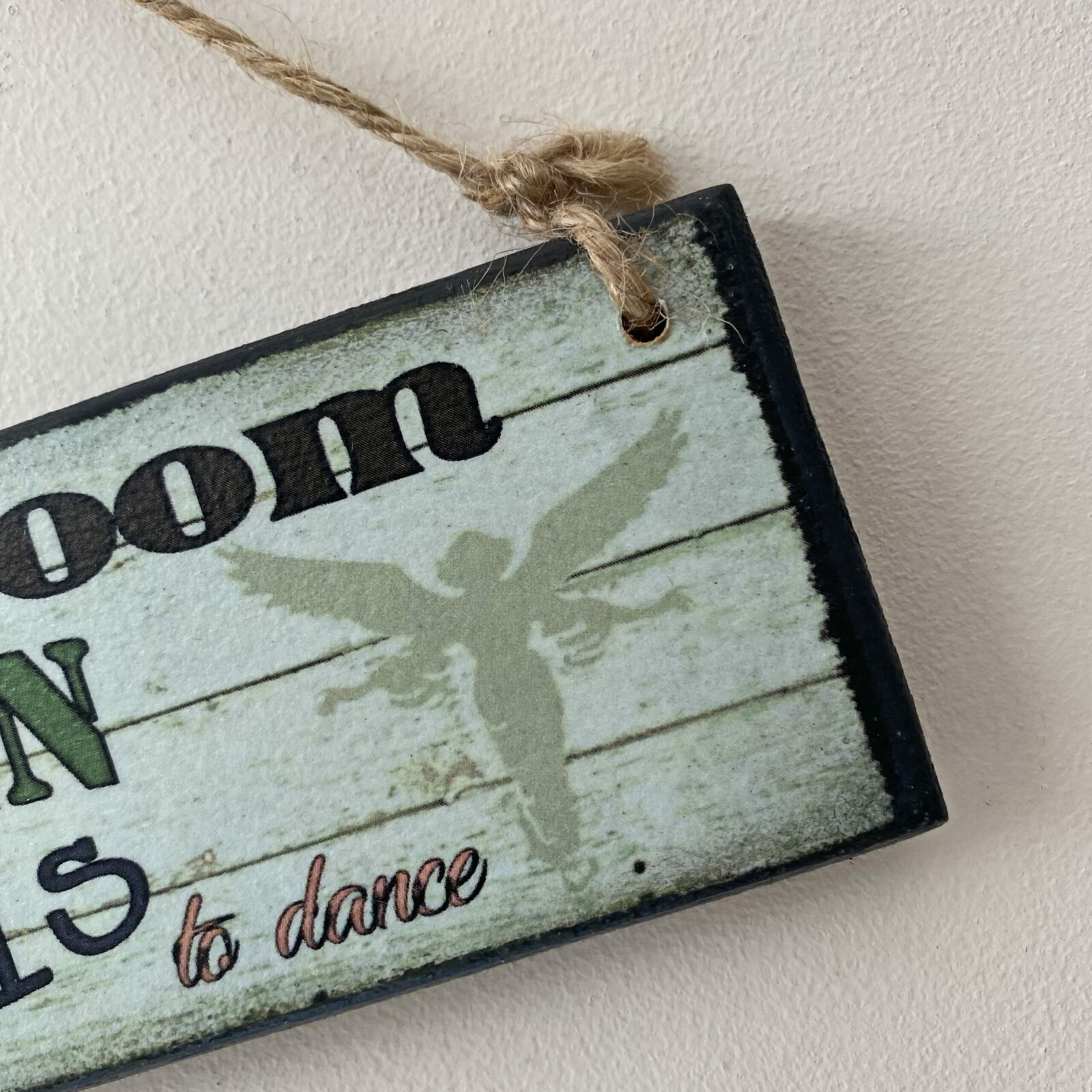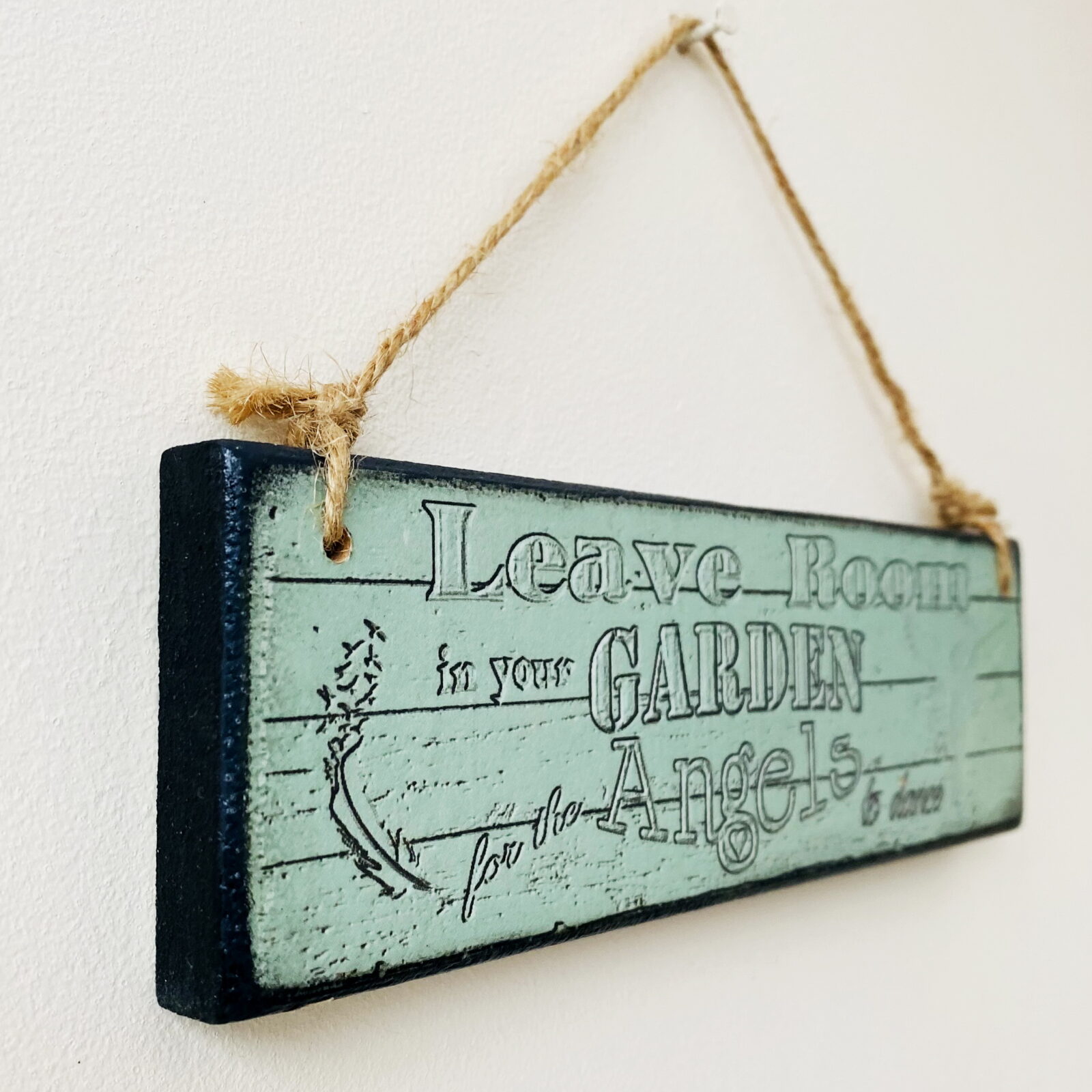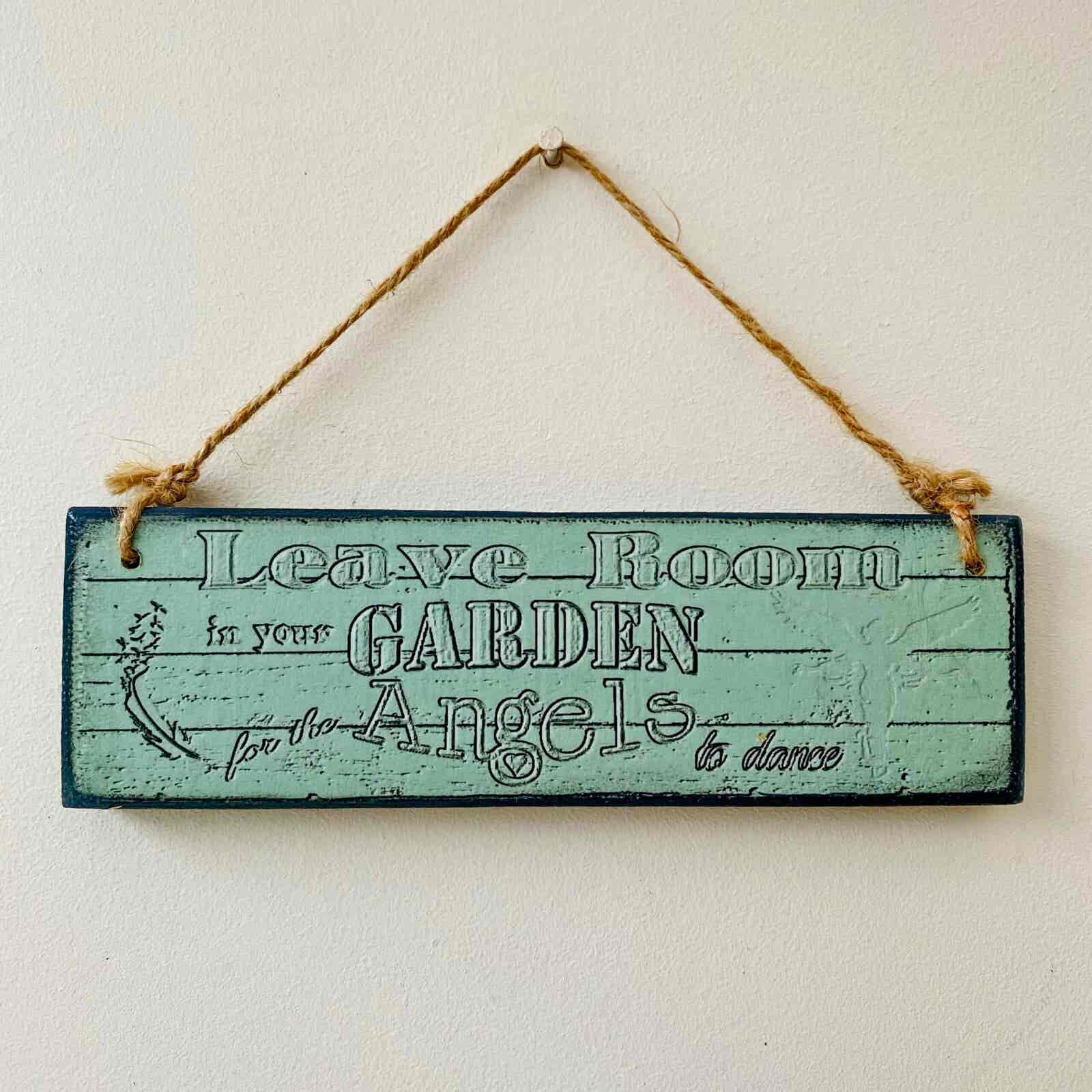This is a lovely wooden plaque with the wording “Leave room in your garden for the Angels to dance”. The design is a printed woodgrain effect, with an angel detail one end, and a feather and birds detail the other end. The wording compliments the design beautifully, and will look lovely hanging by the back door, overlooking the garden.
