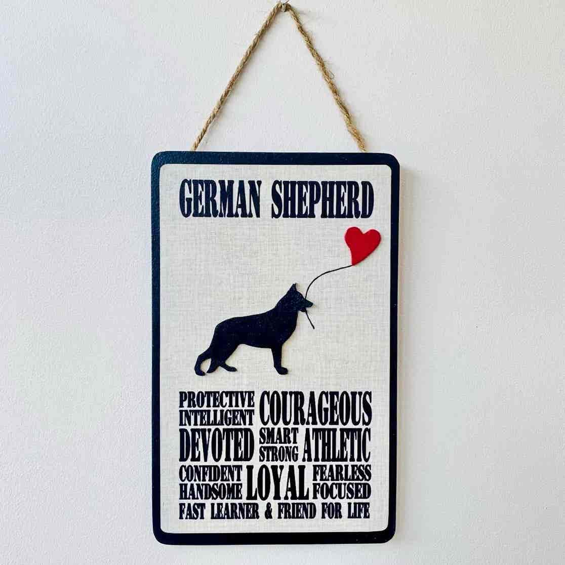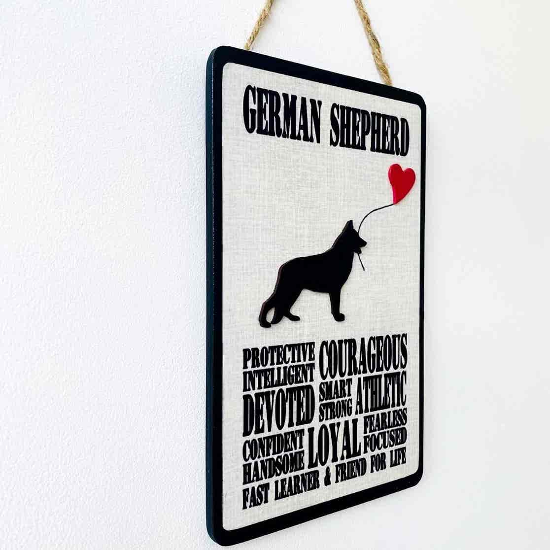 An original design, handmade typography plaque, detailing the characteristics of a German Shepherd dog.