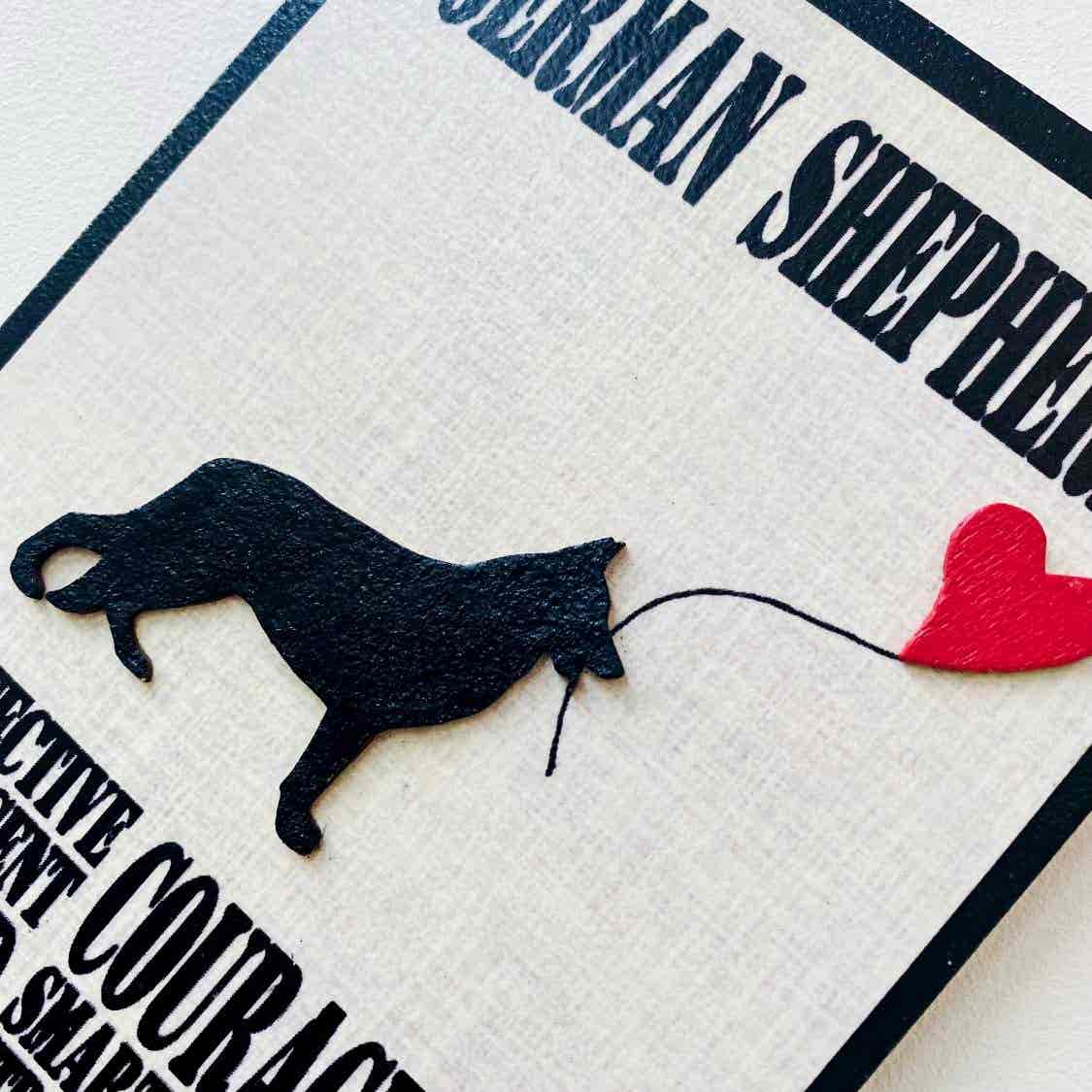 Beautifully finished, with a machine cut embossed German Shepherd silhouette and heart to compliment the design.