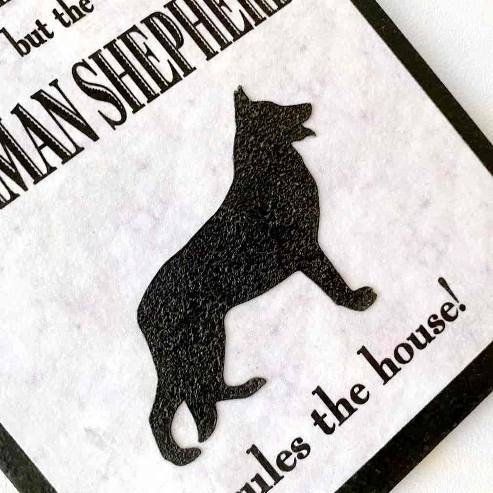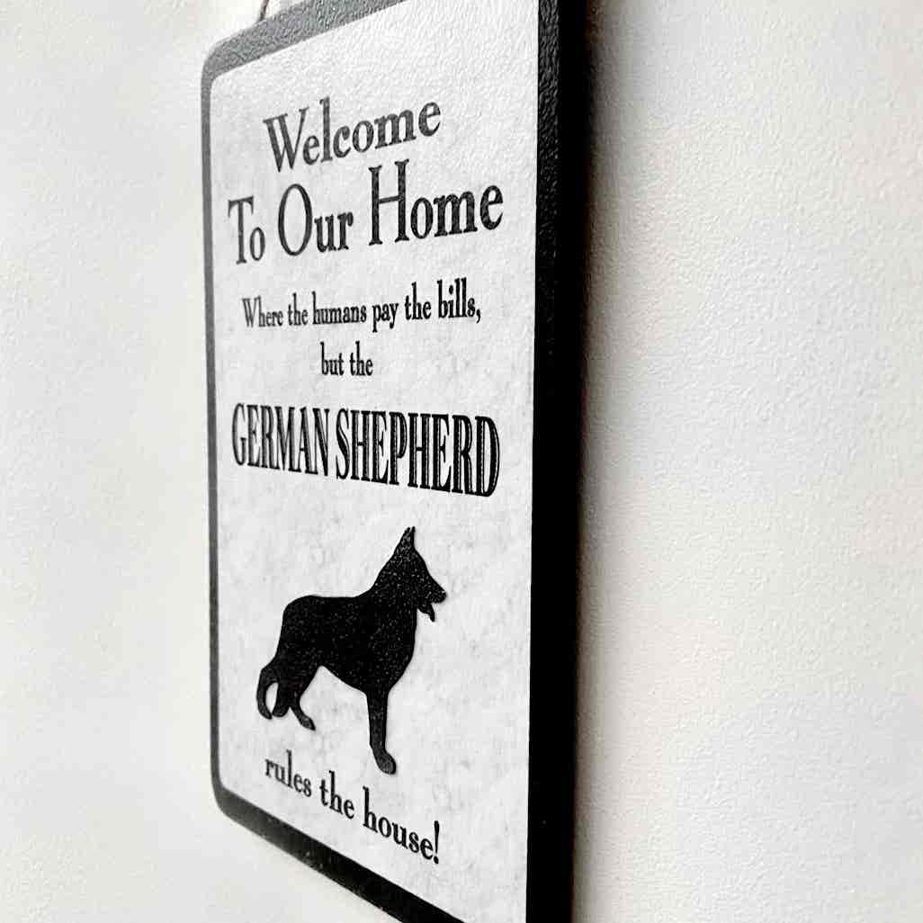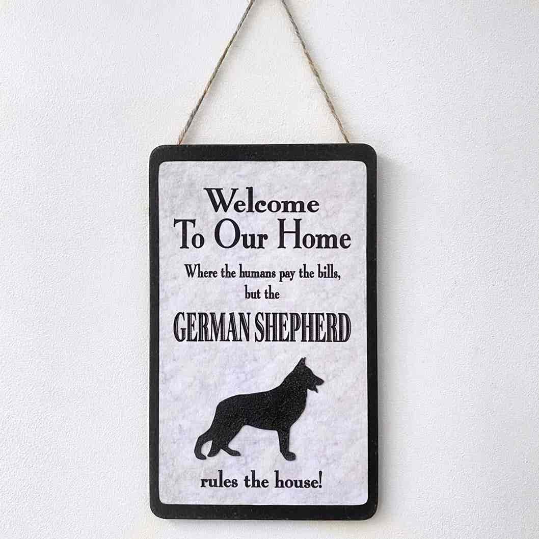 An original design, handmade “Welcome to Our Home” plaque, featuring a German Sherpherd.