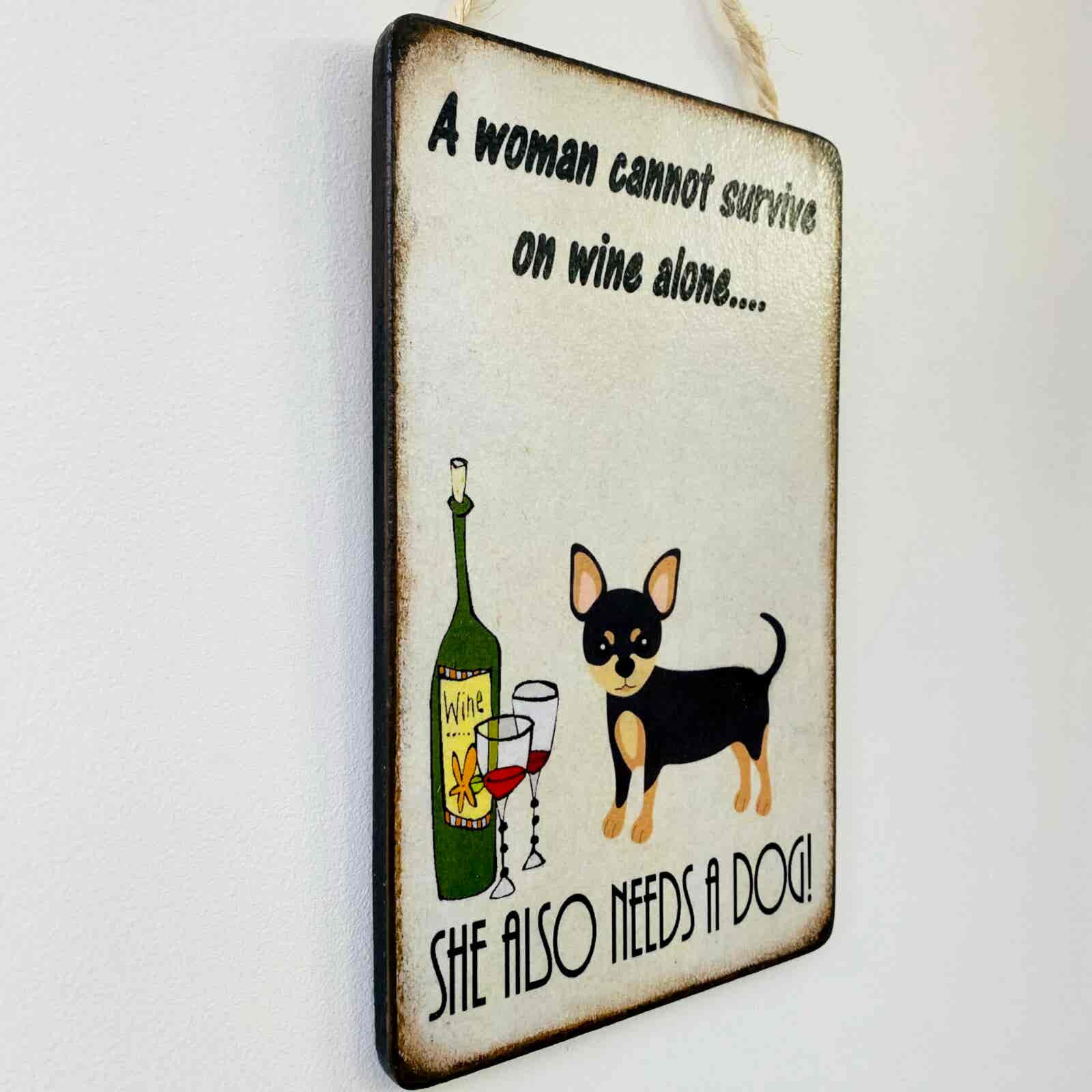 An original design, handmade plaque, featuring a humorous “cannot survive” quotation, a dog character, and the wine!