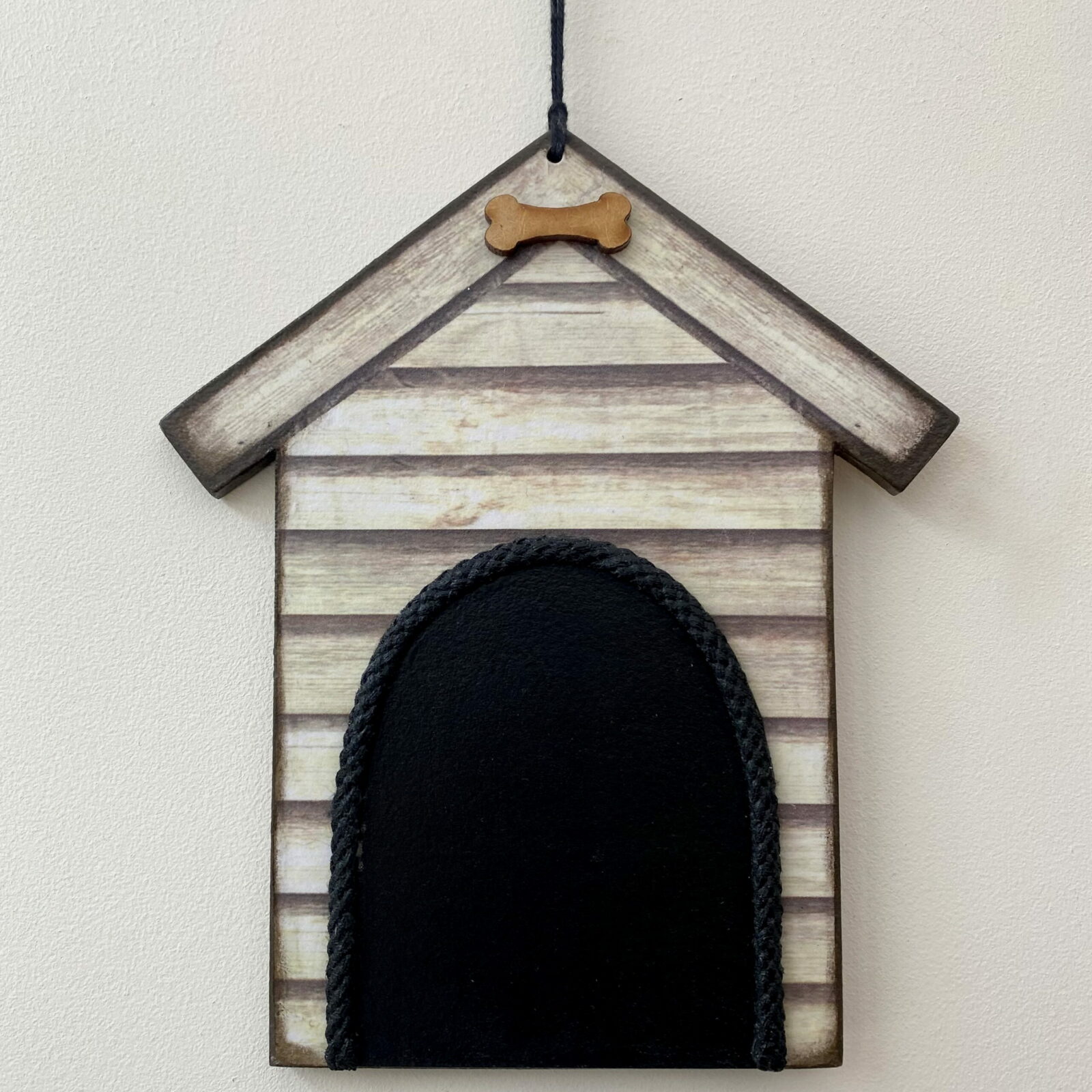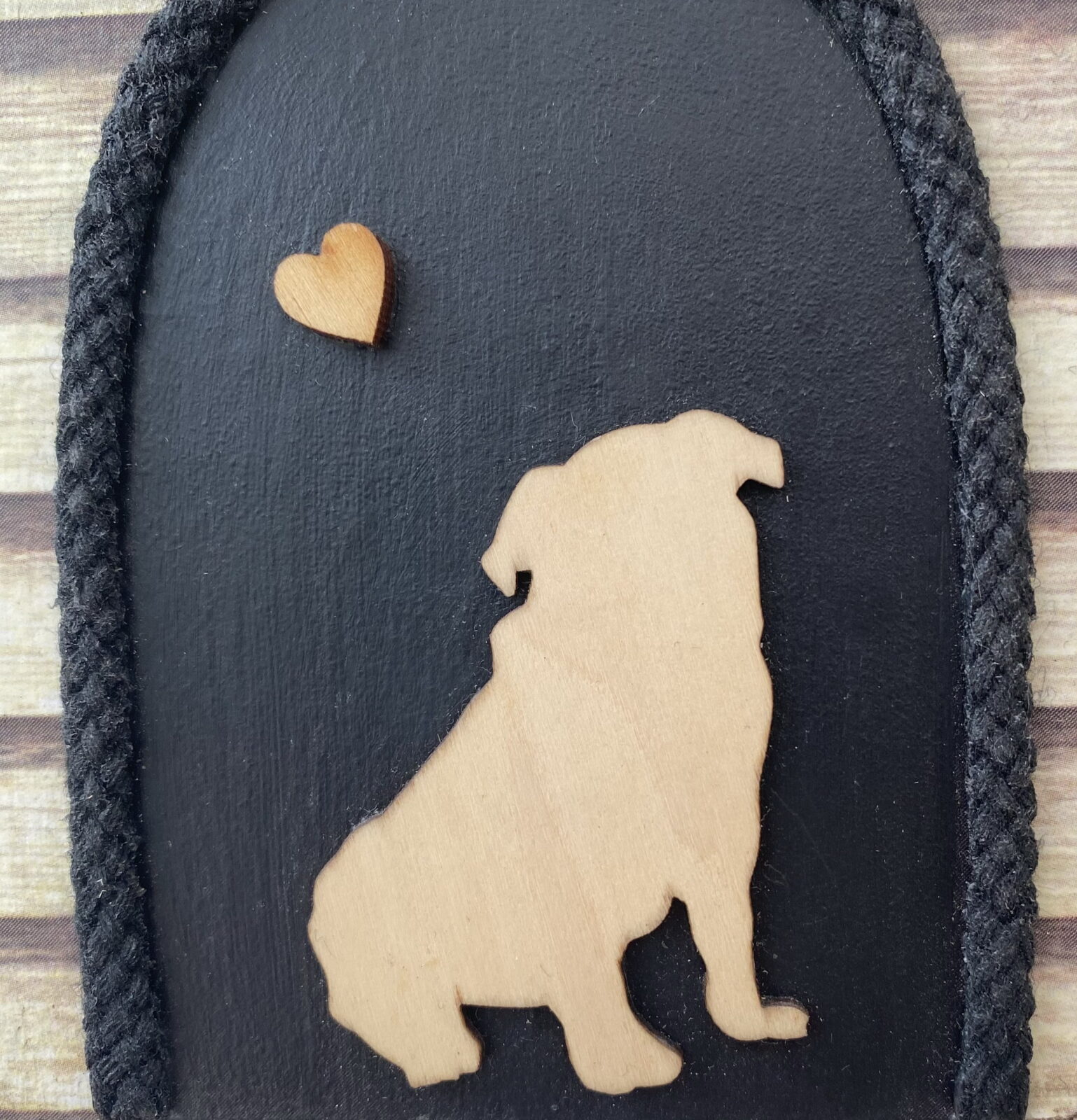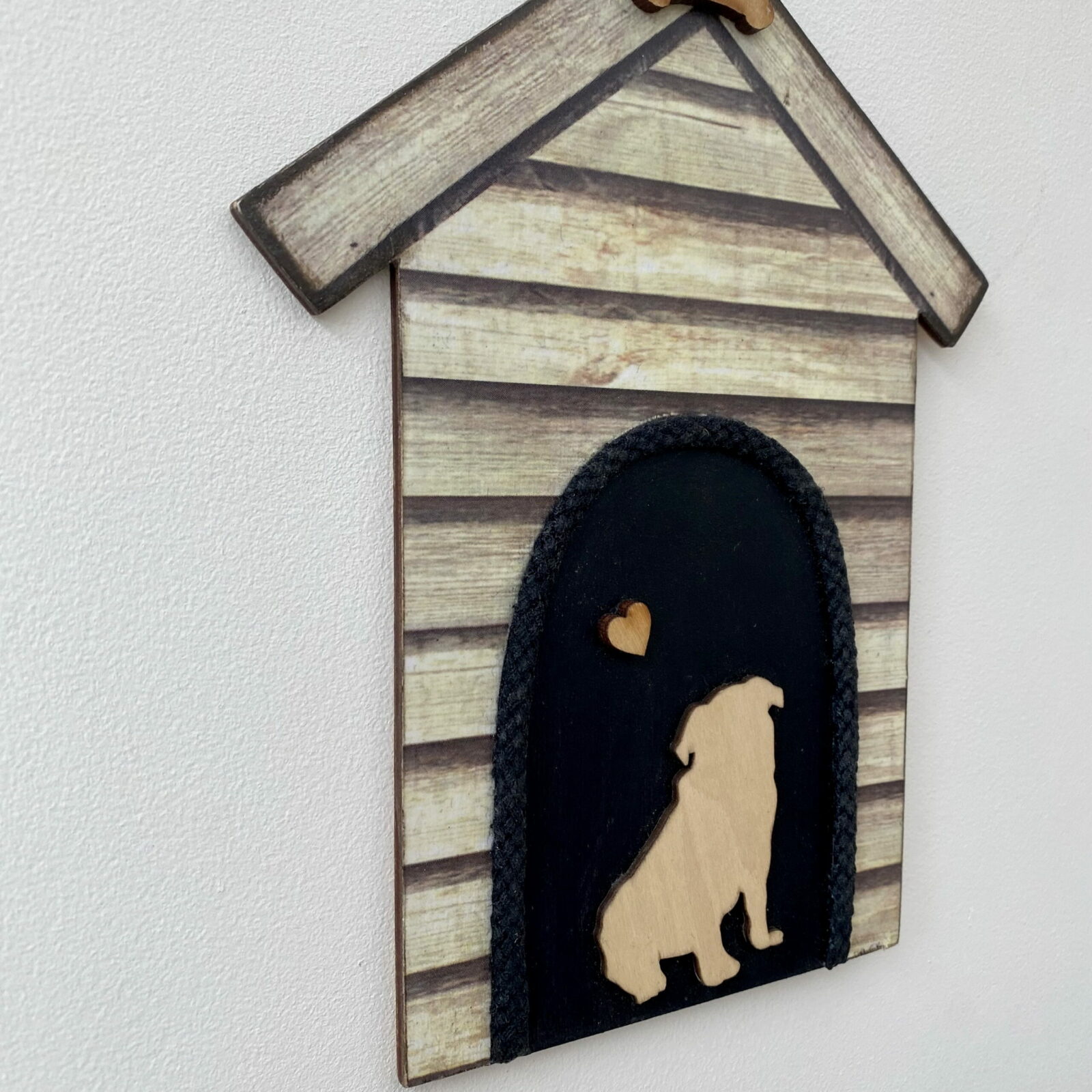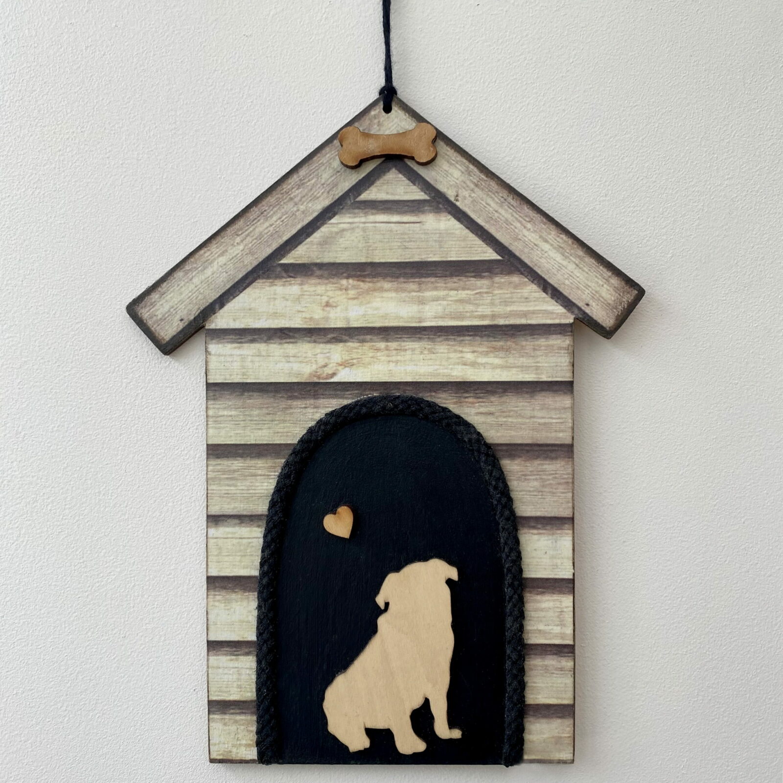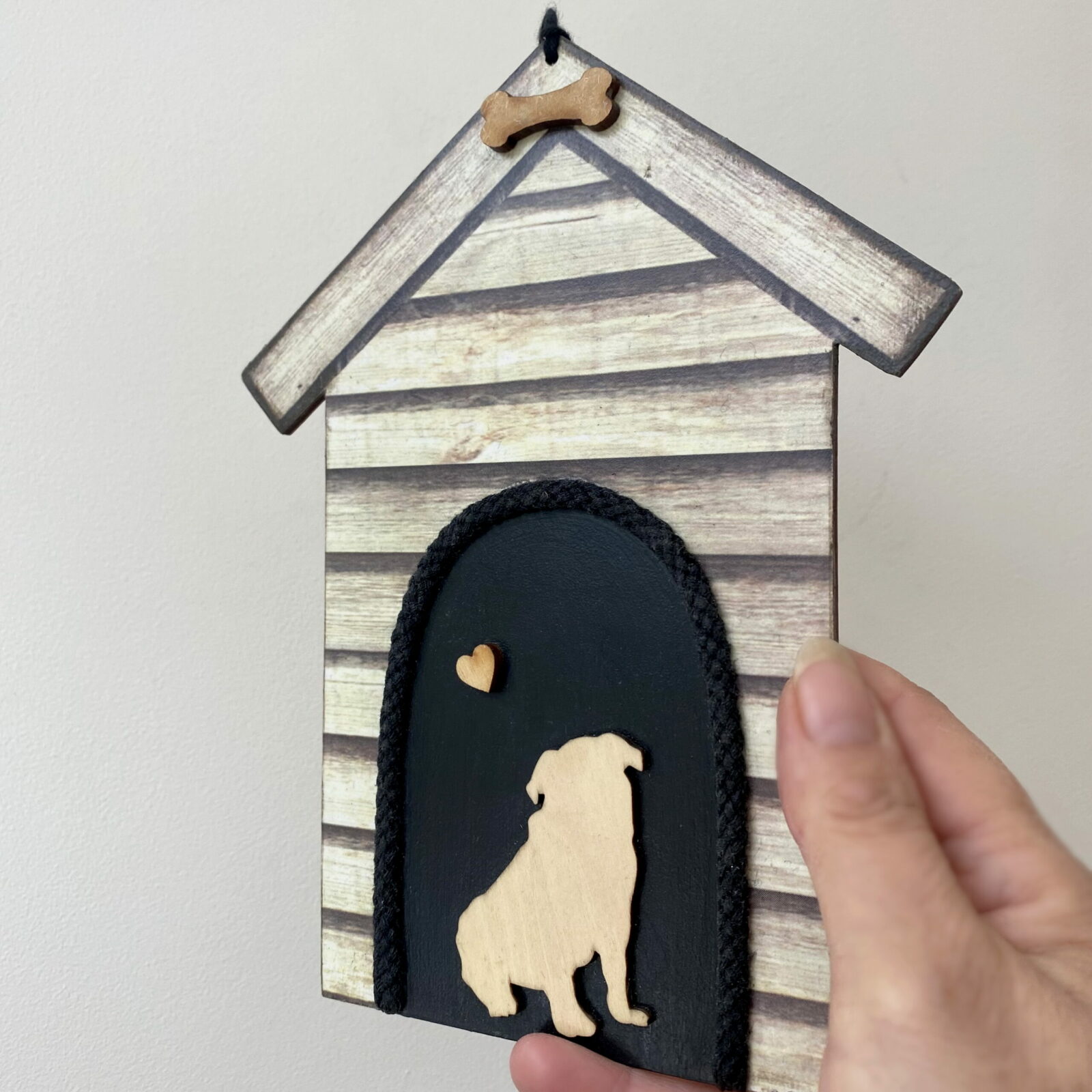 My own design kennel has a wooden Pug and small heart inside the ‘kennel’, with a wooden bone at the top. The black kennel entrance has a thick black rope edging to compliment the design.