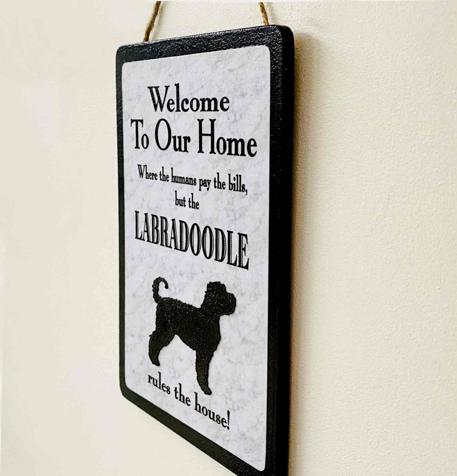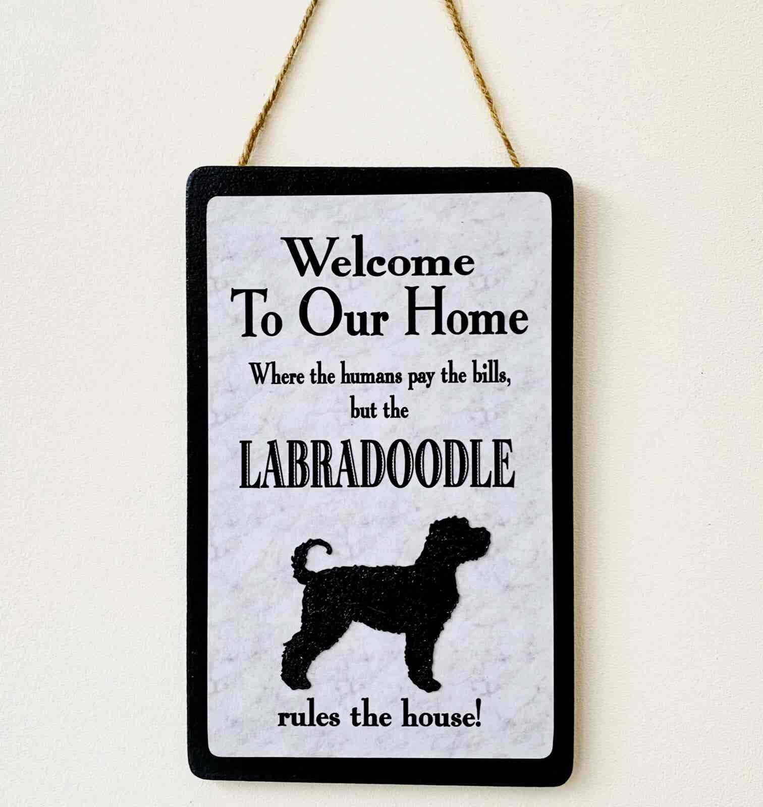 An original design, handmade “Welcome to Our Home” plaque, featuring a Labradoodle.