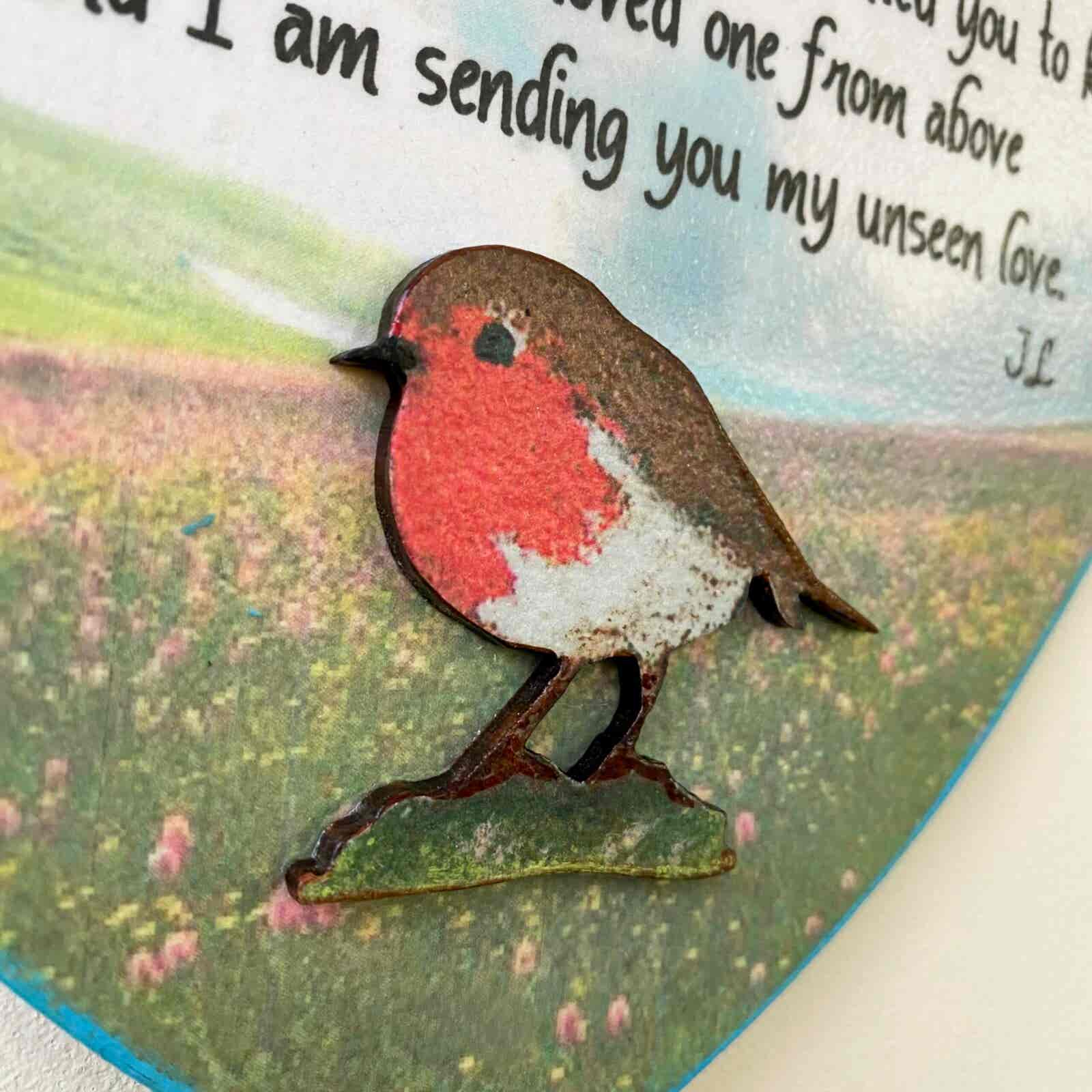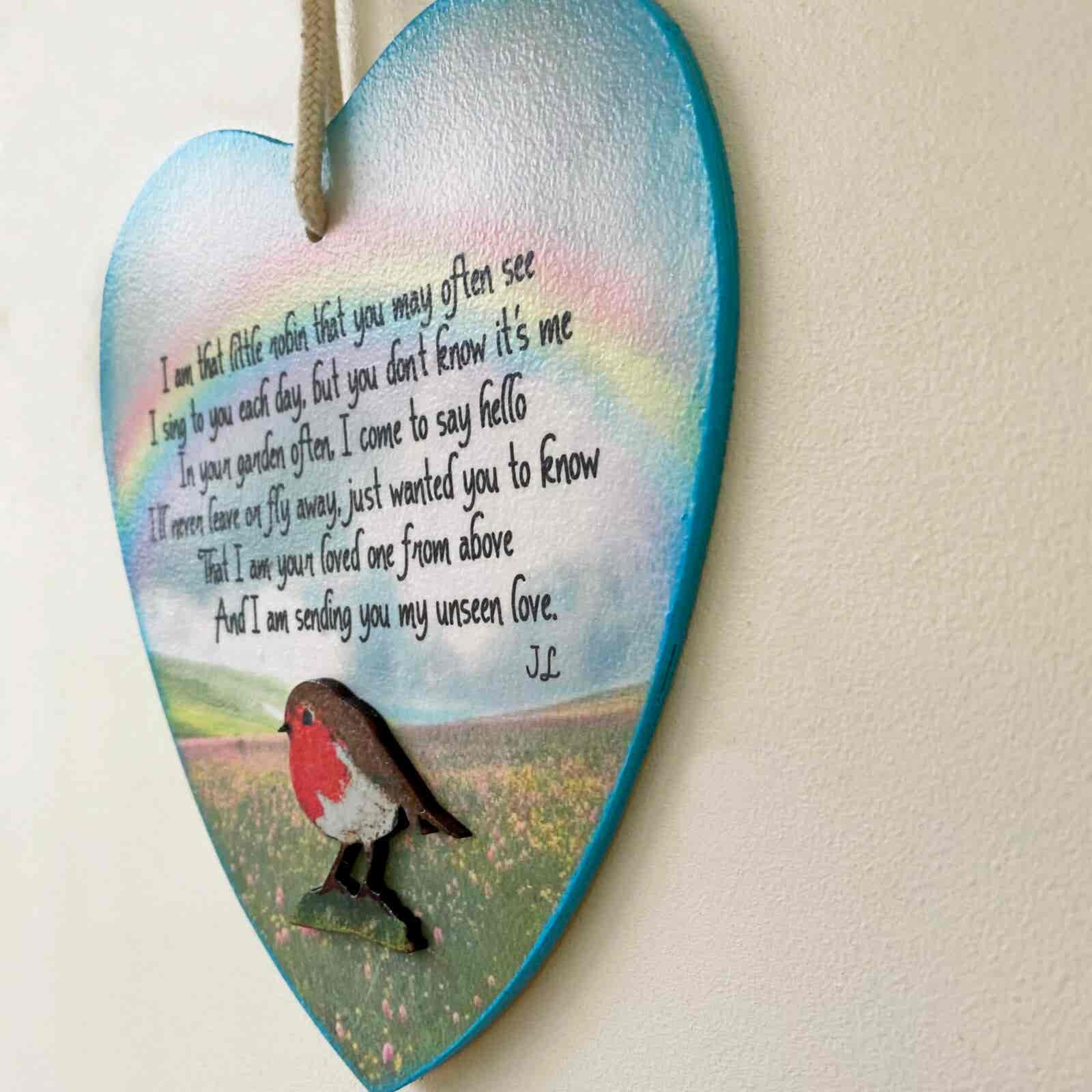 This is a beautiful wooden heart, with an original printed rainbow design and heartfelt poem, which is my own words. A wooden decorated robin has been added to compliment the design.