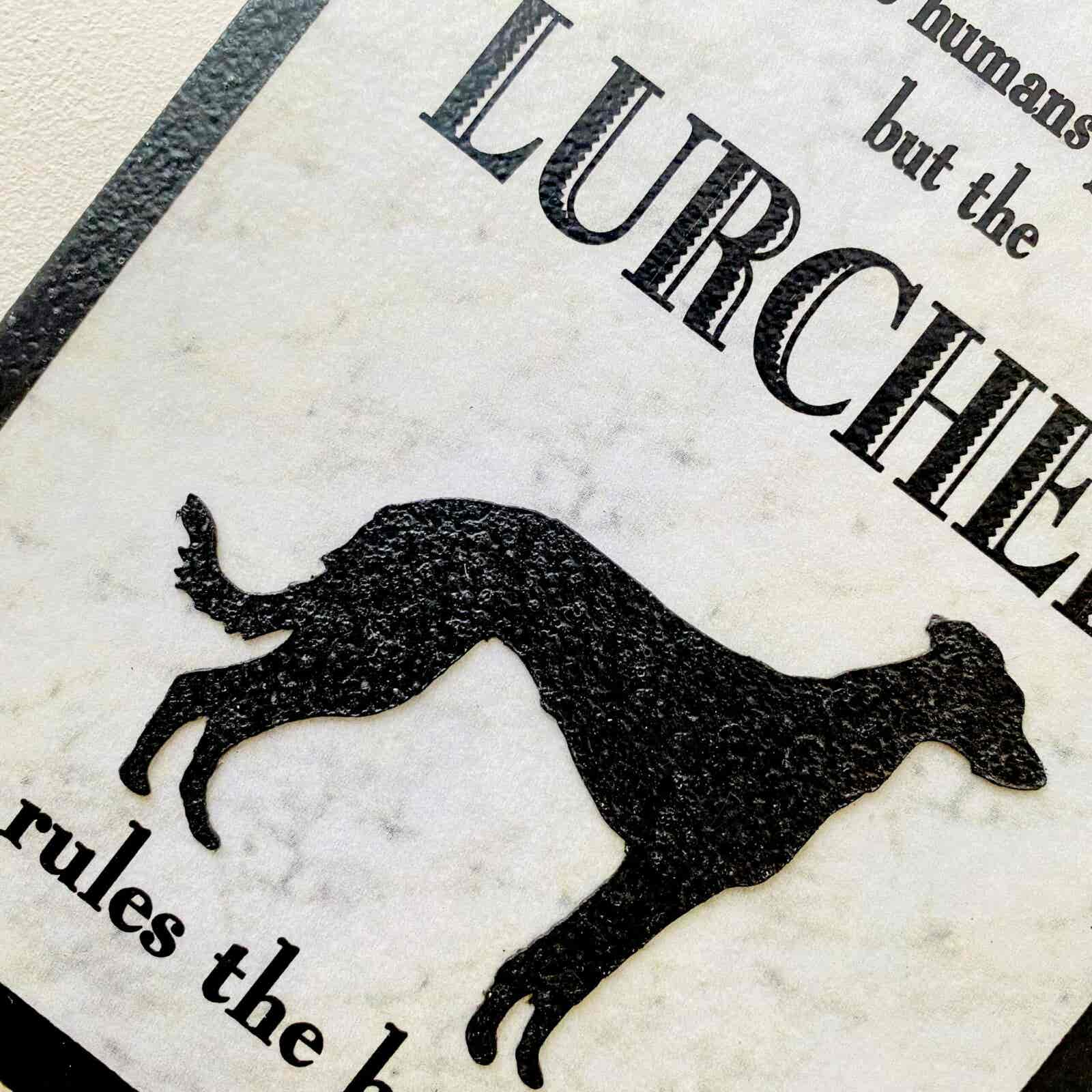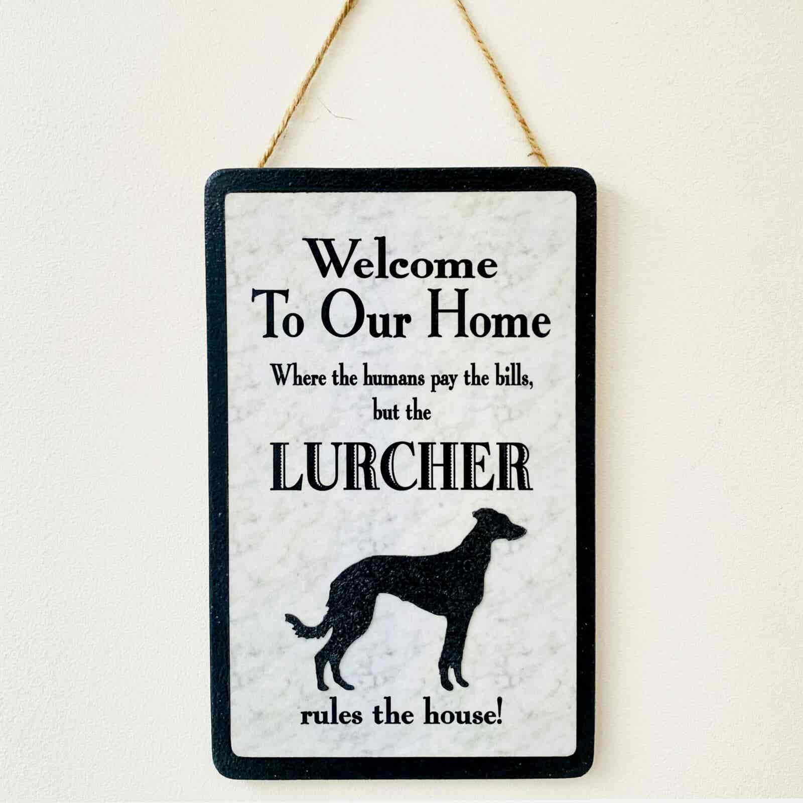 An original design, handmade “Welcome to Our Home” plaque, featuring a Lurcher.