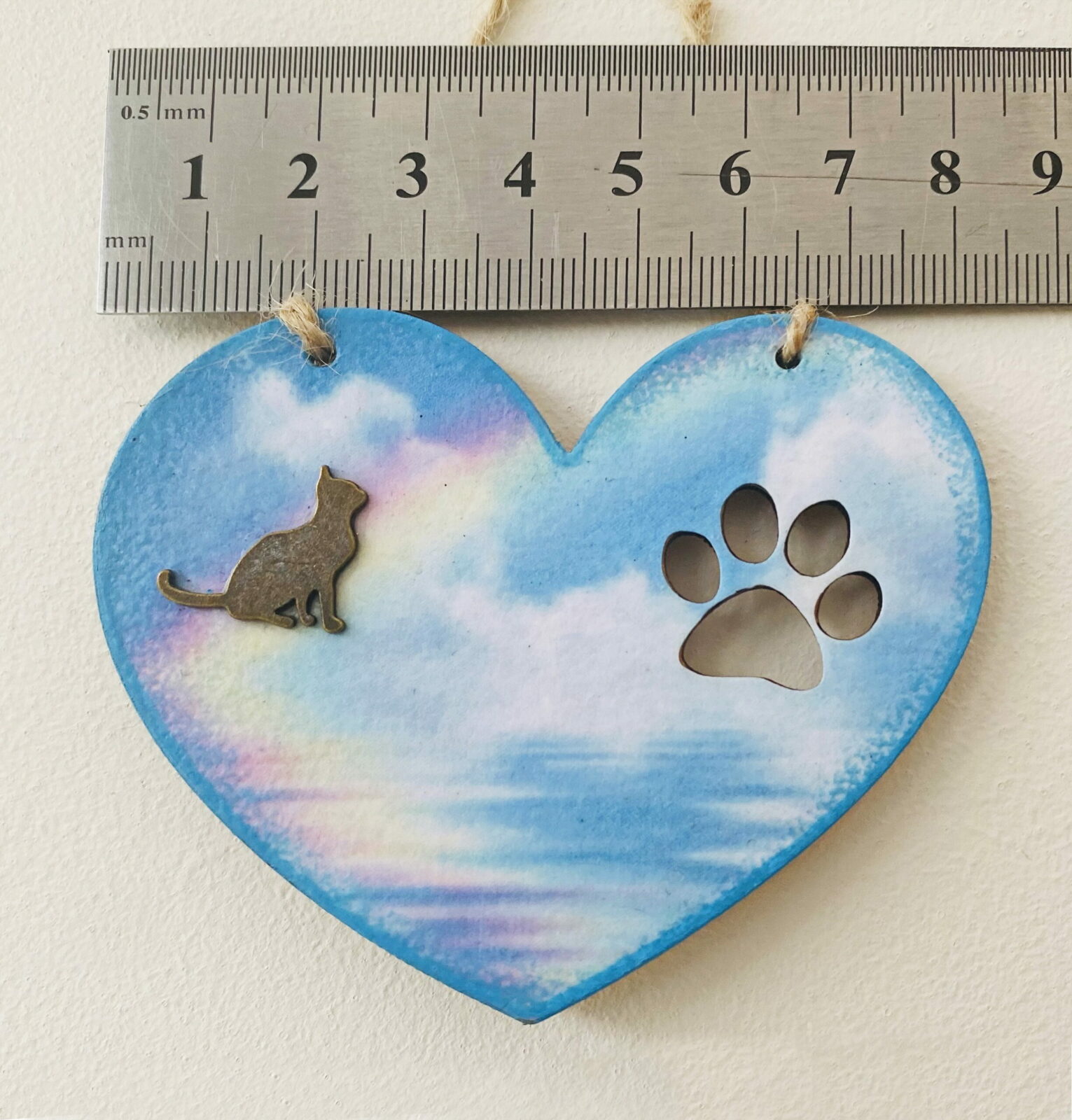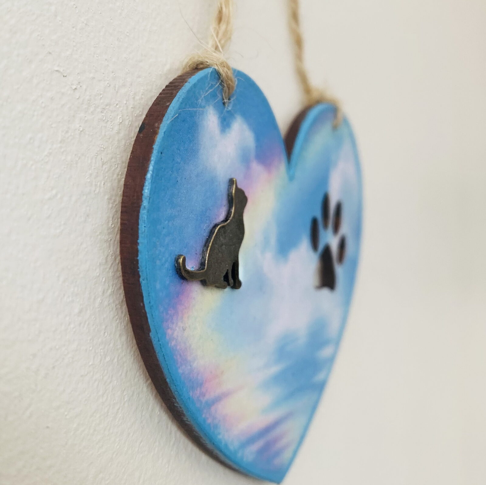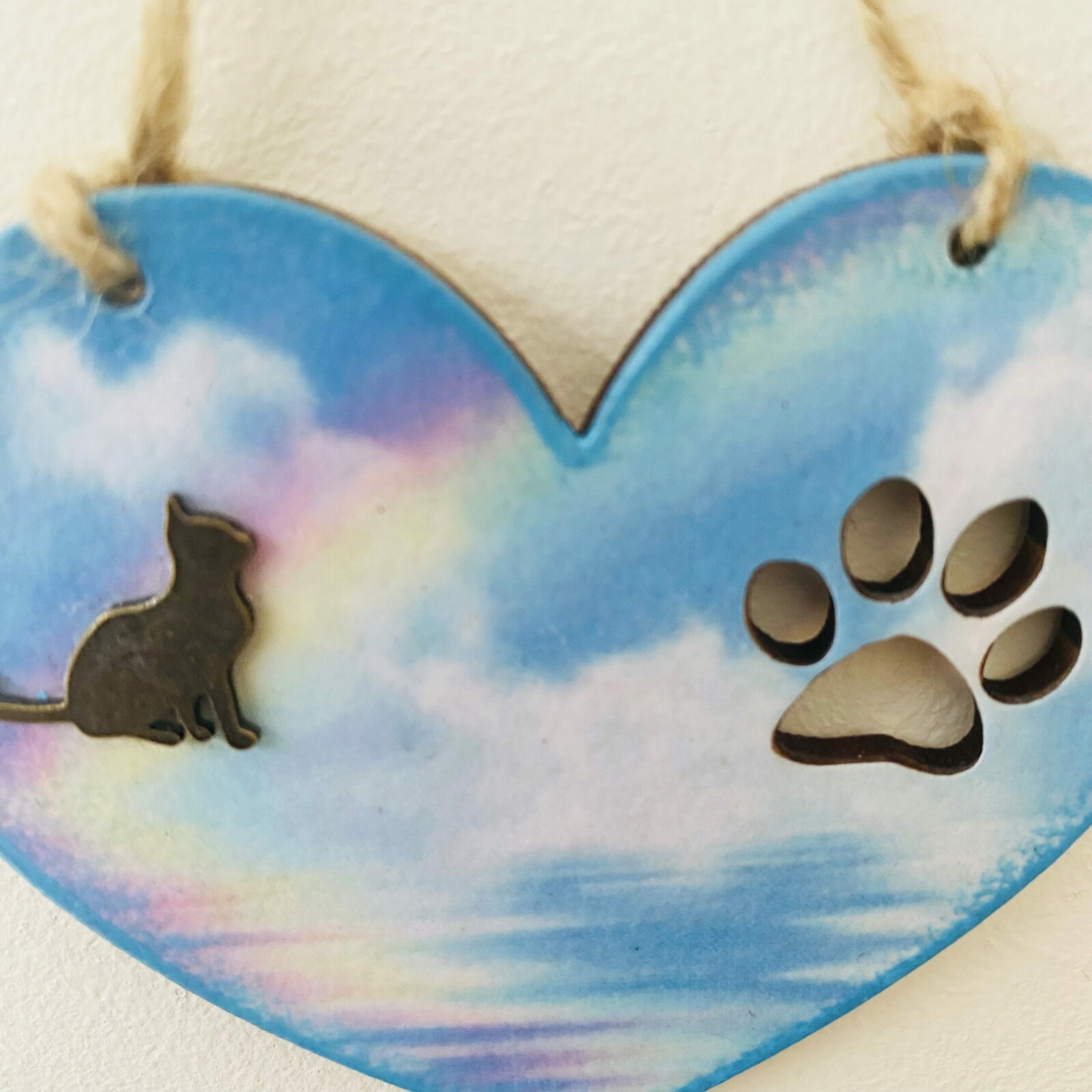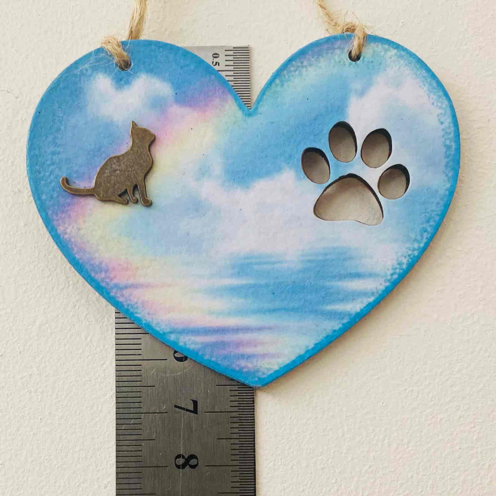 An original hanging heart memorial plaque, featuring a rainbow and a bronzed cat shape to compliment the design. There is also a cut out paw print.