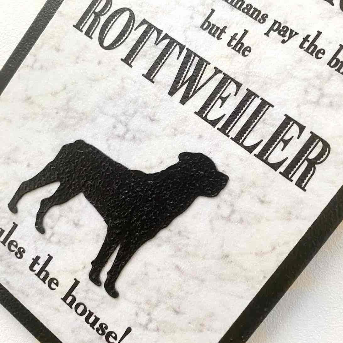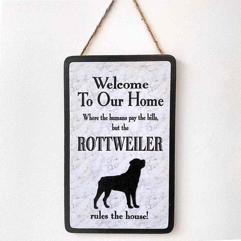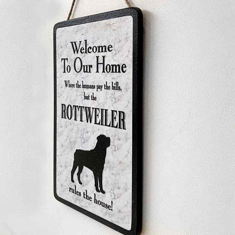 An original design, handmade “Welcome to Our Home” plaque, featuring a Rottweiler.