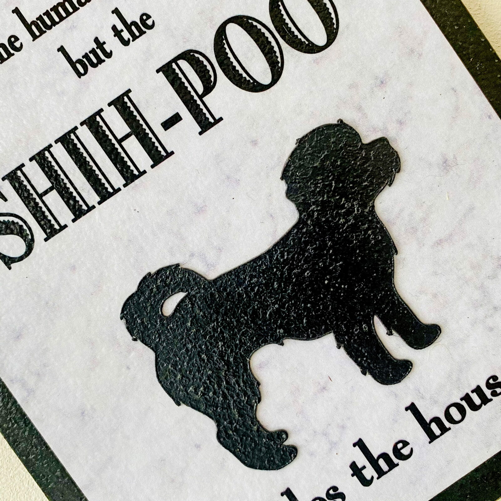 An original design, handmade “Welcome to Our Home” plaque, featuring a Shih-Poo.
