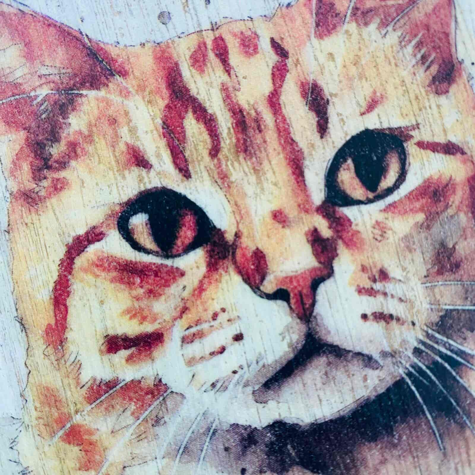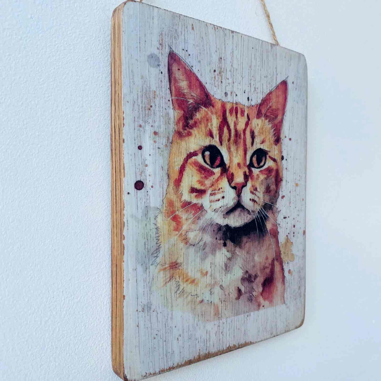 This is a beautiful hand made original design hanging plaque. Made from recycled oak panelling, the background has been painted and distressed, and the featured cat – a Ginger cat, has a hand painted water colour appearance.