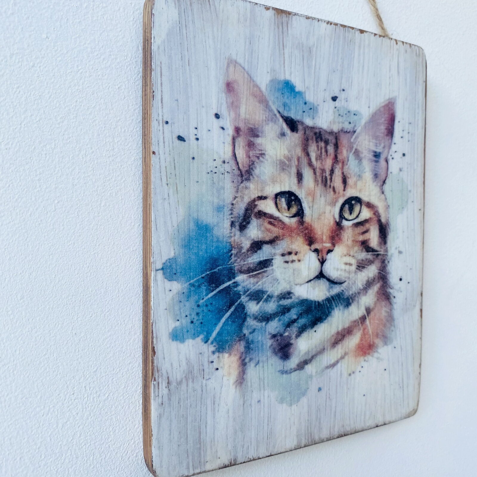 This is a beautiful hand made original design  hanging plaque. Made from recycled oak panelling, the background has been painted and distressed, and the featured cat – a Ginger Tabby cat, has a hand painted water colour appearance.
