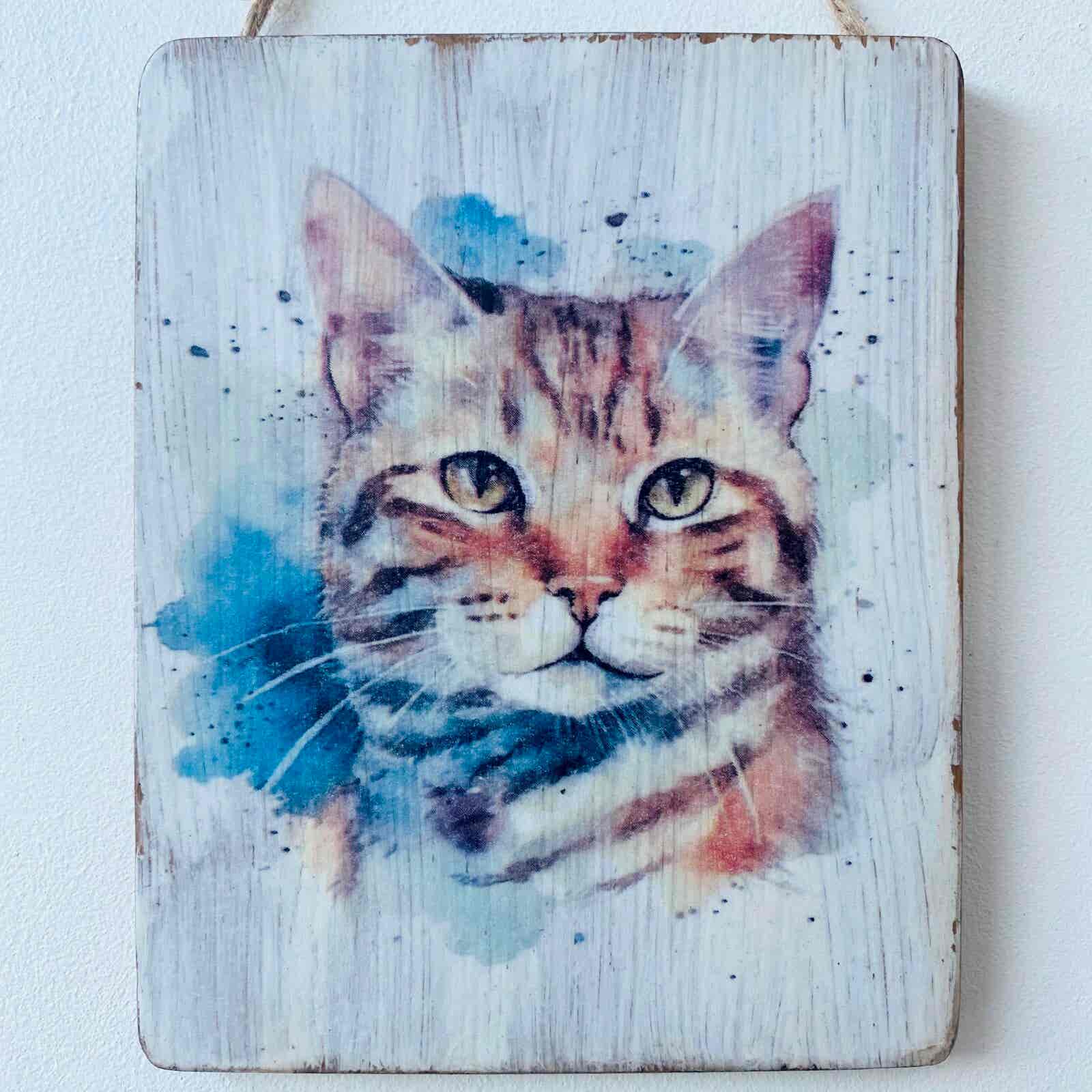 An original hanging plaque, featuring a beautiful water colour paint effect Ginger Tabby cat, on a distressed aged background.