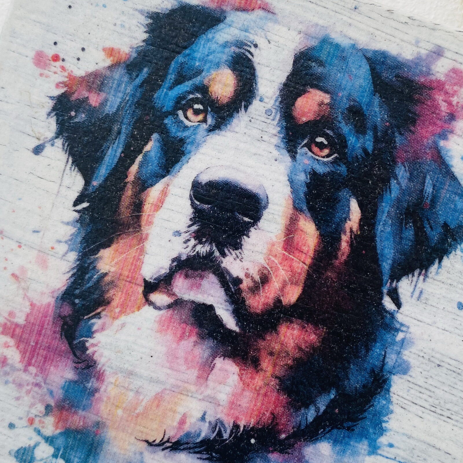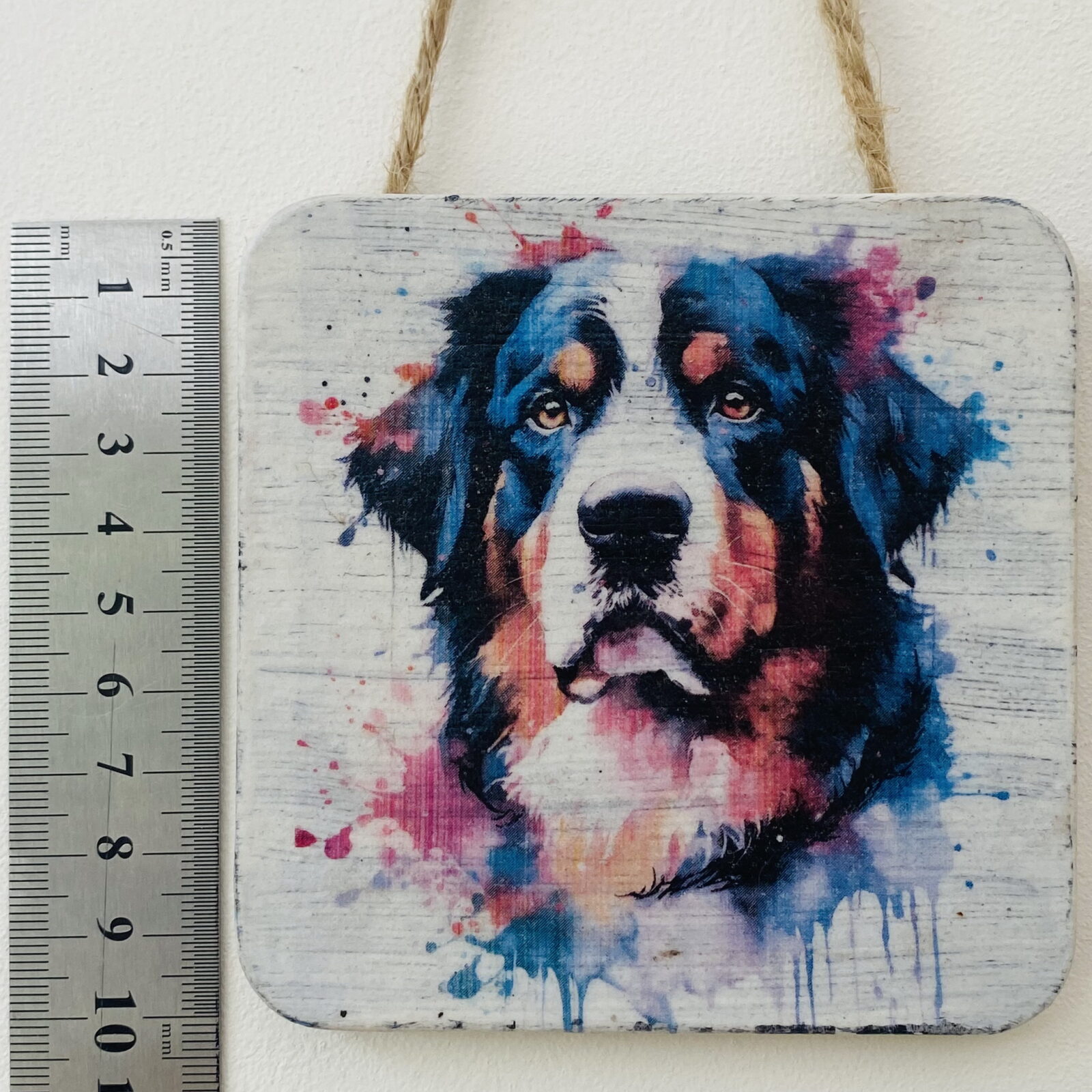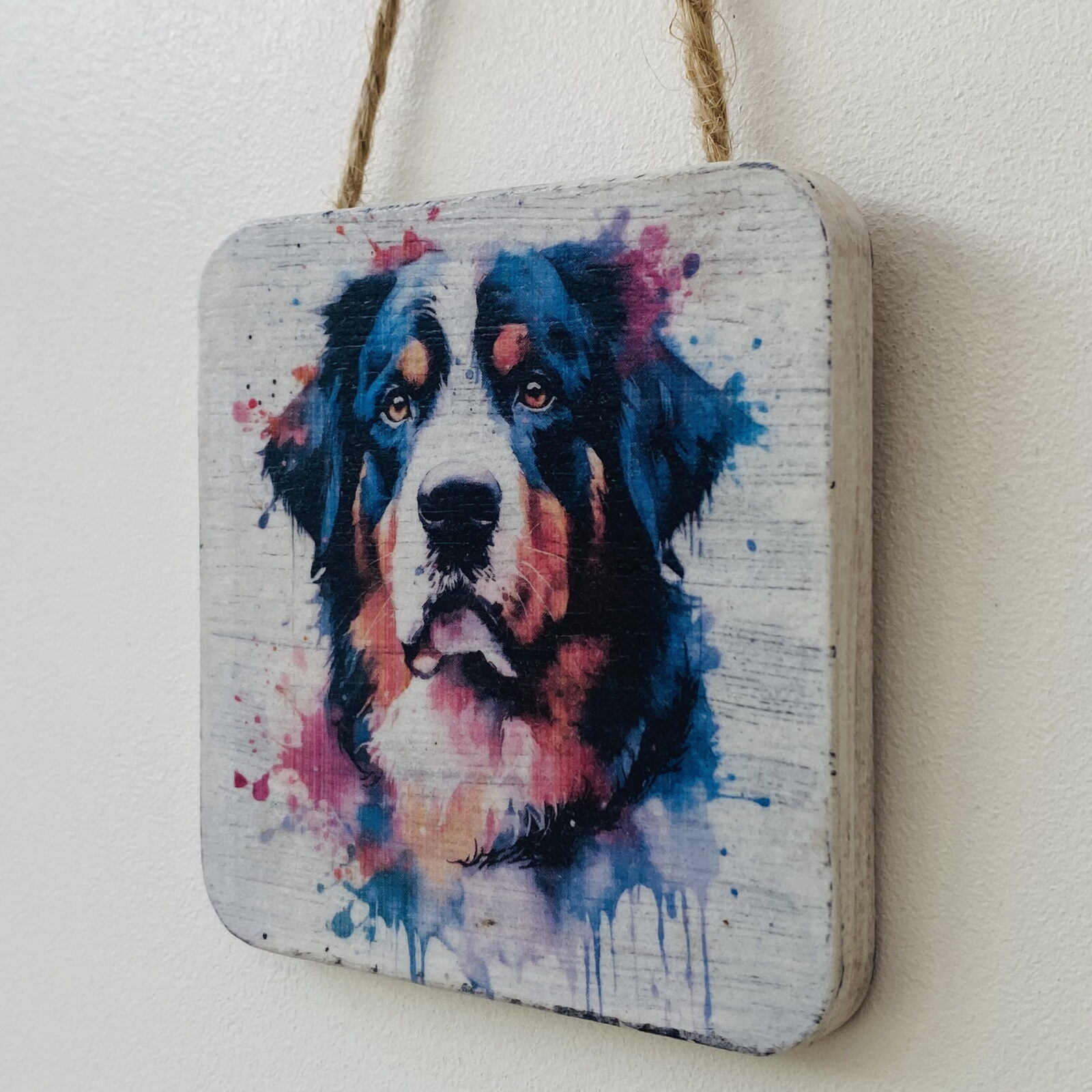This is a beautiful hand made original design hanging plaque. Made from recycled plaques, the background has been painted and distressed, and the featured dog breed – a Bernese Mountain Dog, has a colourful hand painted water colour appearance.