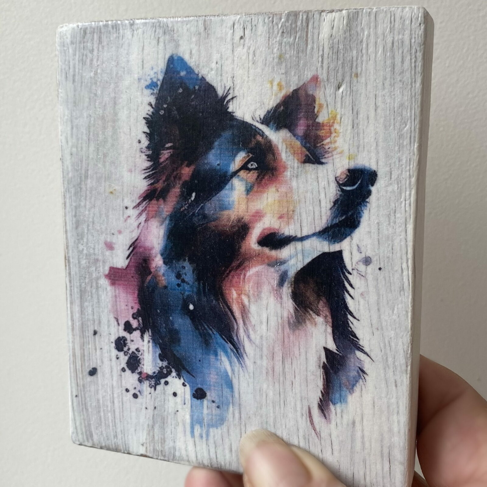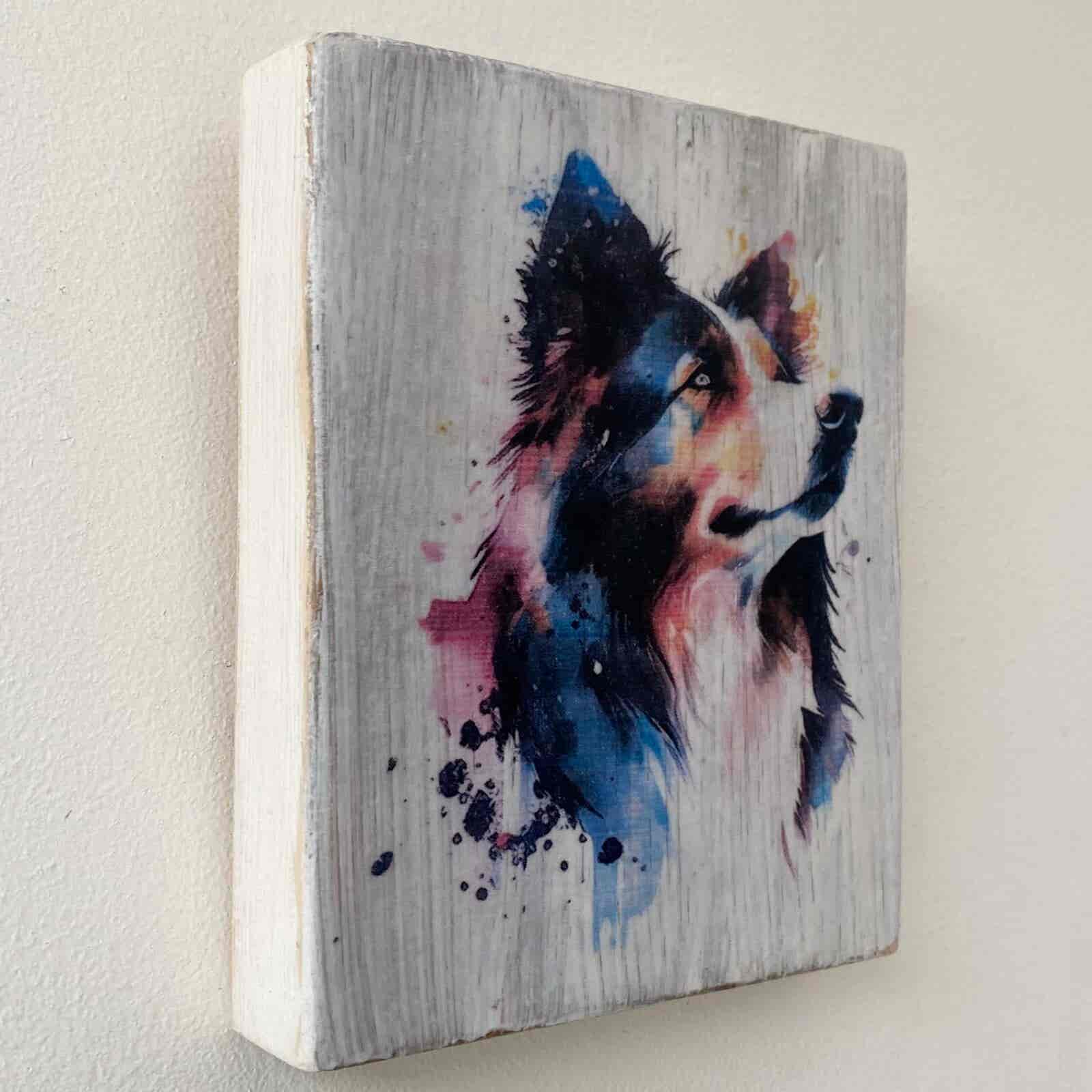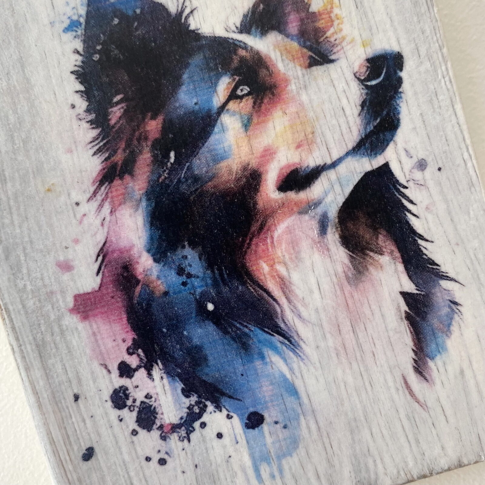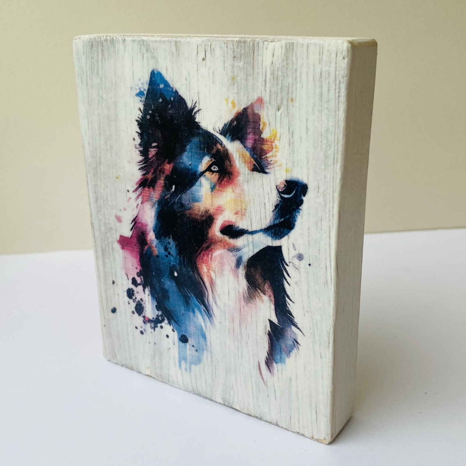 This is a beautiful hand made original design freestanding or hanging plaque. Made from recycled pine wood, the background has been painted and distressed, and the featured dog breed – a Border Collie, has a hand painted water colour appearance.