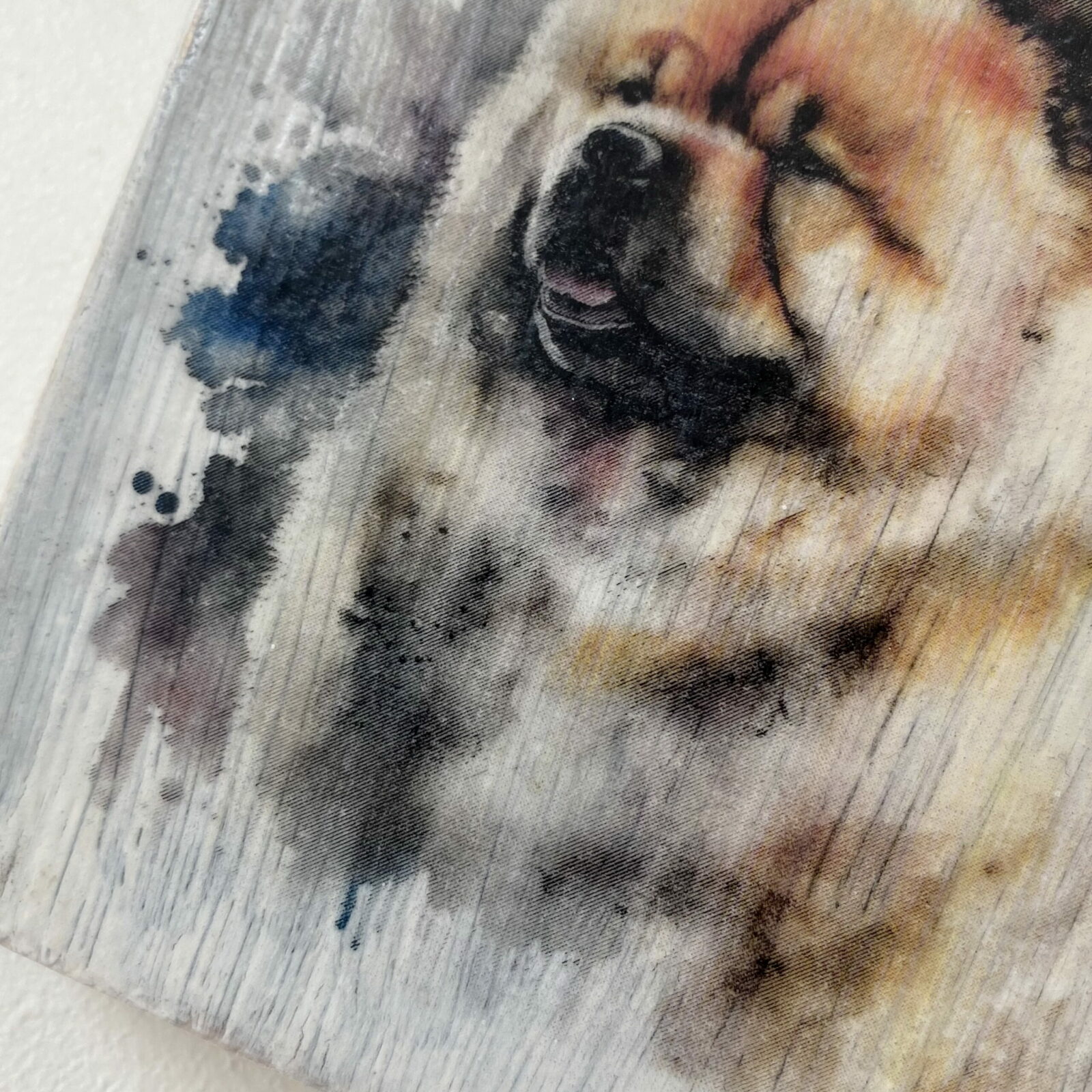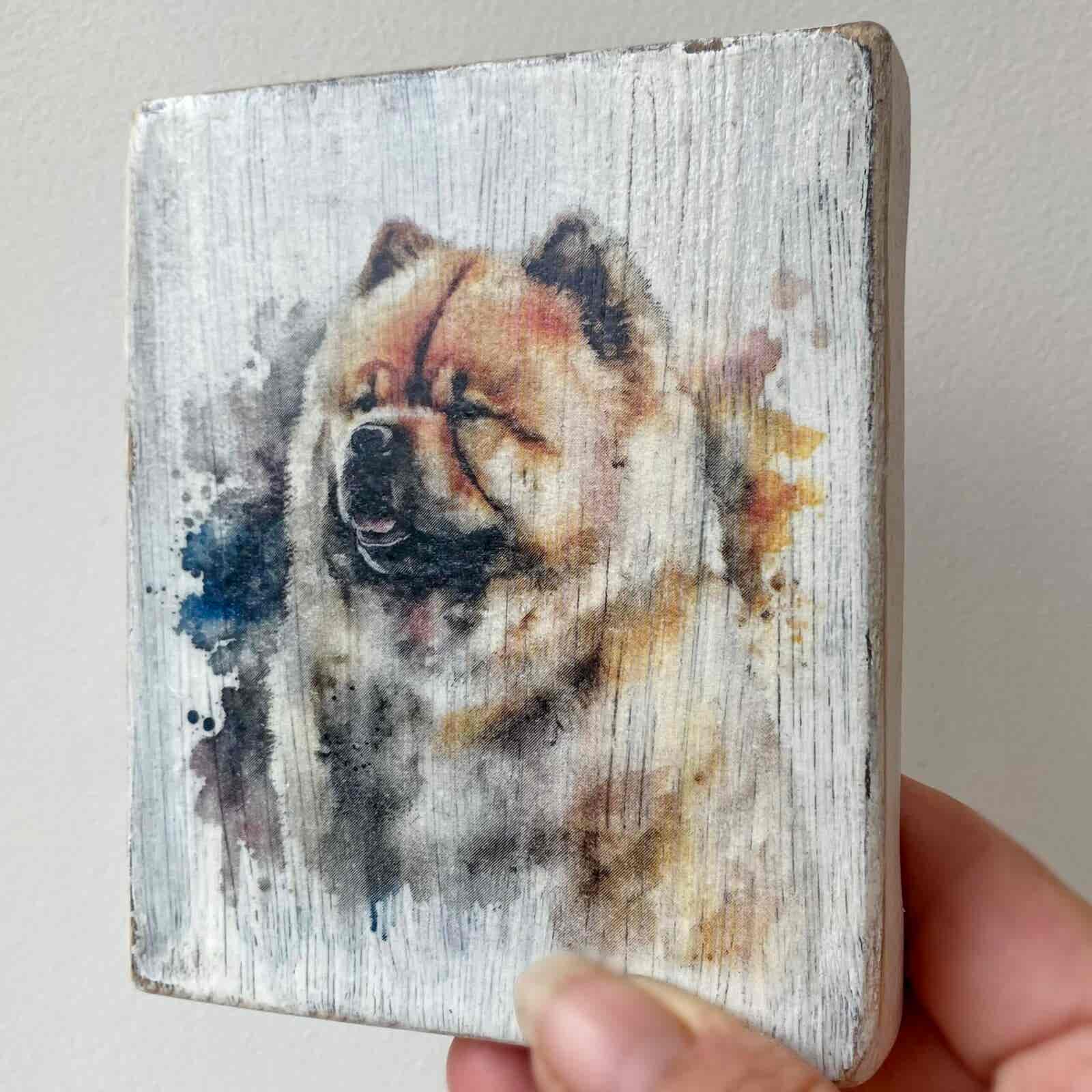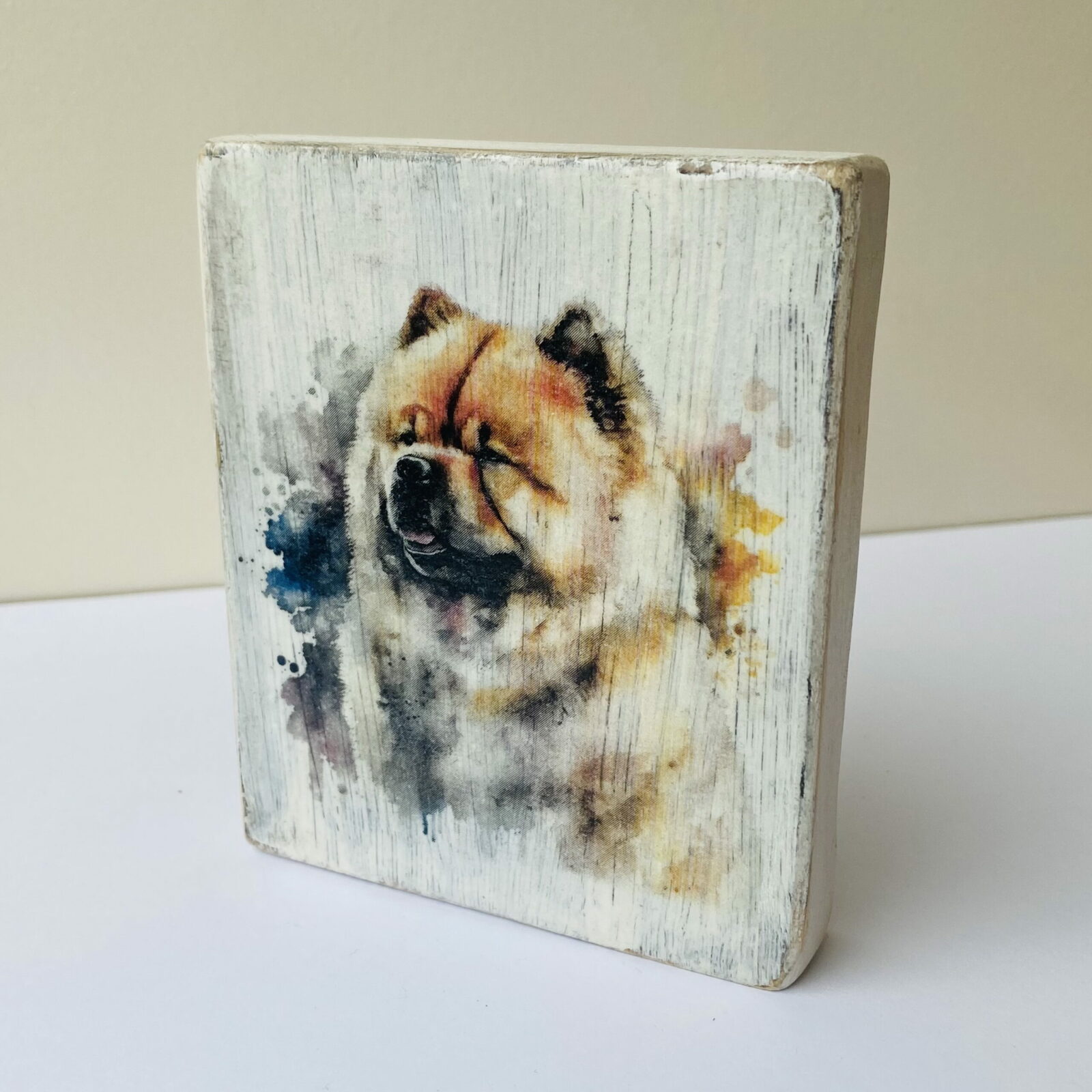 This is a beautiful hand made original design freestanding or hanging plaque. Made from recycled pine wood, the background has been painted and distressed, and the featured dog breed – a Chow Chow, has a hand painted water colour appearance.