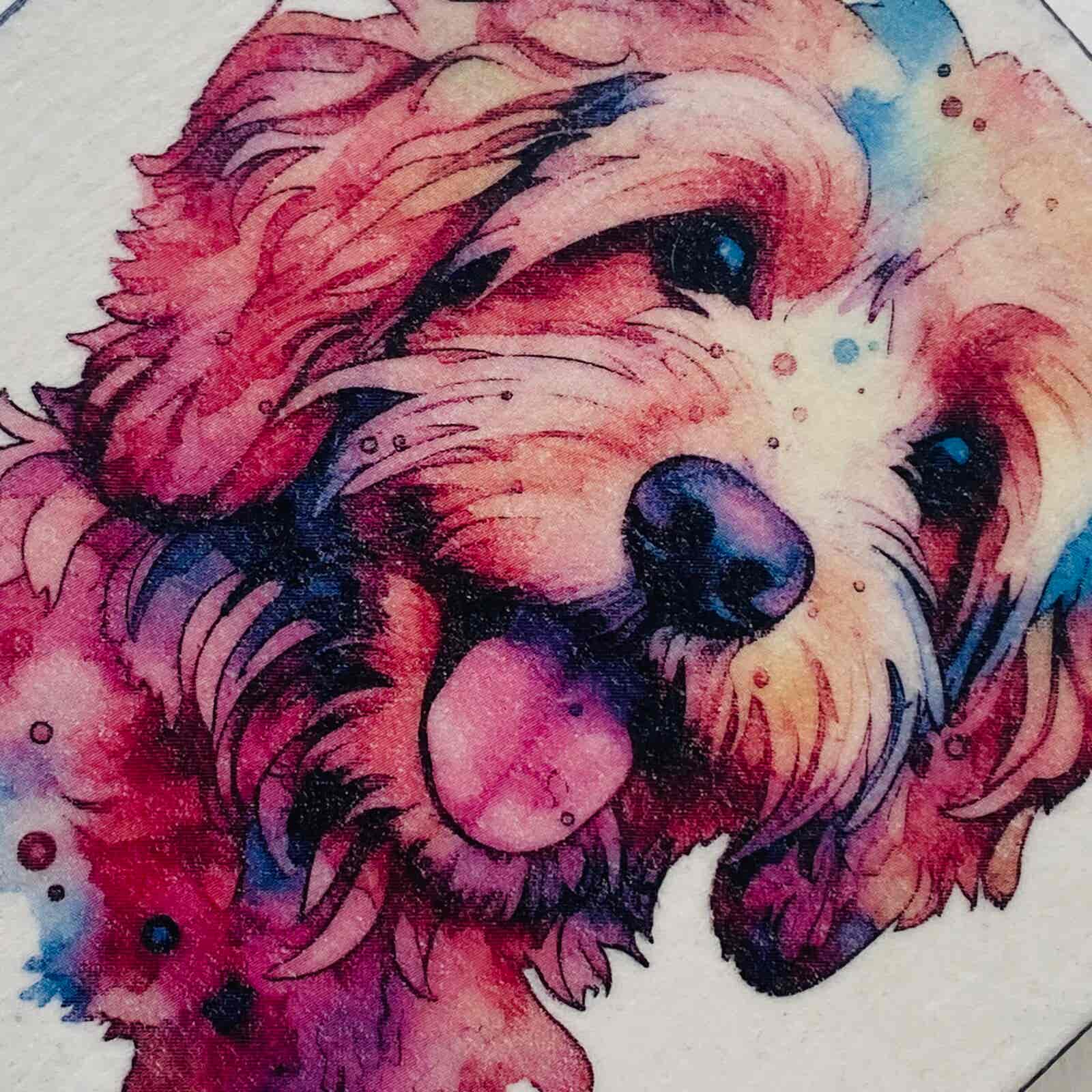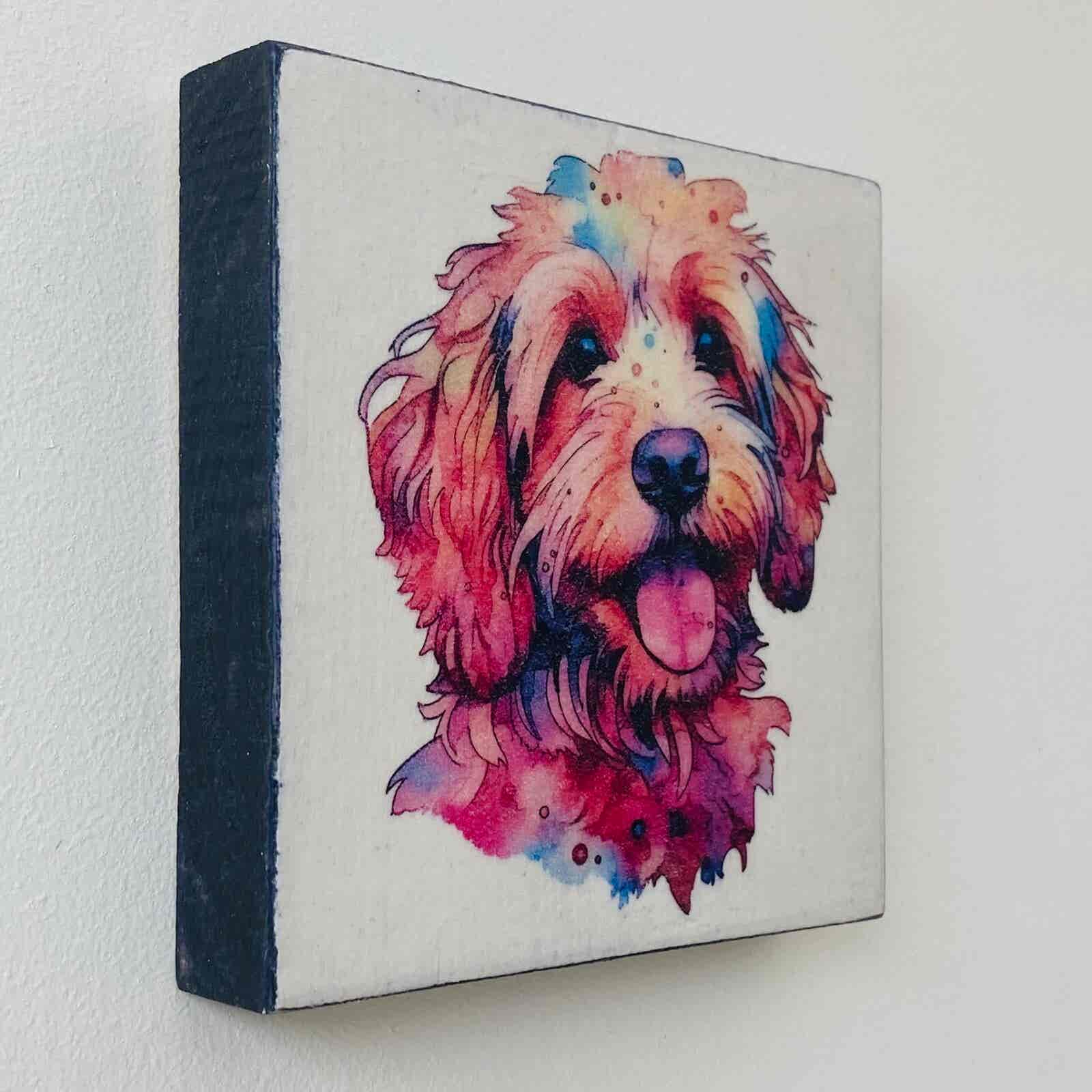 This is a beautiful hand made original design freestanding or hanging plaque. Made from recycled 18mm MDF, the background has been painted in a pale cream, with my own recipe chalk paint. The featured dog breed – a colourful Cockapoo/Cavapoo, has a hand painted water colour appearance.