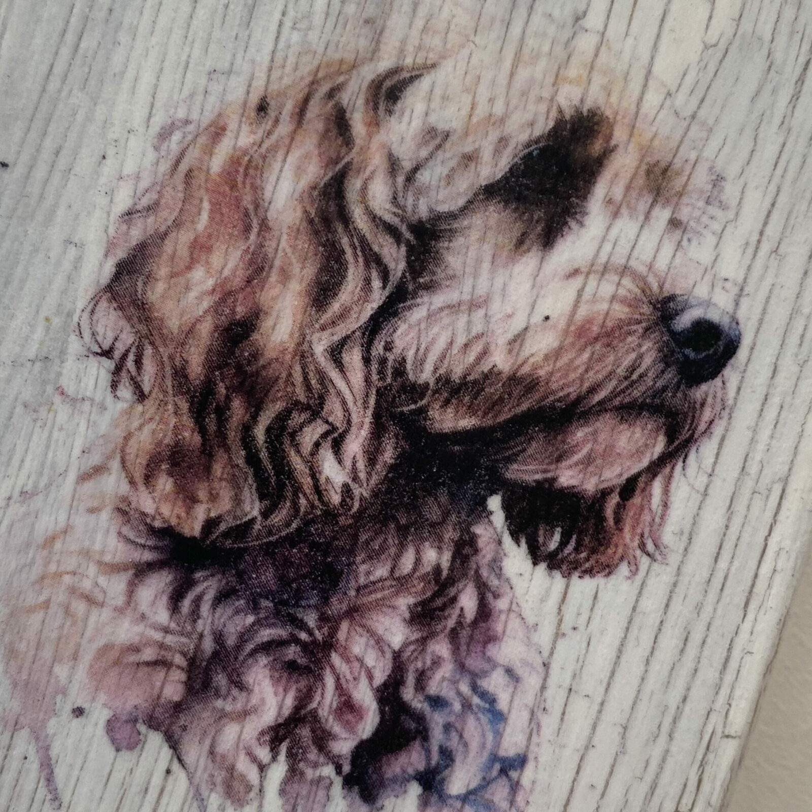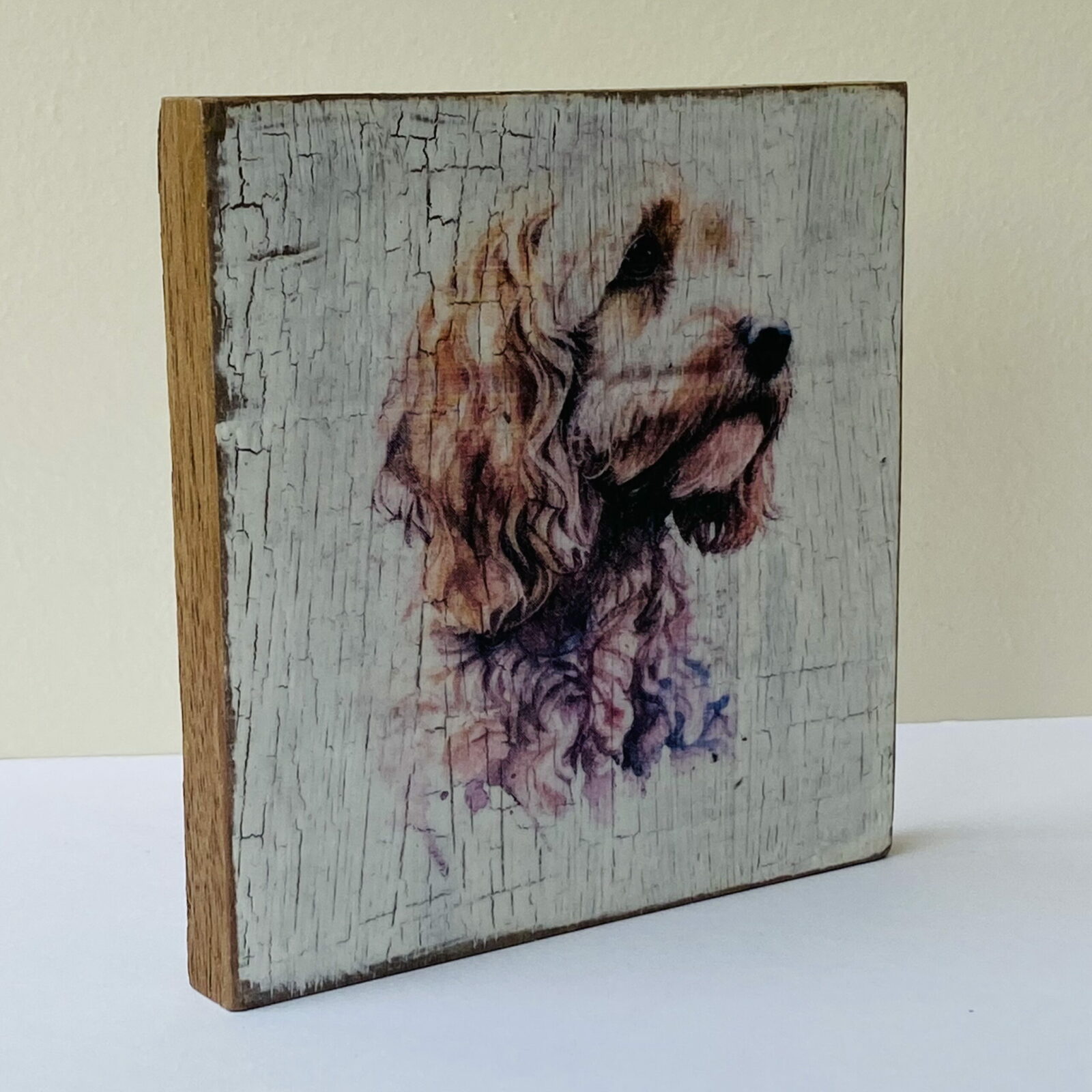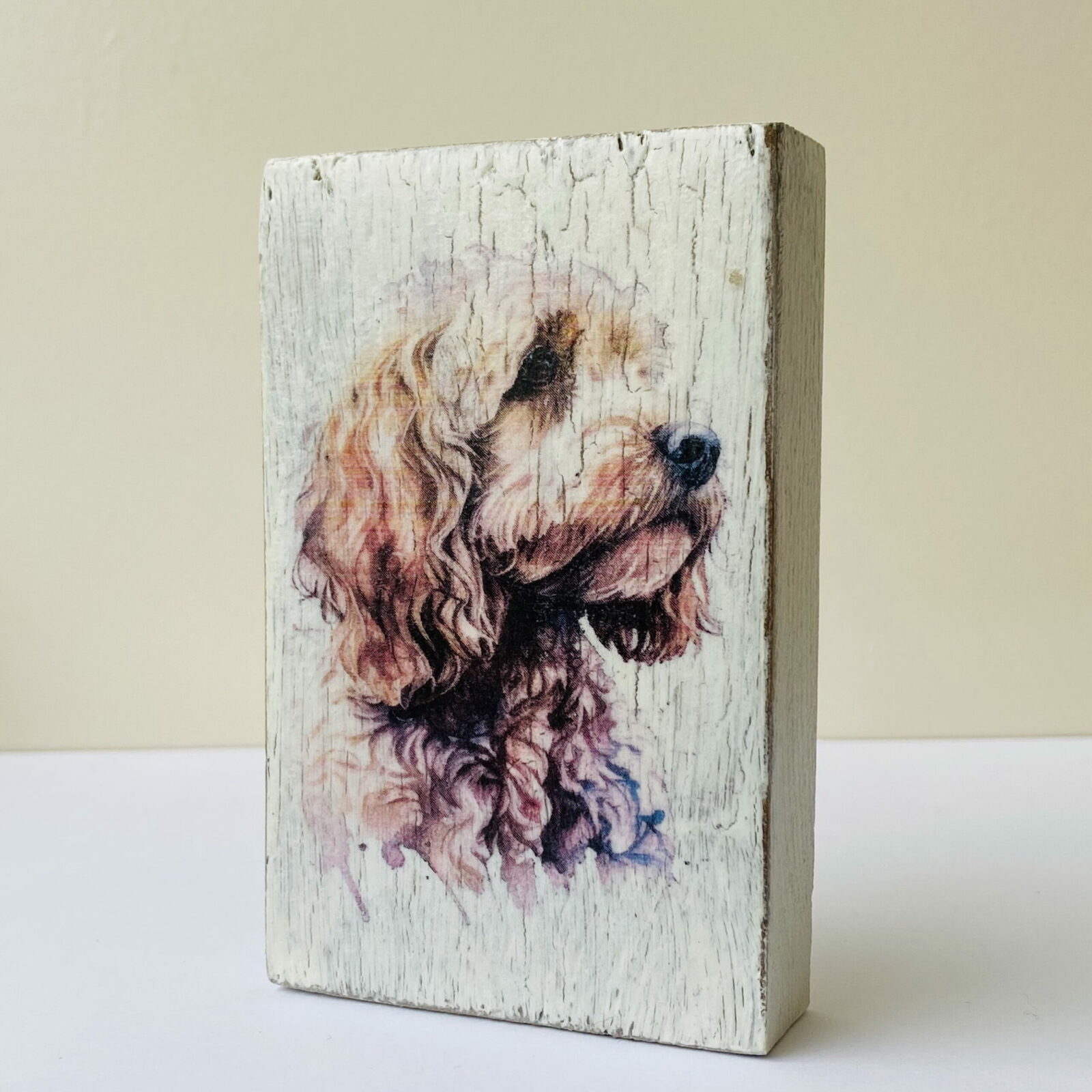 This is a beautiful hand made original design freestanding or hanging plaque. Made from recycled wood, the background has been painted and distressed, and the featured dog breed – a Cockapoo, has a hand painted water colour appearance.