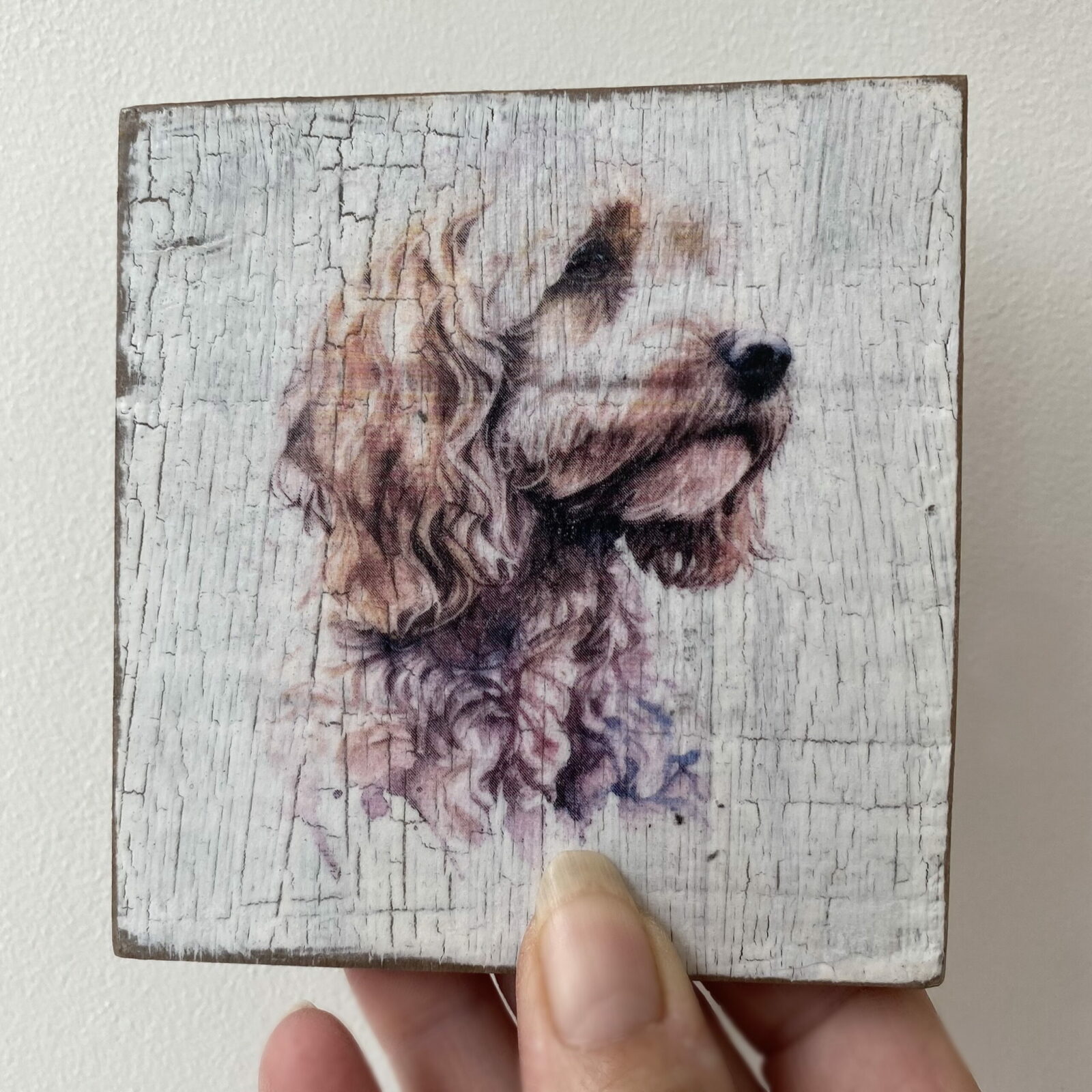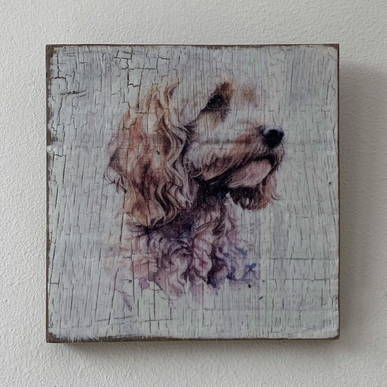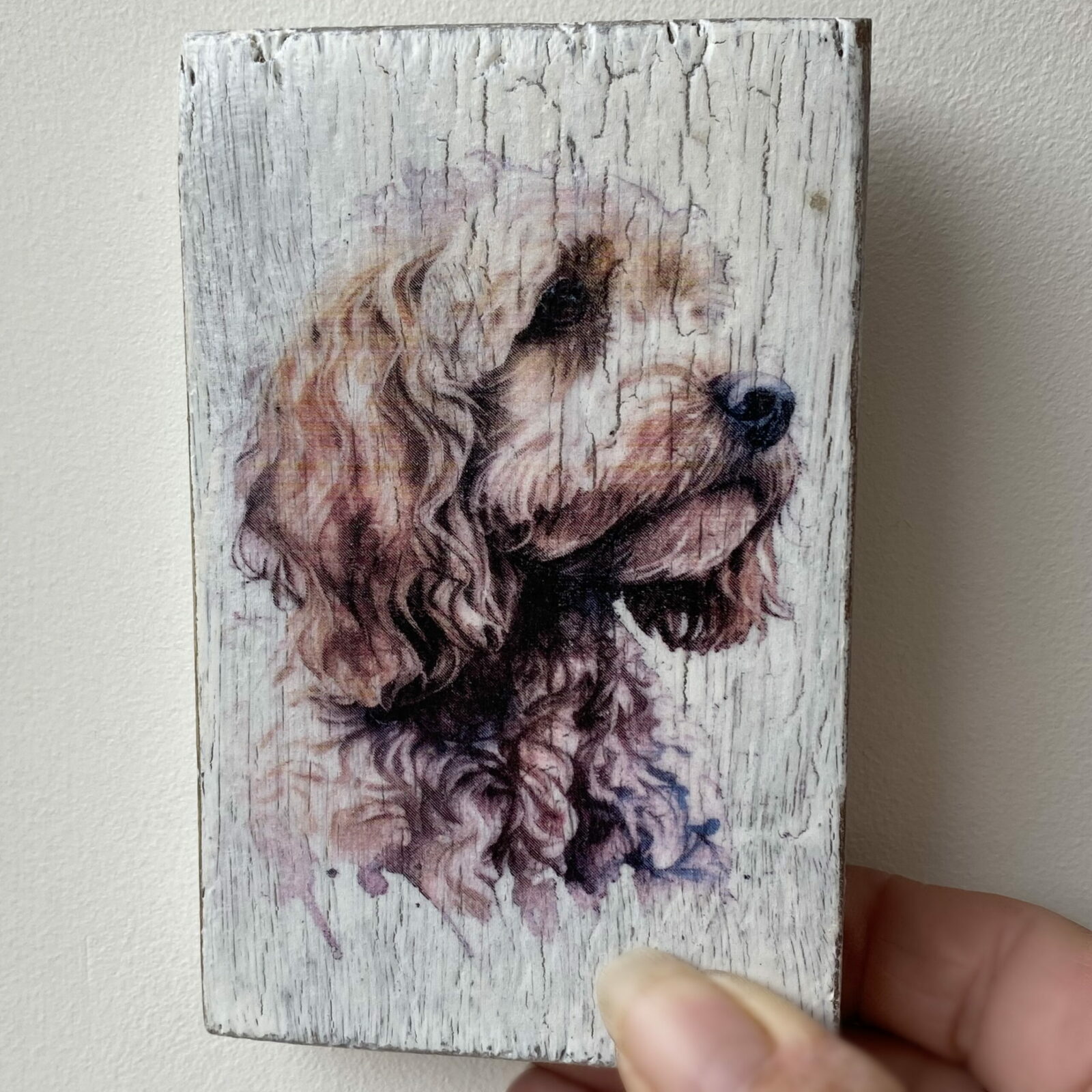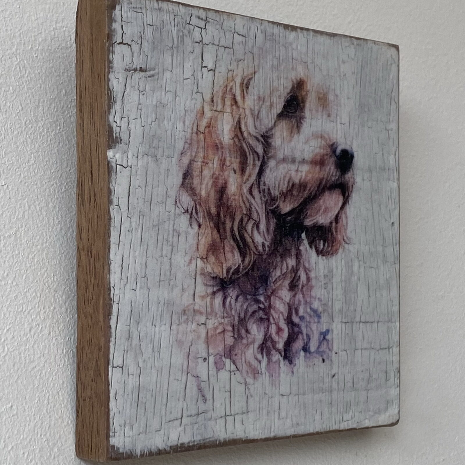 This is a beautiful hand made original design freestanding or hanging plaque. Made from recycled wood, the background has been painted and distressed, and the featured dog breed – a Cockapoo, has a hand painted water colour appearance.