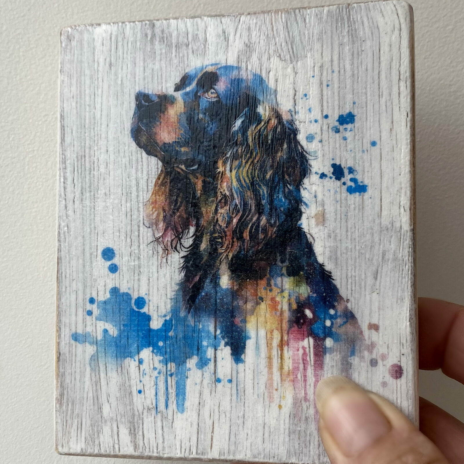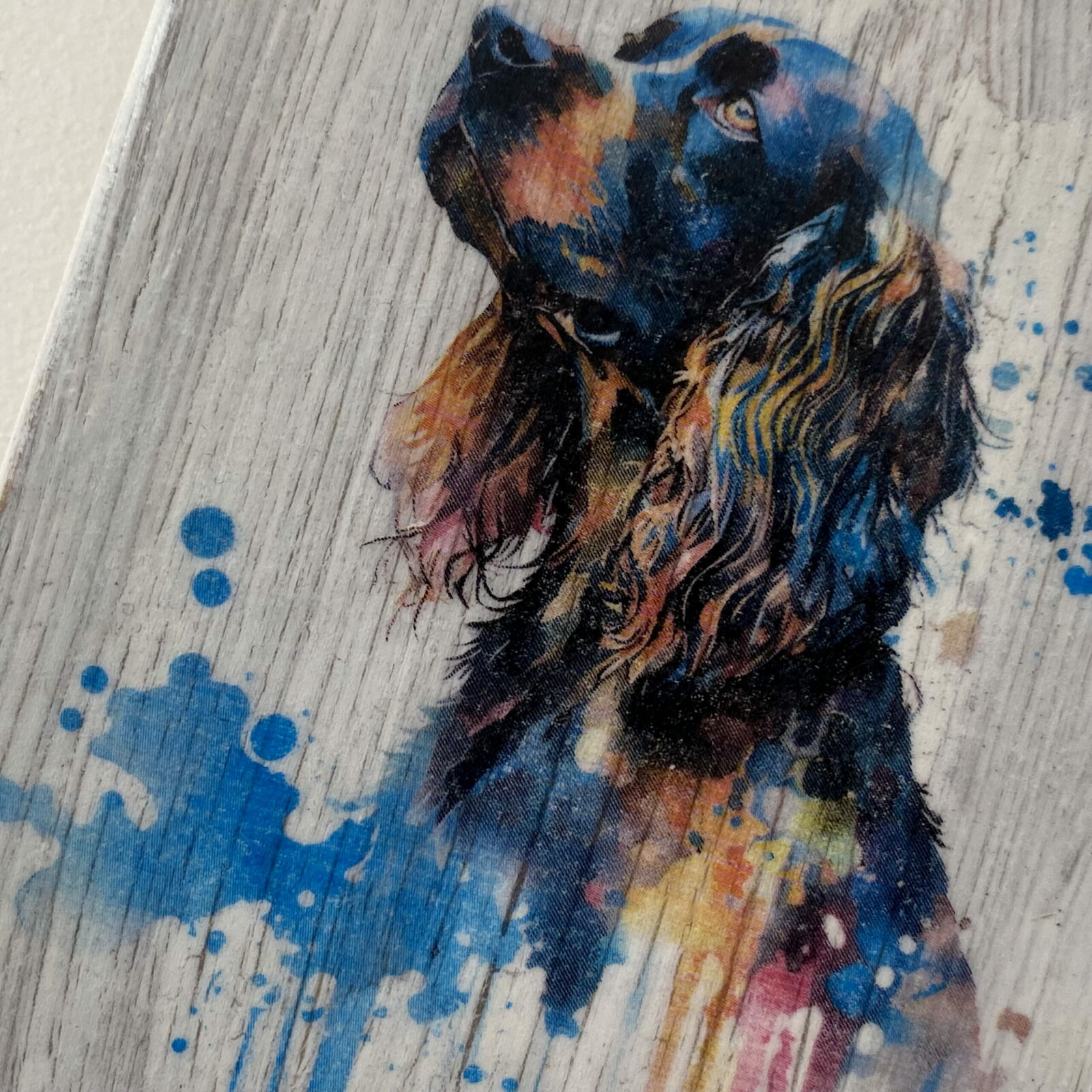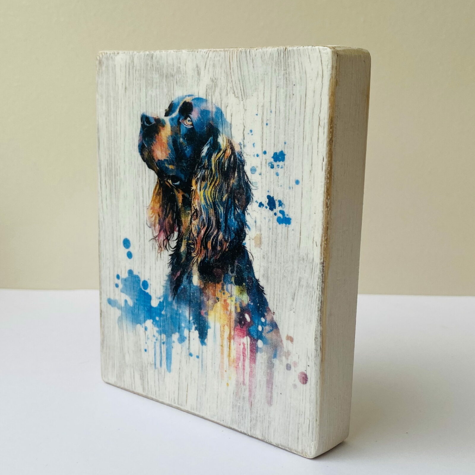 This is a beautiful hand made original design freestanding or hanging plaque. Made from recycled pine wood, the background has been painted and distressed, and the featured dog breed – a Cocker Spaniel, has a hand painted water colour appearance.
