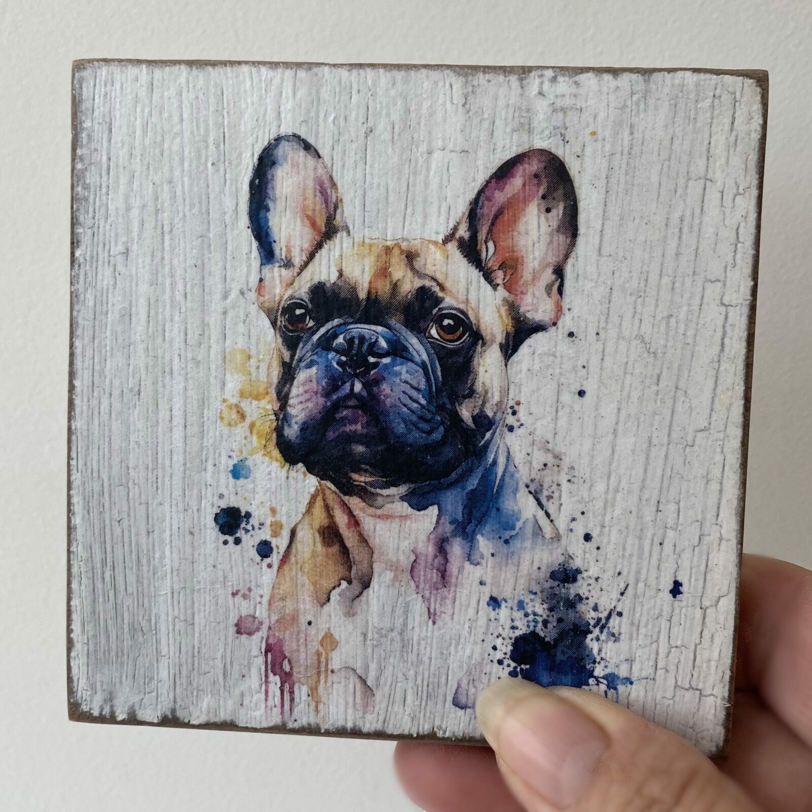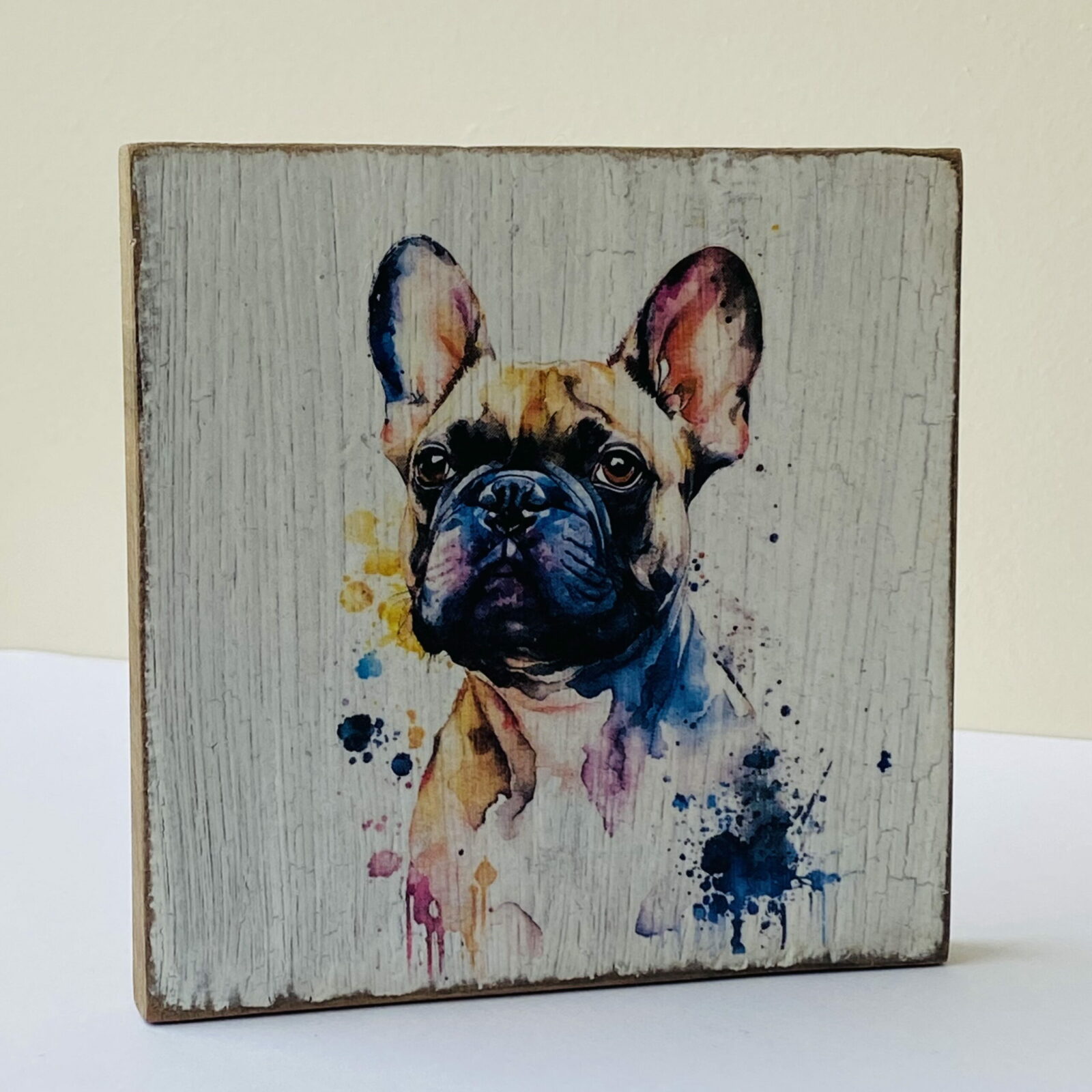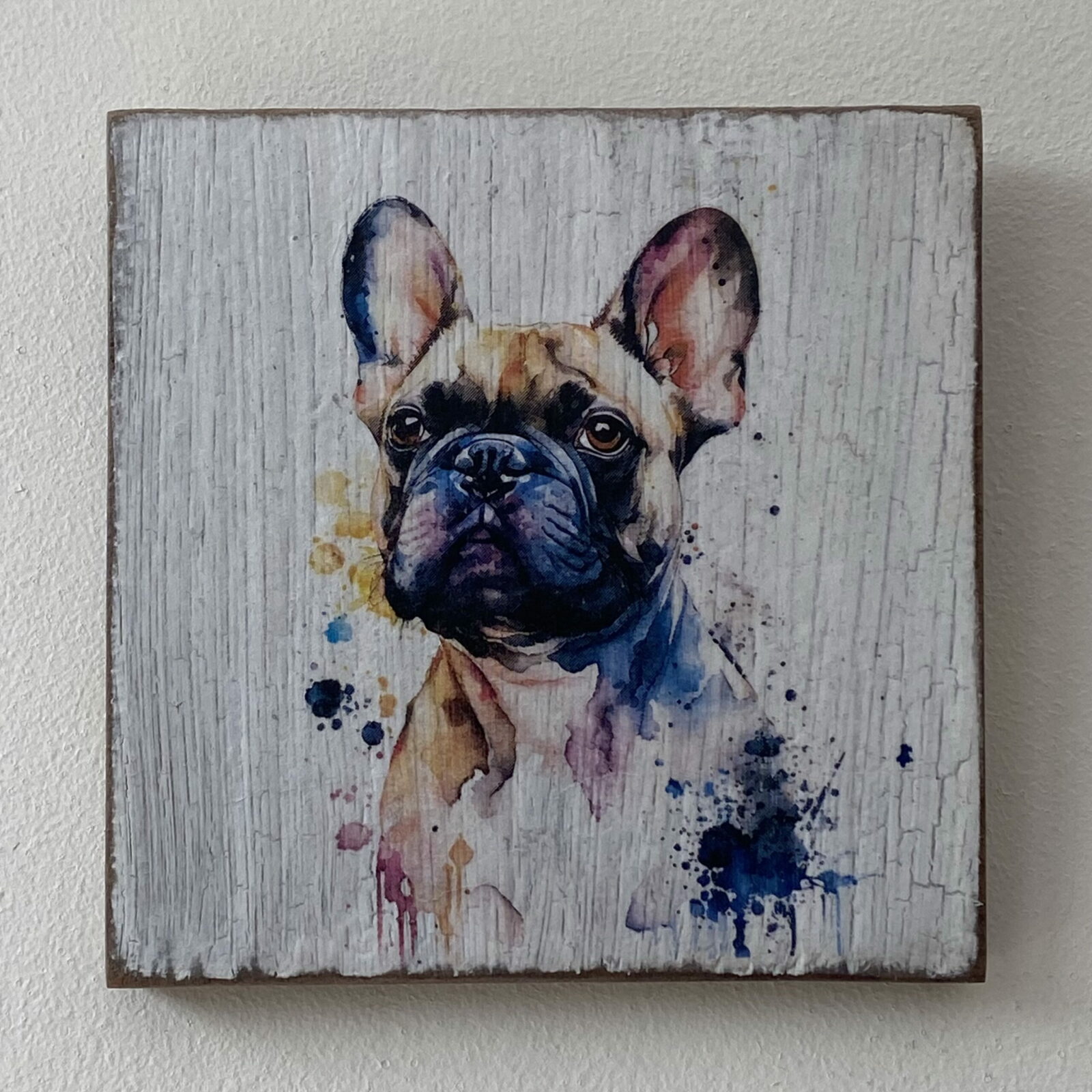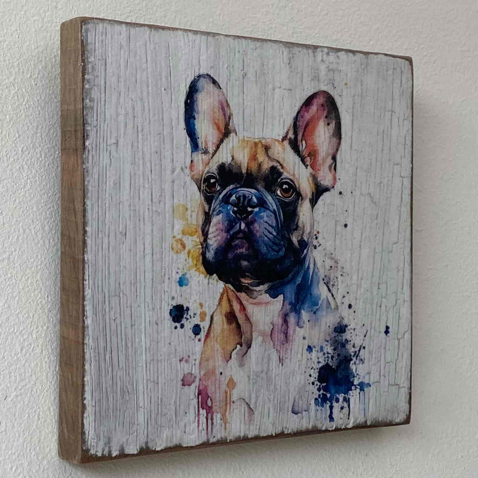 This is a beautiful hand made original design freestanding or hanging plaque. Made from recycled wood, the background has been painted and distressed, and the featured dog breed – a French Bulldog, has a hand painted water colour appearance.