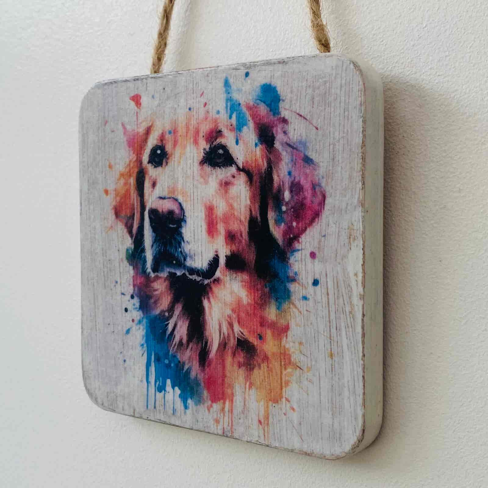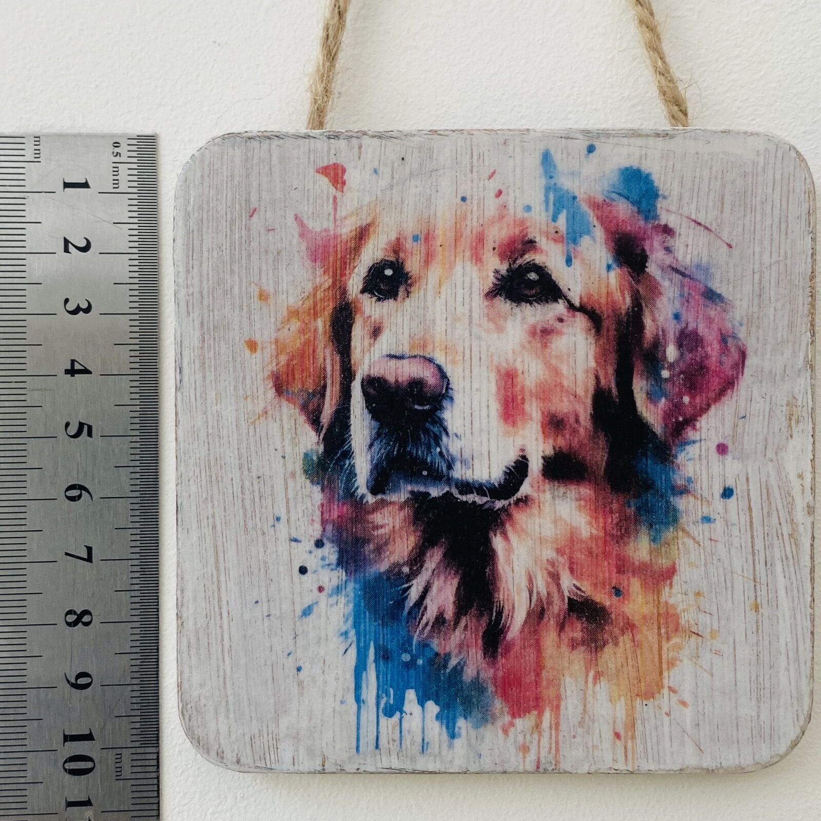 This is a beautiful hand made original design hanging plaque. Made from recycled plaques, the background has been painted and distressed, and the featured dog breed – a Golden Retriever, has a colourful hand painted water colour appearance.