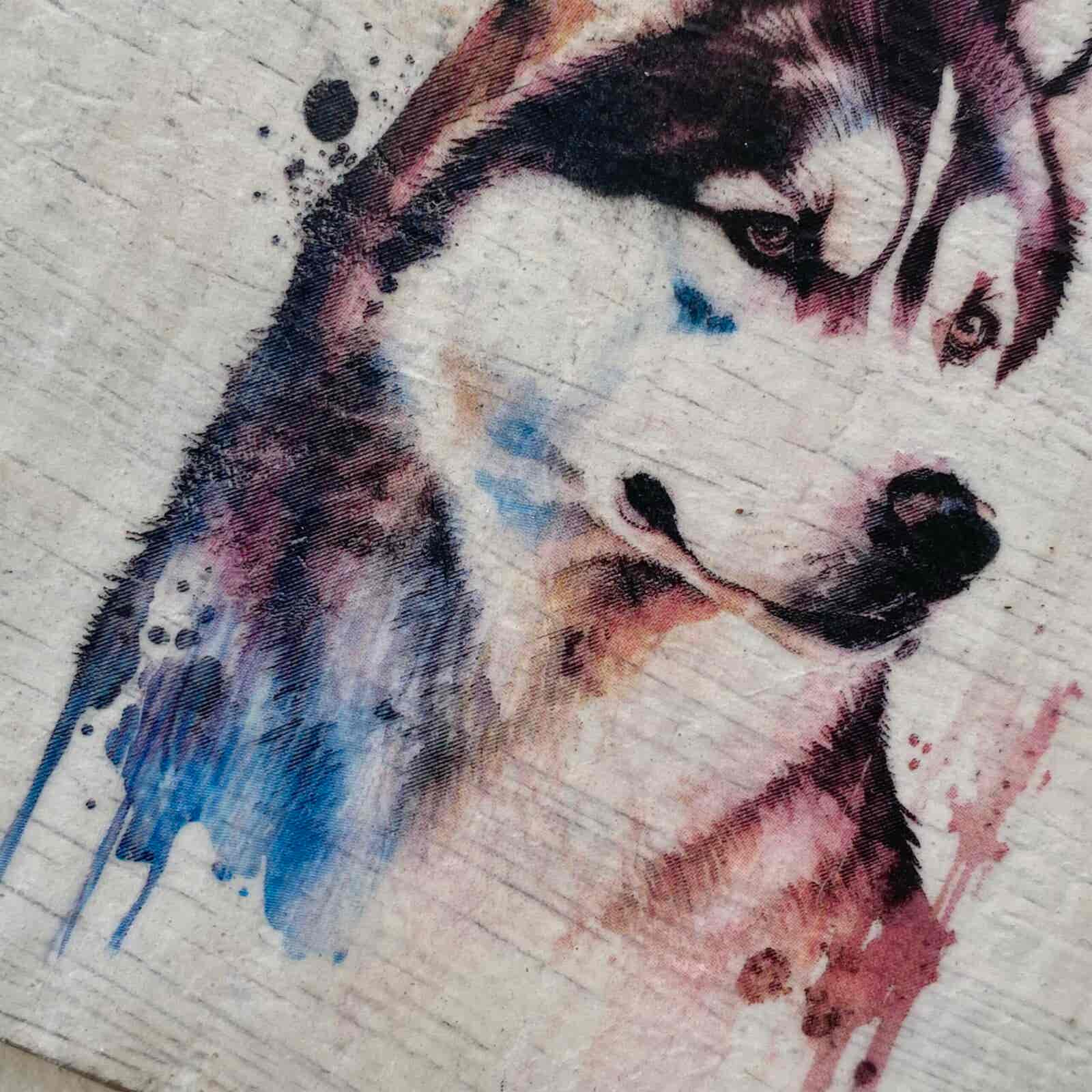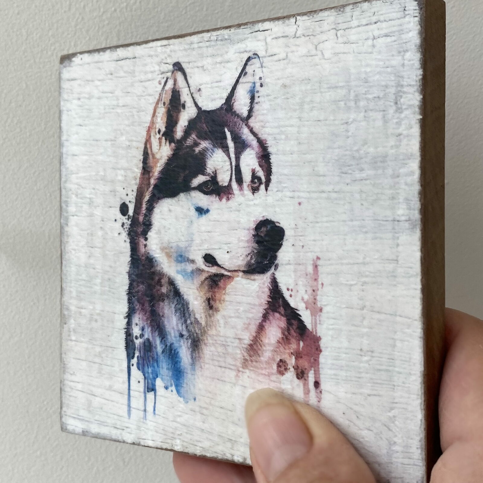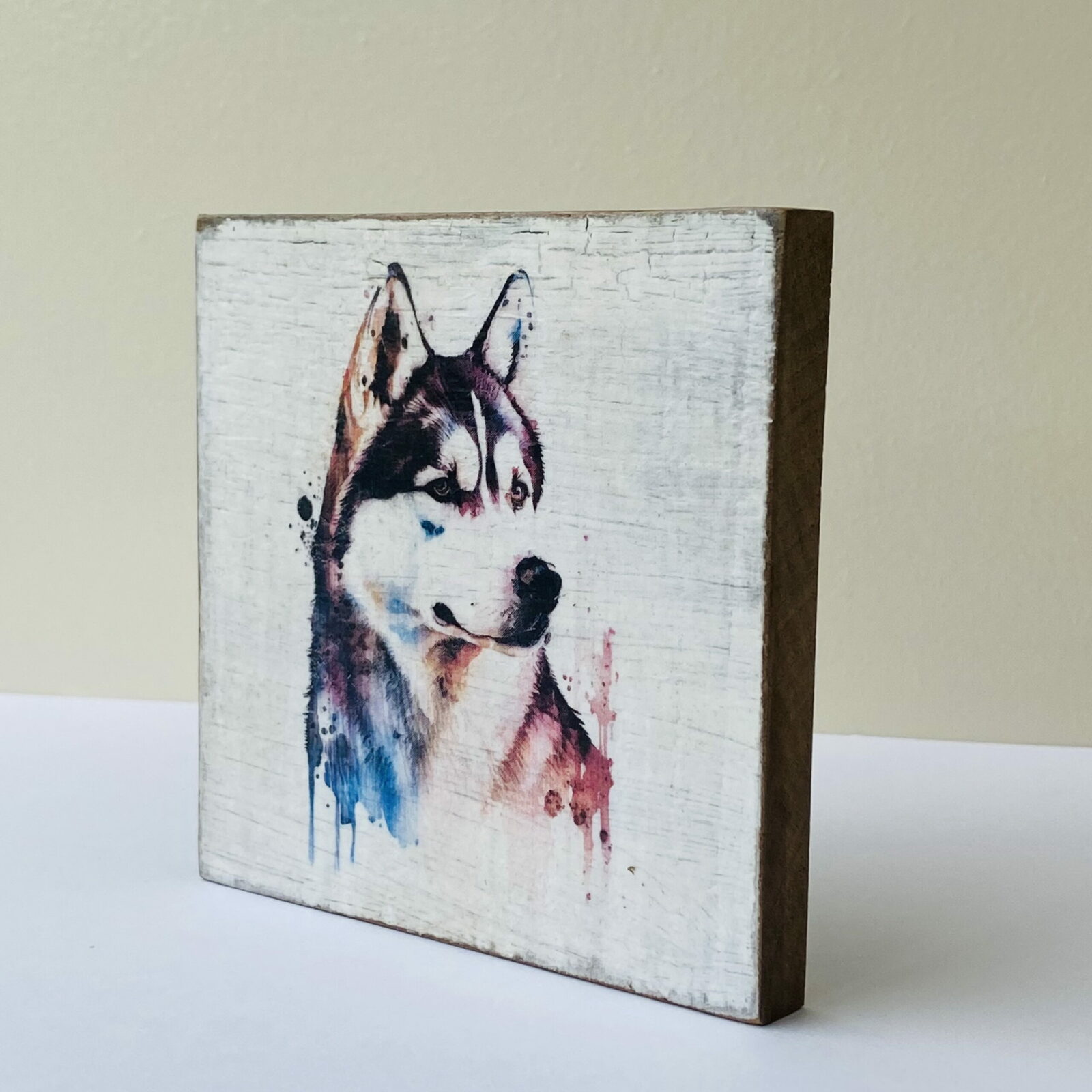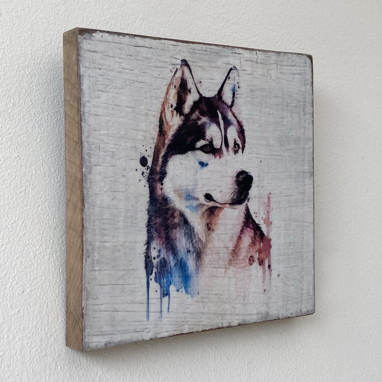 This is a beautiful hand made original design freestanding or hanging plaque. Made from recycled wood, the background has been painted and distressed, and the featured dog breed – a Husky, has a hand painted water colour appearance.