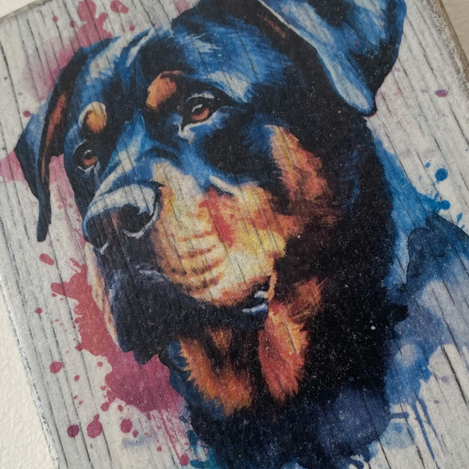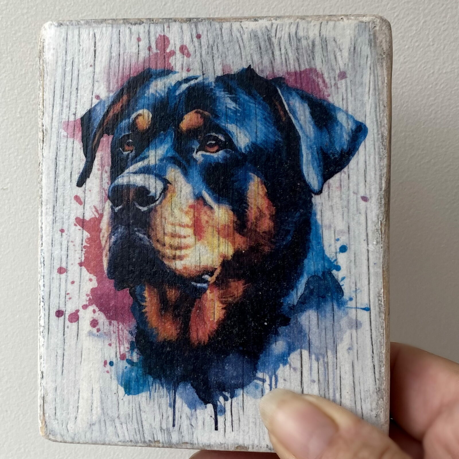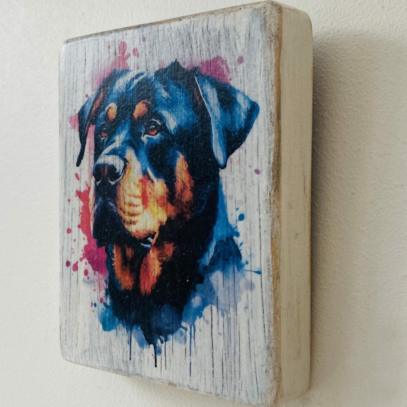 This is a beautiful hand made original design freestanding or hanging plaque. Made from recycled pine wood, the background has been painted and distressed, and the featured dog breed – a Rottweiler, has a hand painted water colour appearance.